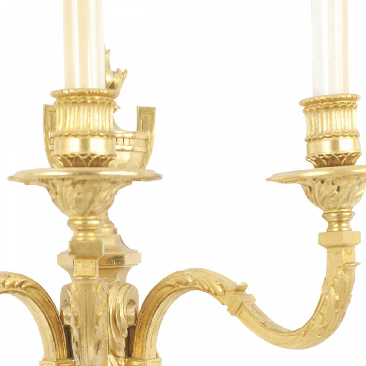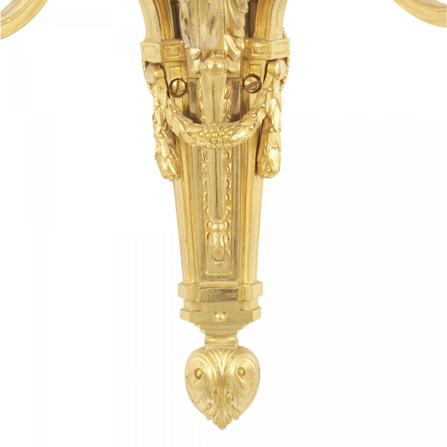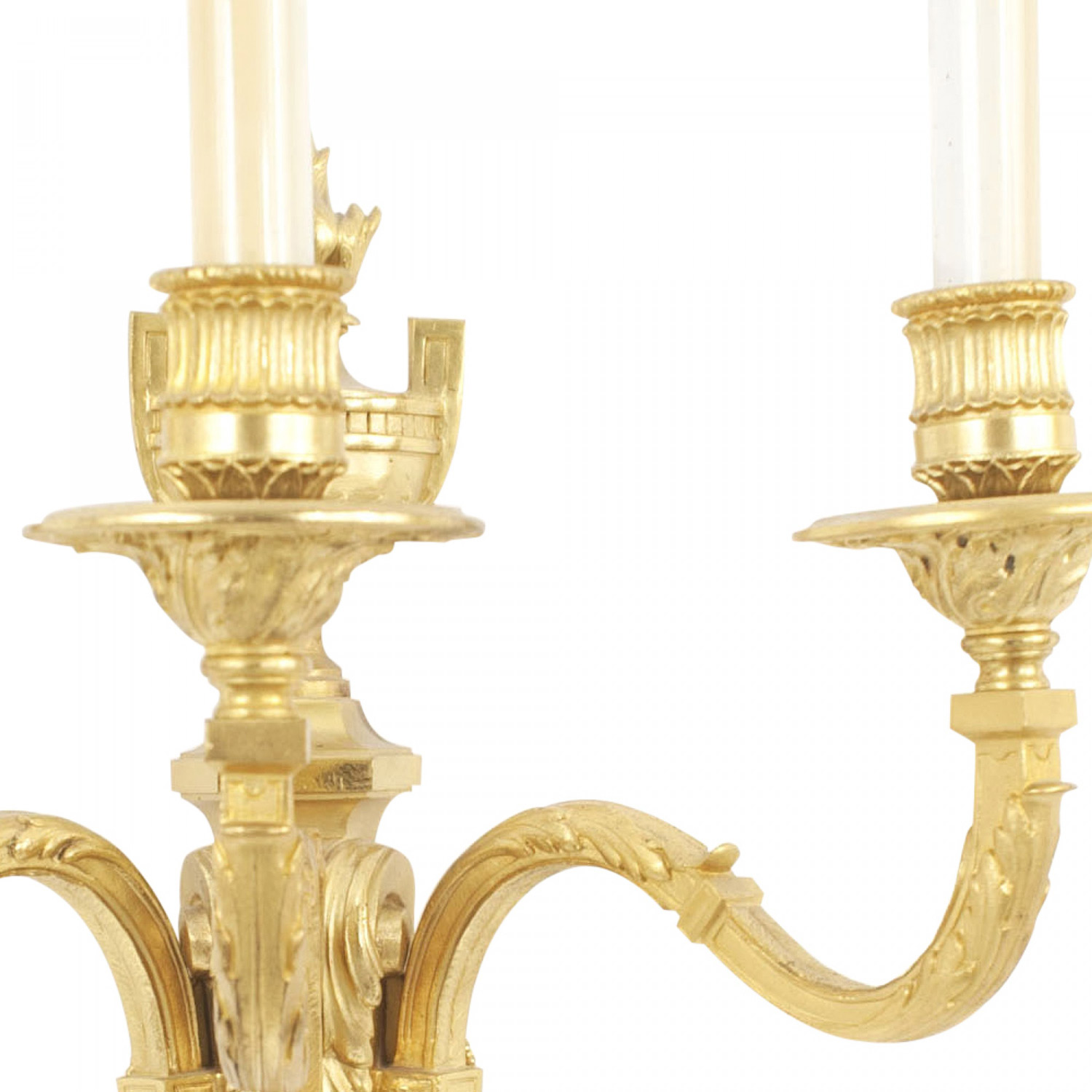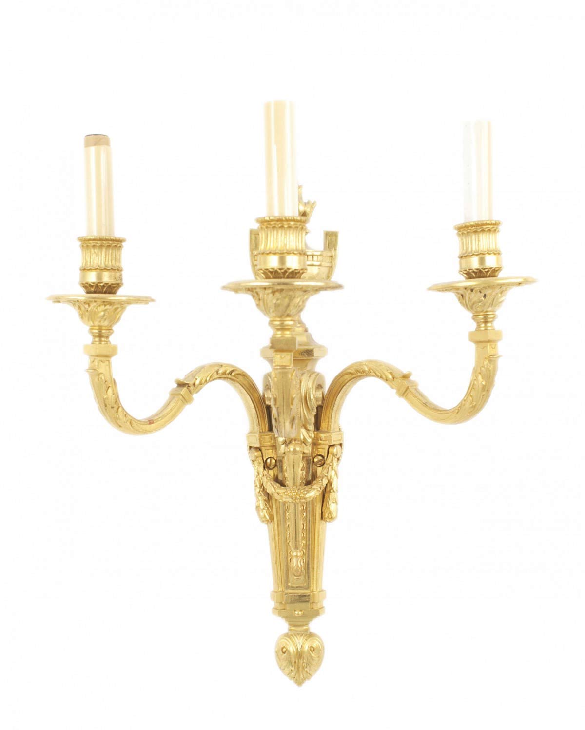 2 French Louis XVI style (19th Century) gilt wall sconces with three arms, urn and flame design tops, and swag centers (PRICED EACH)
