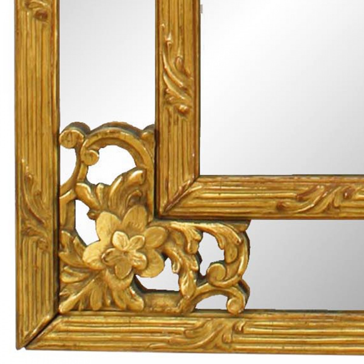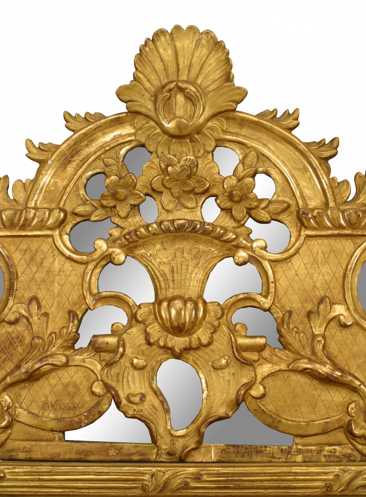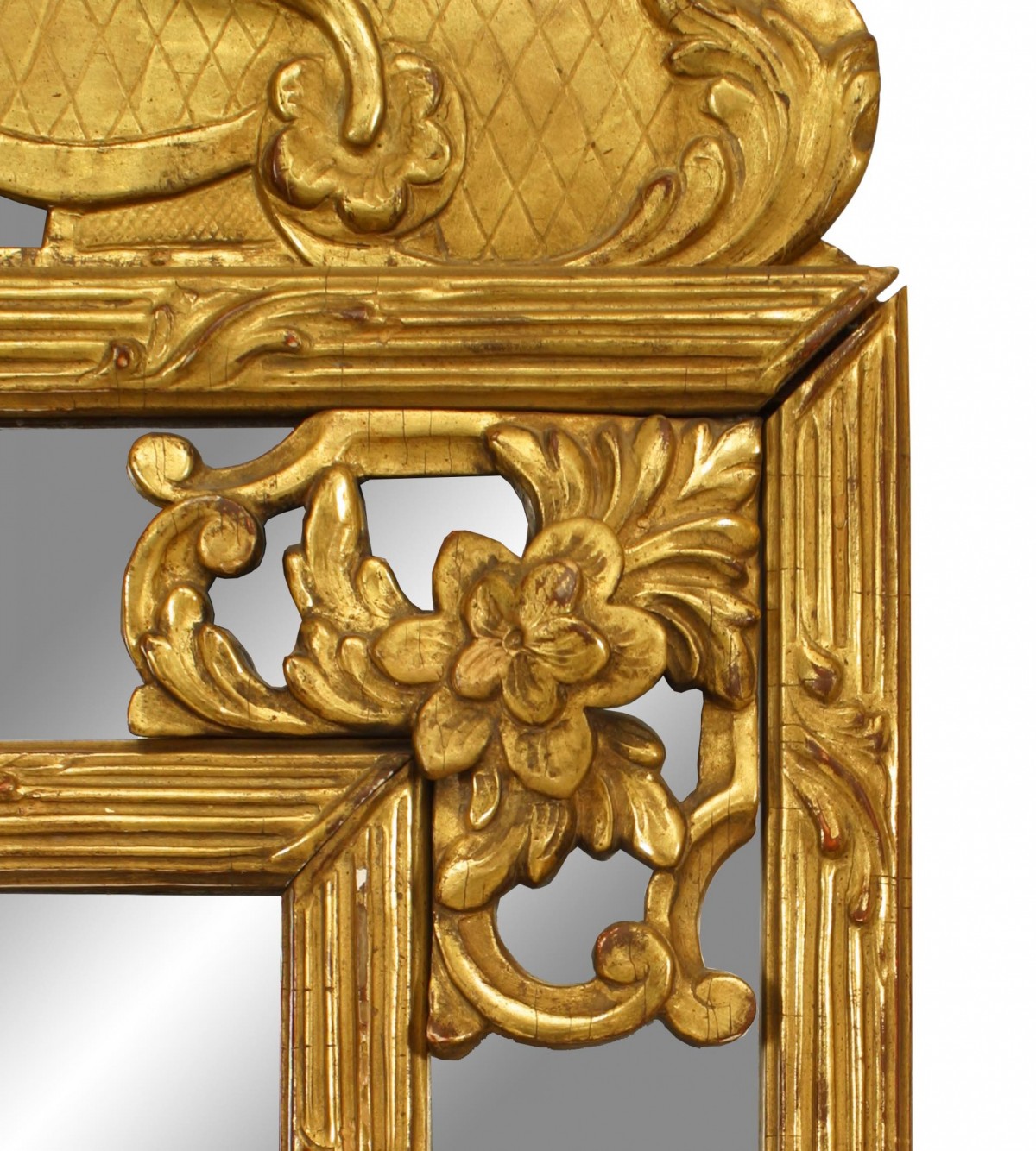 French Louis XVI-style (19th Century) rectangular giltwood wall mirror with a mirrored border and an added (18th Century) pediment top with a carved shell form relief.