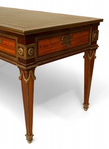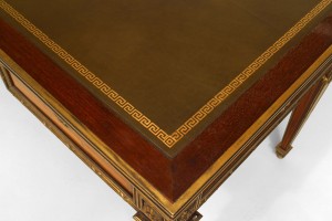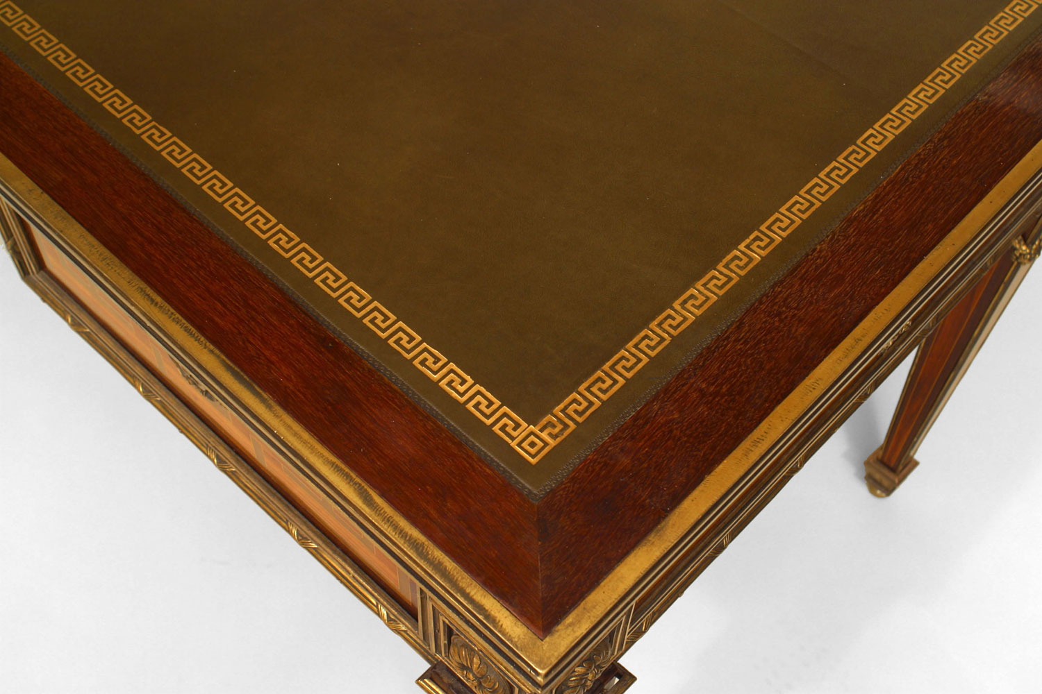 French Louis XVI style (English-19th Century) mahogany table desk with 3 drawers and various inlaid woods with bronze trim & swags on legs with a leather top (WROTHAM PARK)
