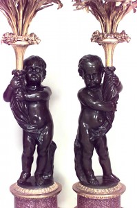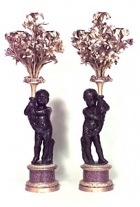PAIR of French Louis XVI-style (19th Century) bronze candelabras with cupids on gilt and porphyry bases with floral design. (PRICED AS PAIR)
