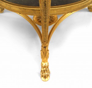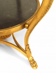 French Louis XVI-style (19/20th Century) bronze dore ram head design round end table with 3 legs supporting an inset black marble top and shelf with a bottom stretcher.