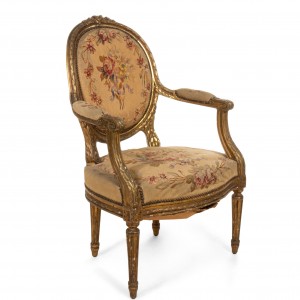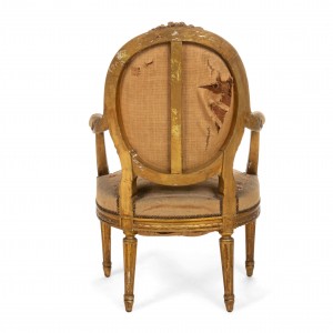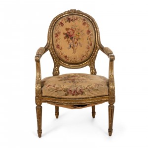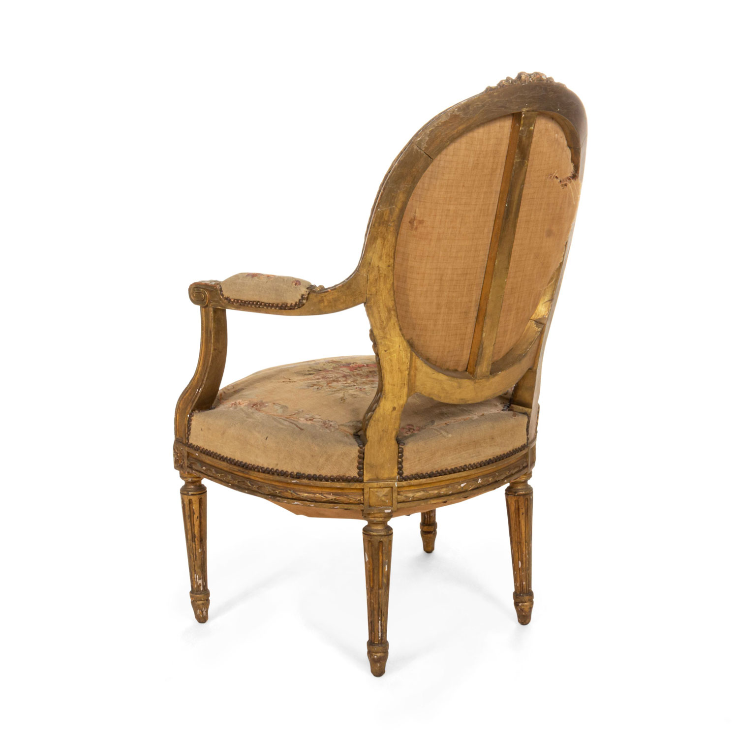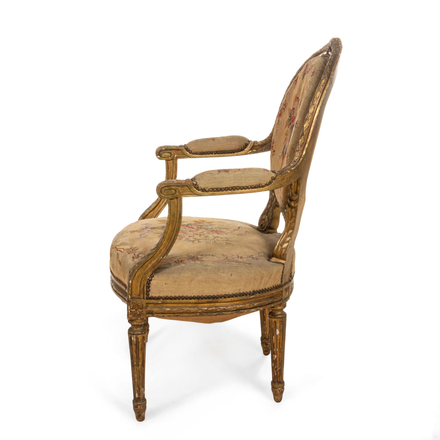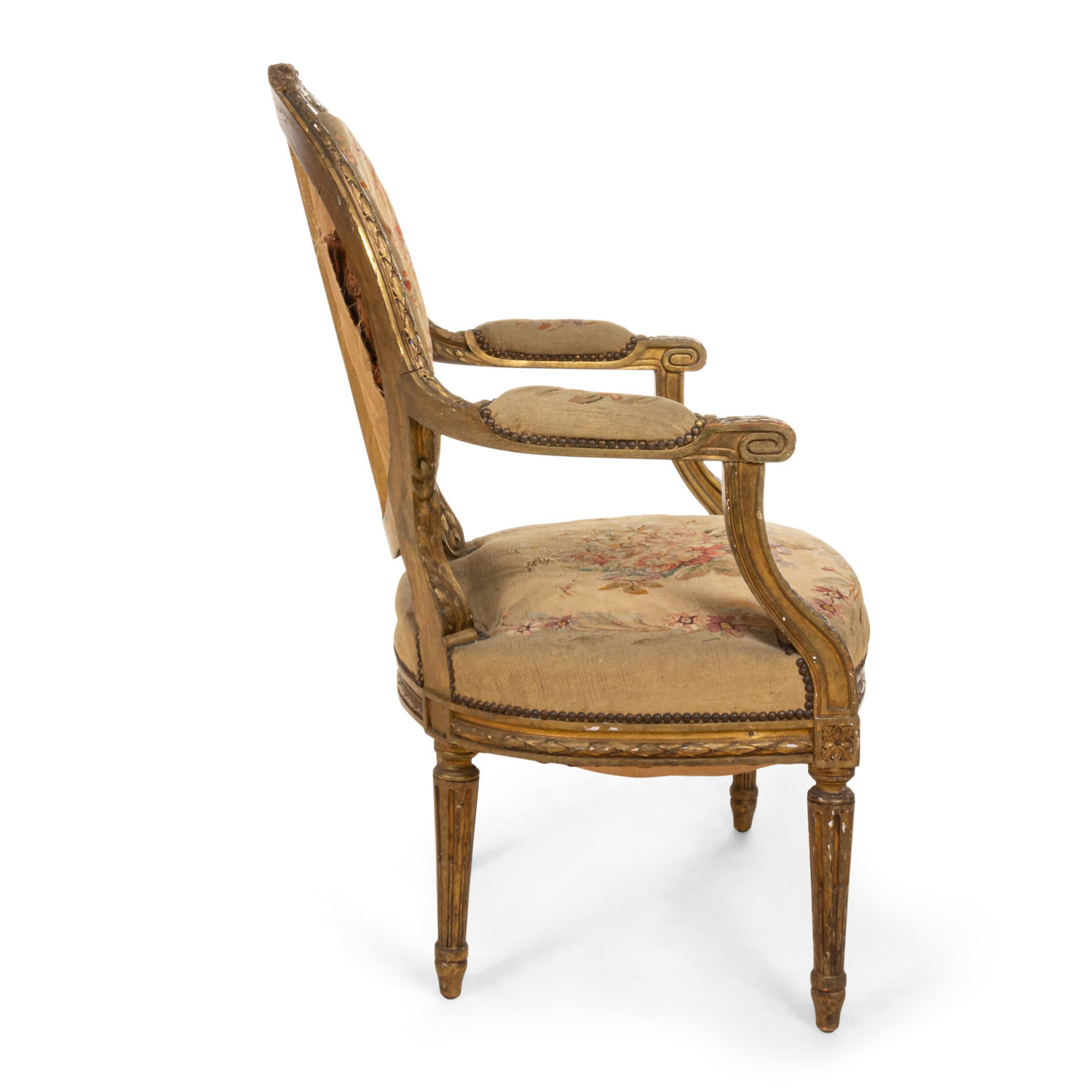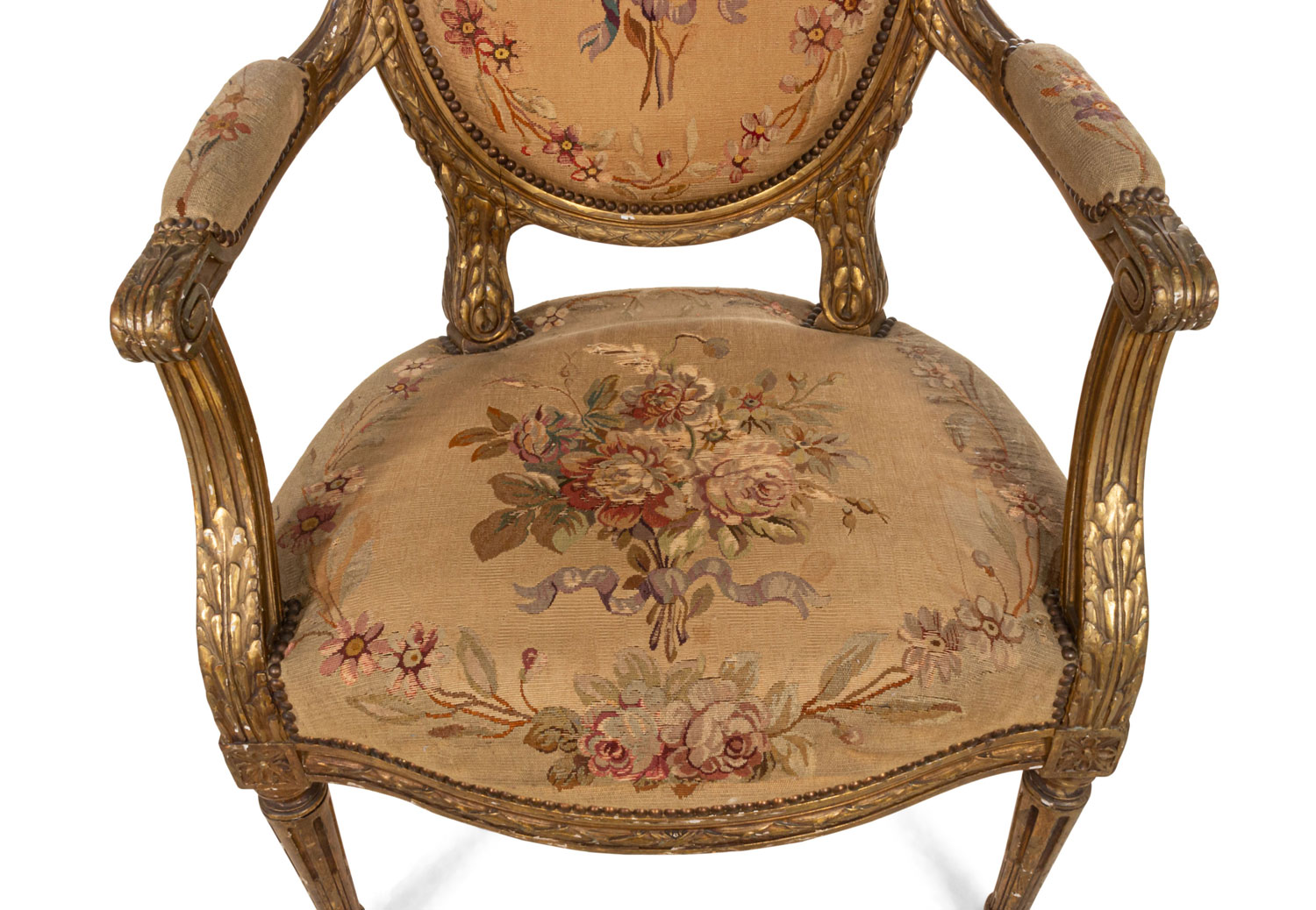 4 French Louis XVI style (19th Cent) gilt oval back Aubusson upholstered armchairs (PRICED EACH) (SEE ALSO: matching loveseat: 036907A)