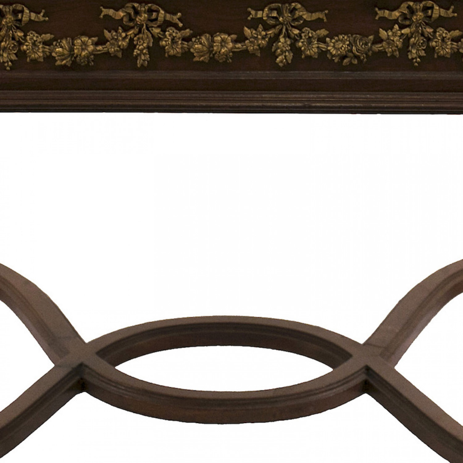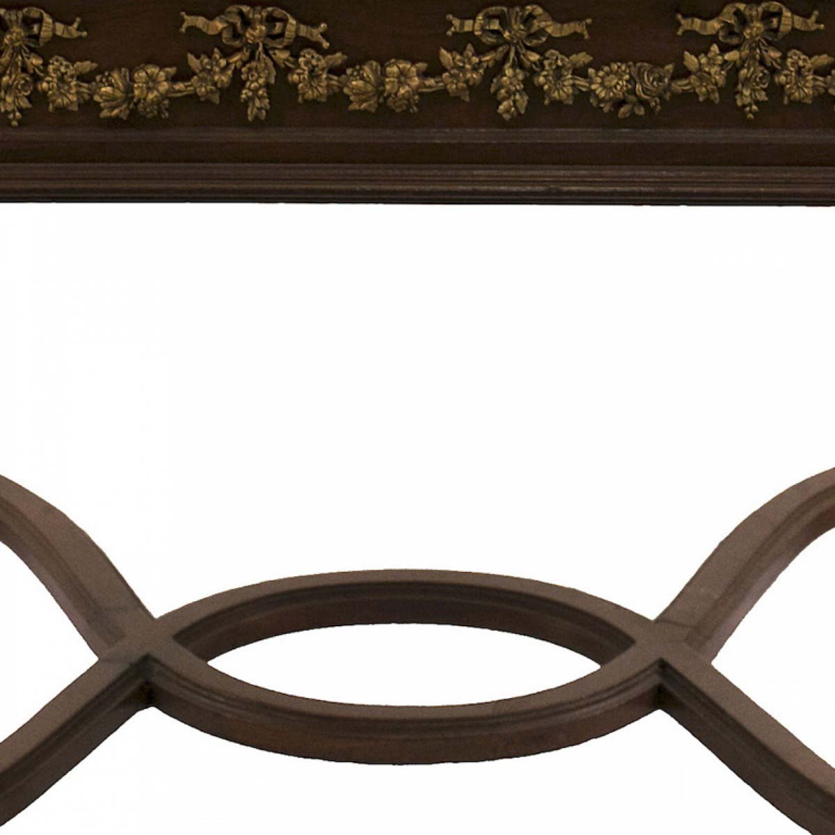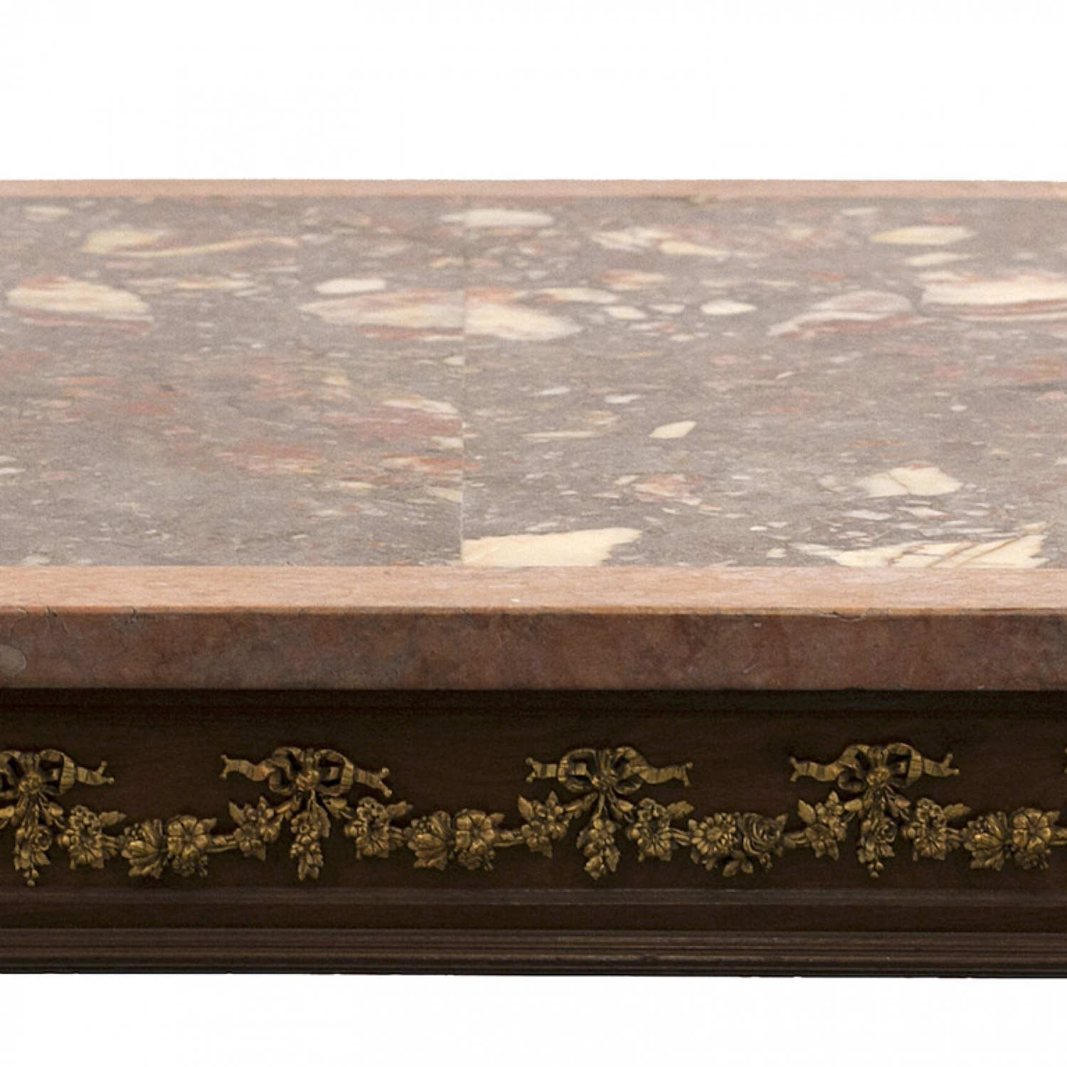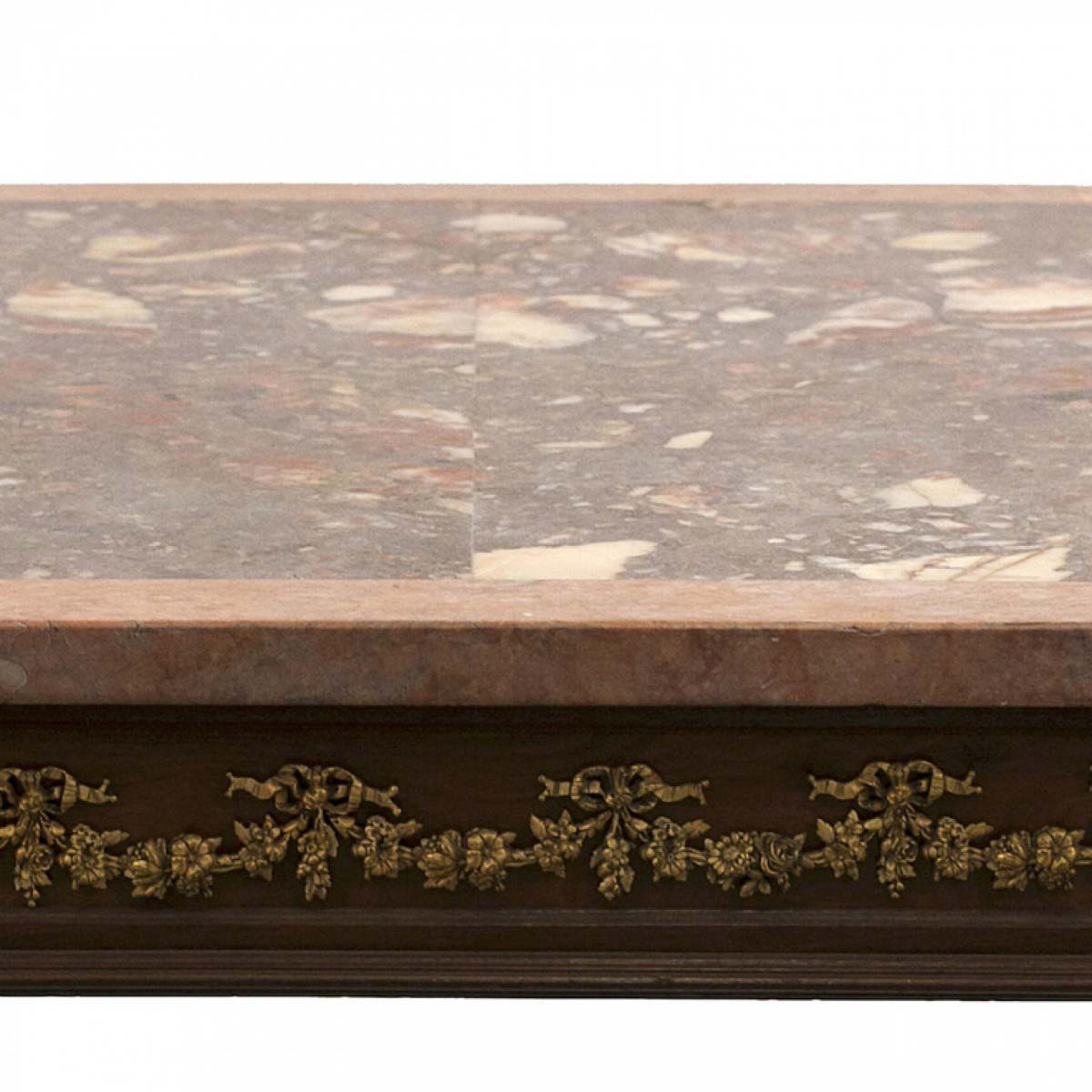 French Louis XVI-style (19/20th Century) square walnut coffee table with bronze trimmed apron, stretcher, and mottled pink marble top.
