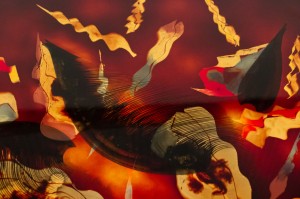 French Mid-Century low round top coffee table with a black and red geometric stylized leaf design top and four black metal legs with gilt bronze sabots (signed: BERNARD DUNAND)