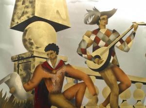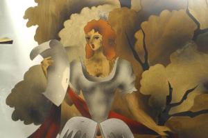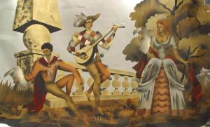 French Mid-Century (1940s) oak framed horizontal wall mirror with reverse glass painted Neoclassic scenes.