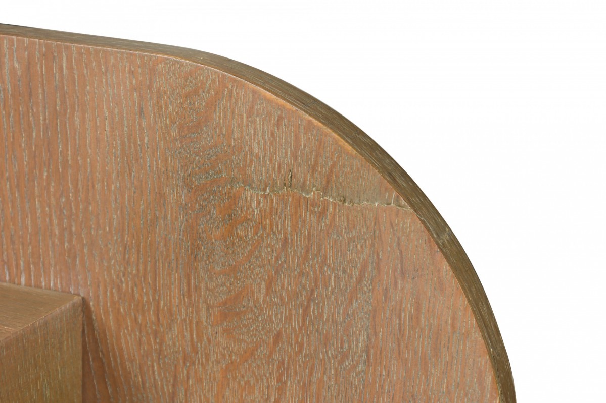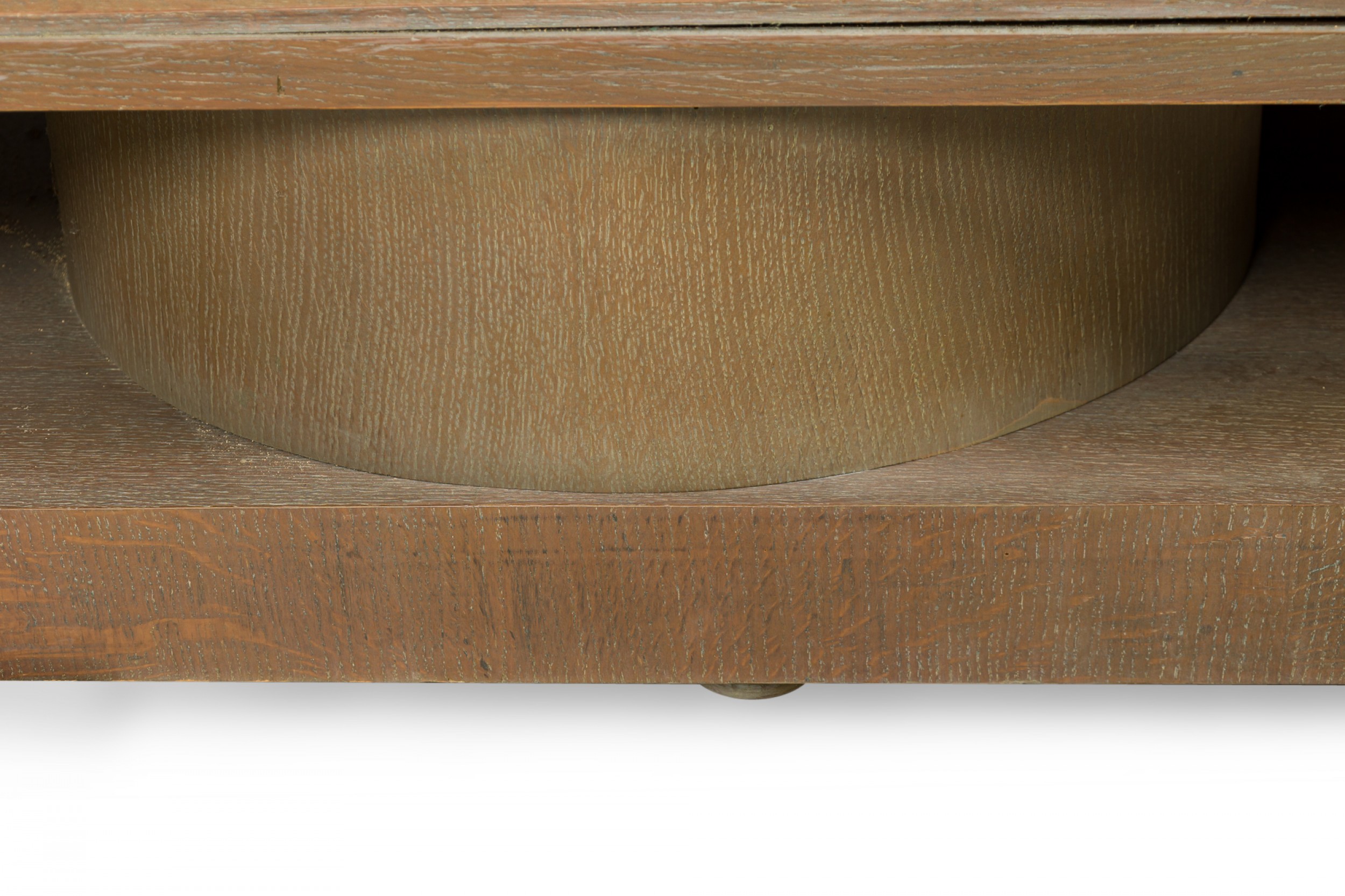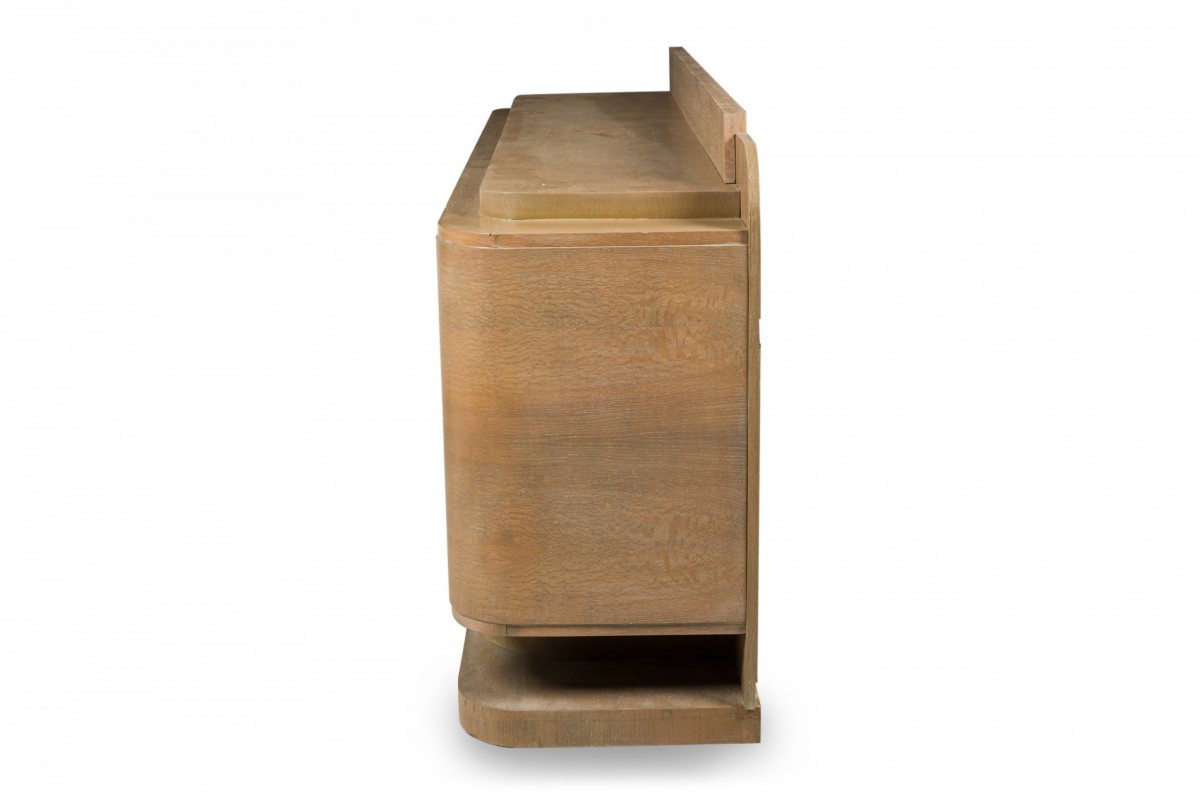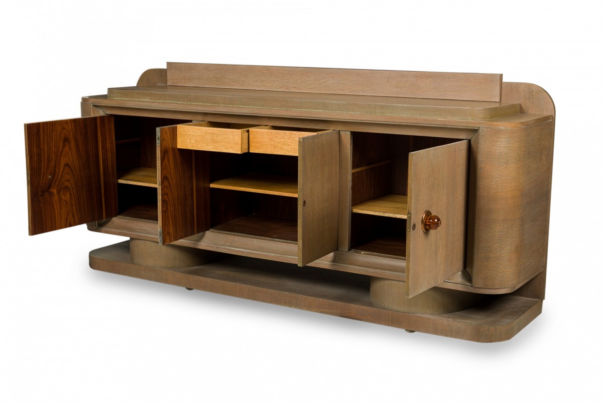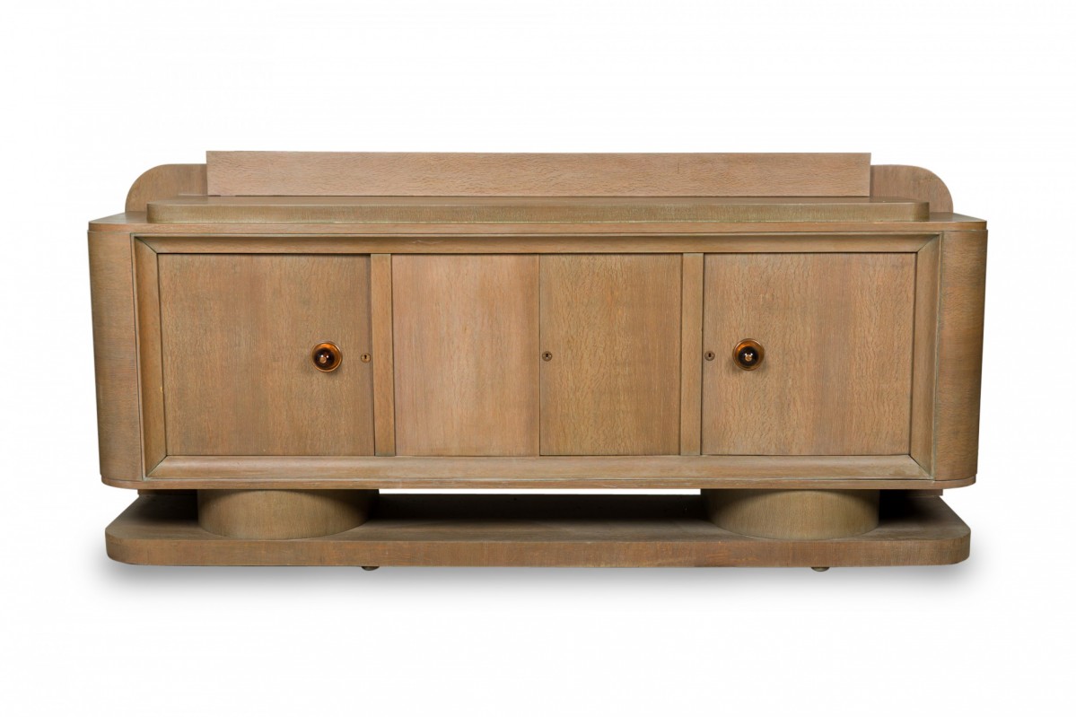 French Mid-Century limed oak sideboard with two exterior single door cabinets with large amber glass door pulls which open to reveal a two compartment interior centering a two-door cabinet compartment which opens to reveal two lower compartments and two upper drawers, resting on two large cylindrical supports on a wide platform base.