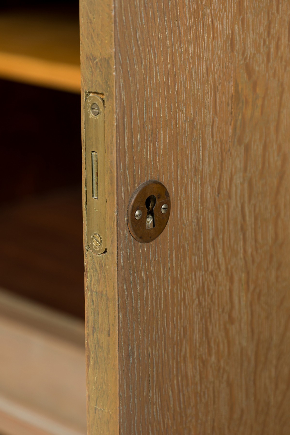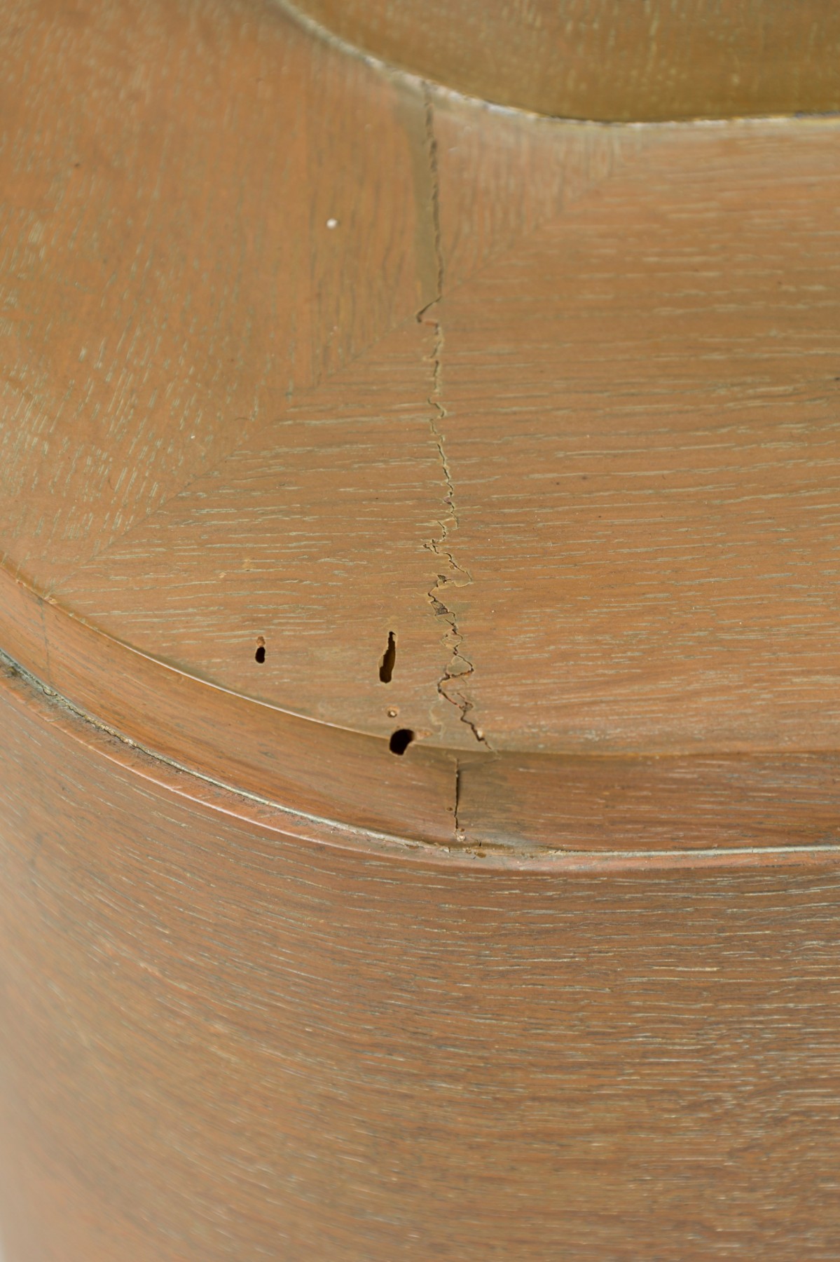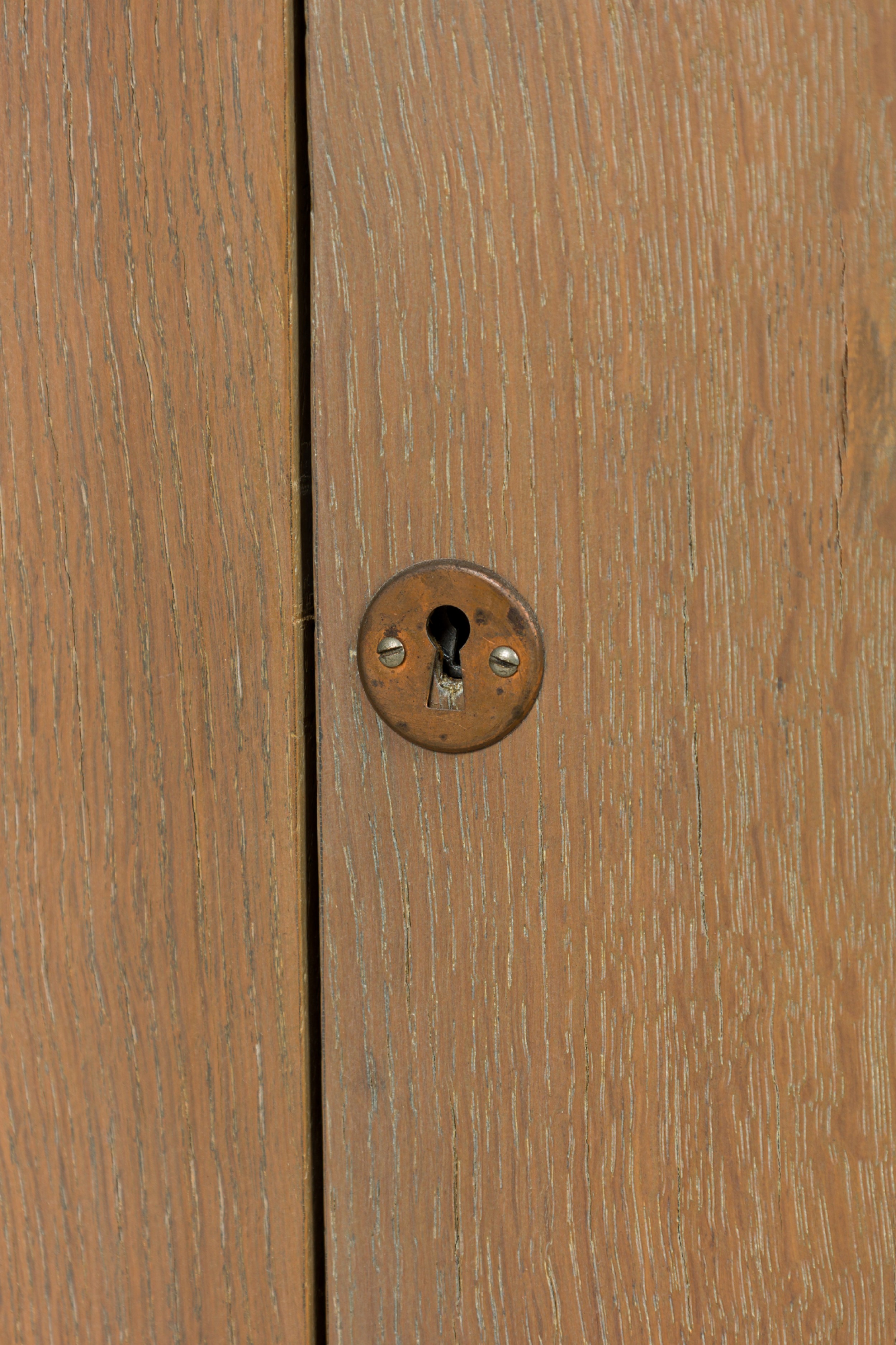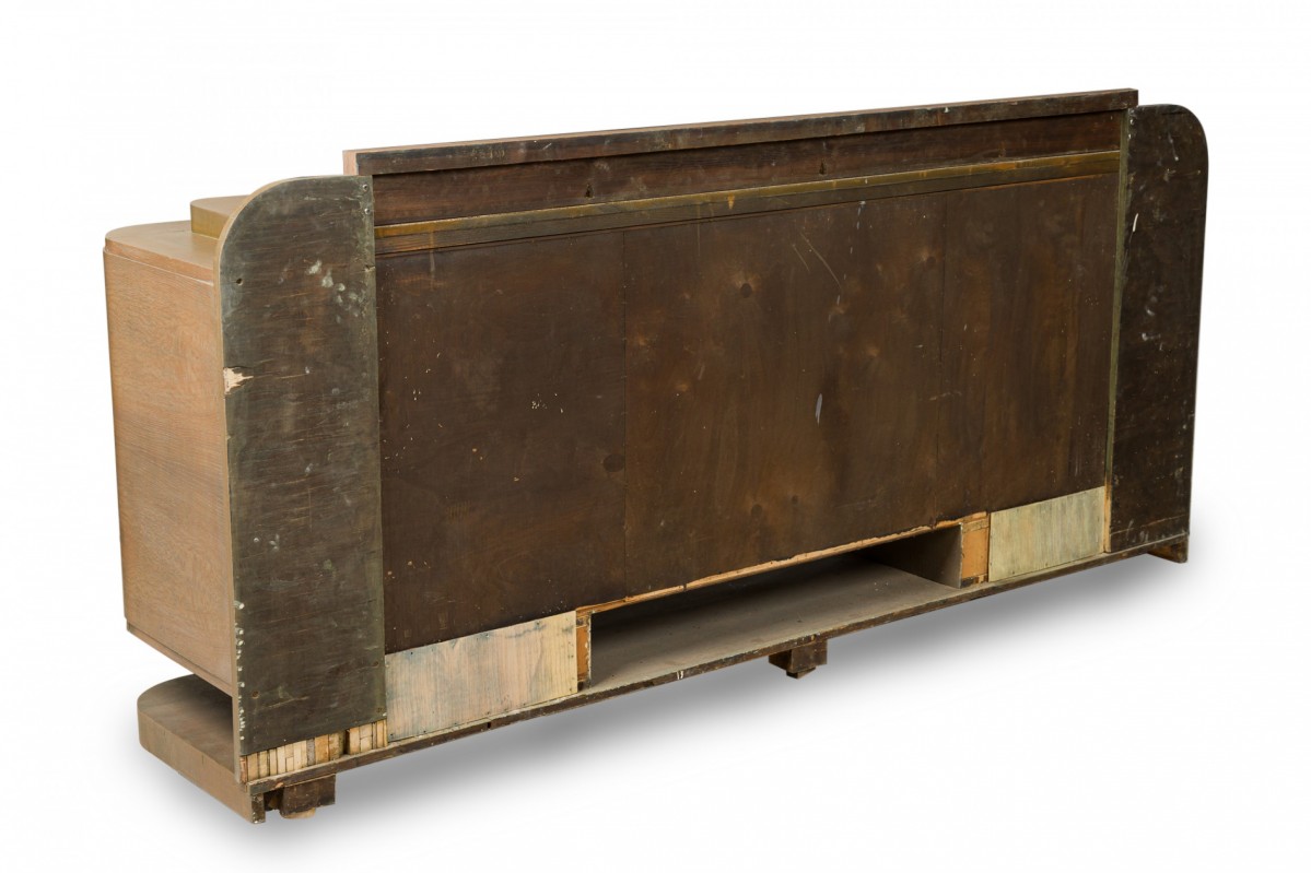 French Mid-Century limed oak sideboard with two exterior single door cabinets with large amber glass door pulls which open to reveal a two compartment interior centering a two-door cabinet compartment which opens to reveal two lower compartments and two upper drawers, resting on two large cylindrical supports on a wide platform base.