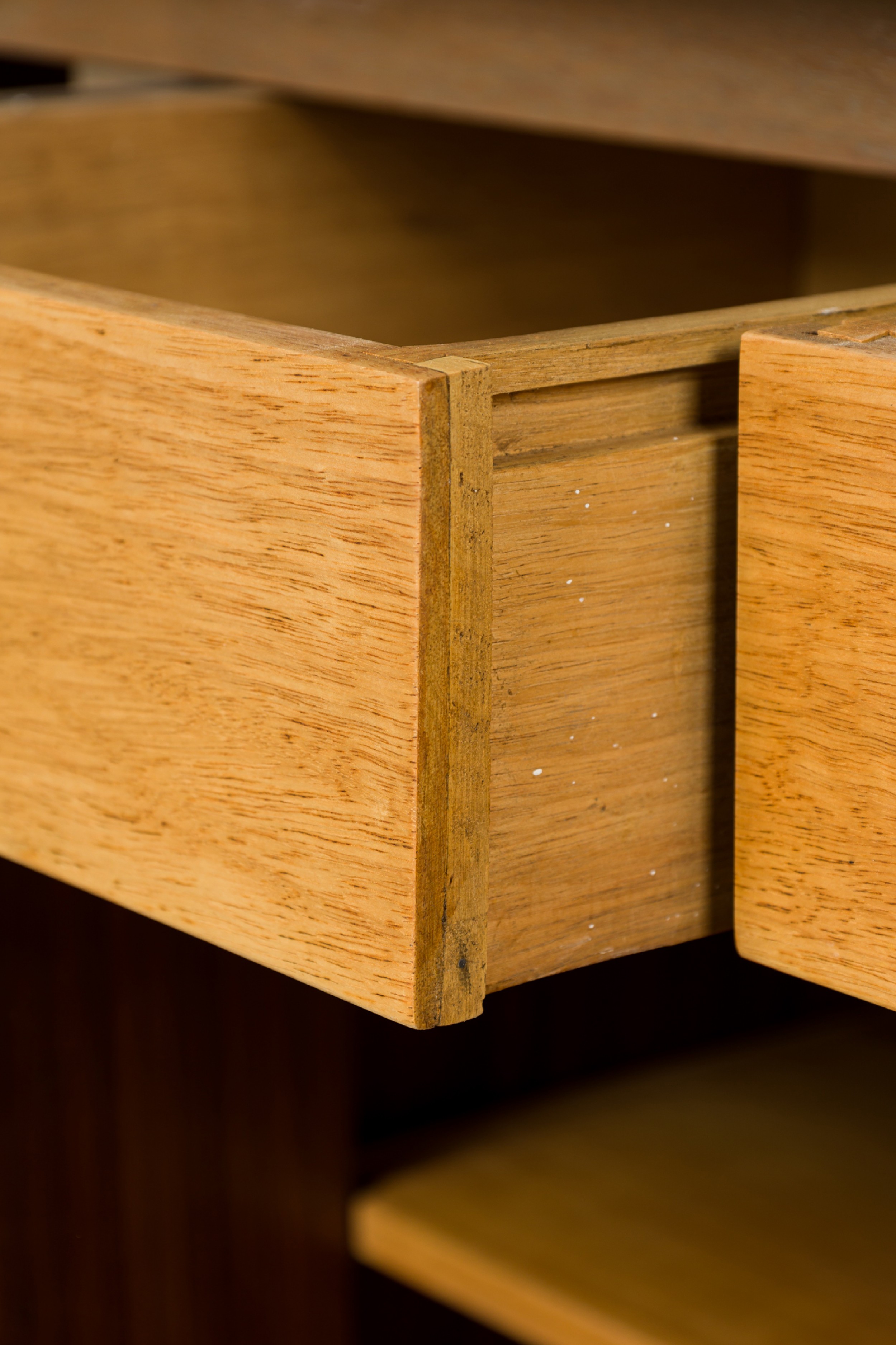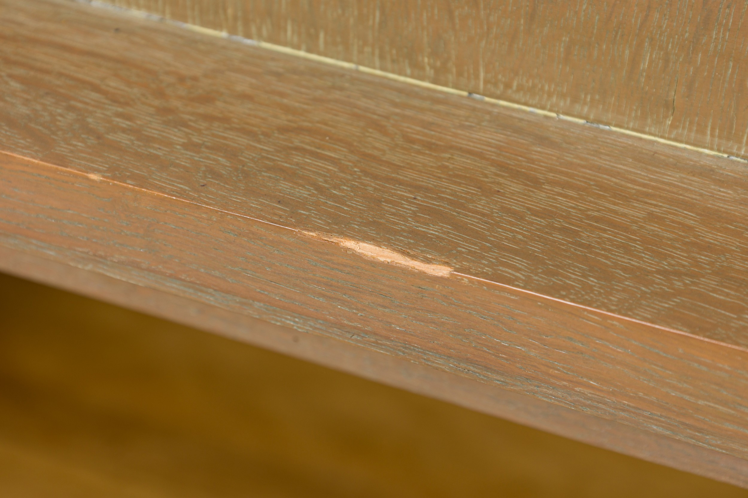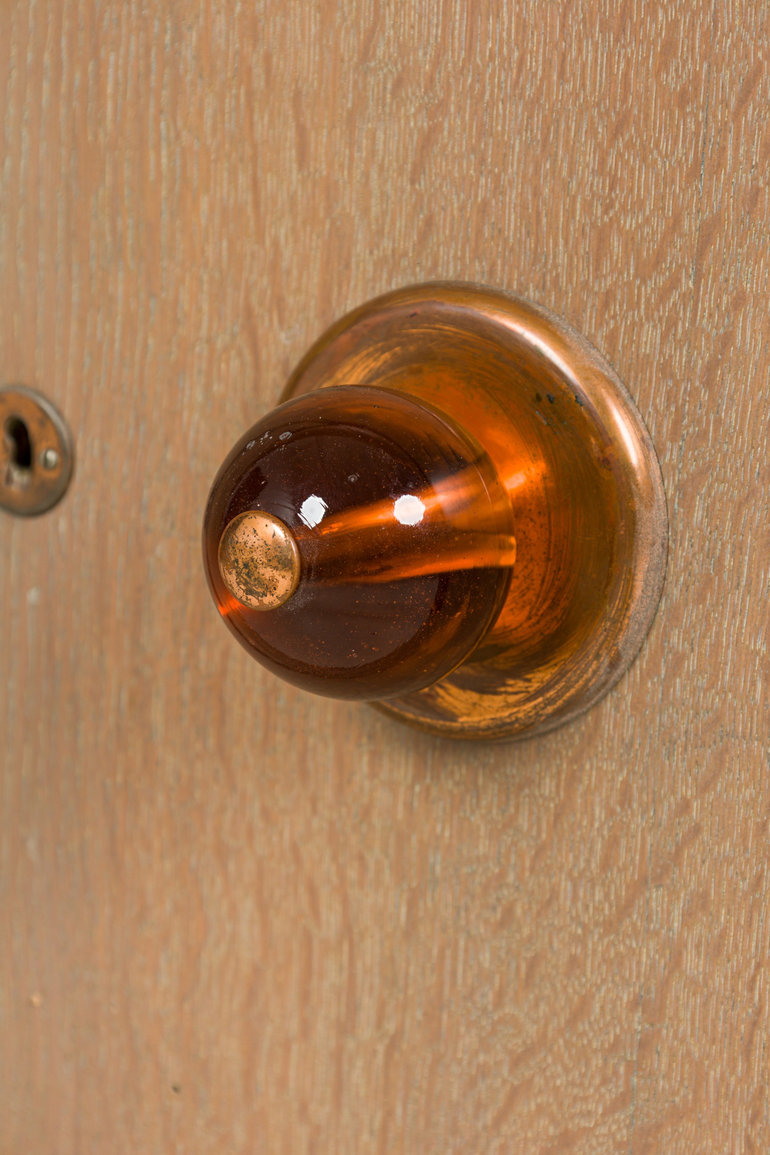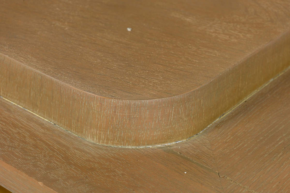French Mid-Century limed oak sideboard with two exterior single door cabinets with large amber glass door pulls which open to reveal a two compartment interior centering a two-door cabinet compartment which opens to reveal two lower compartments and two upper drawers, resting on two large cylindrical supports on a wide platform base.