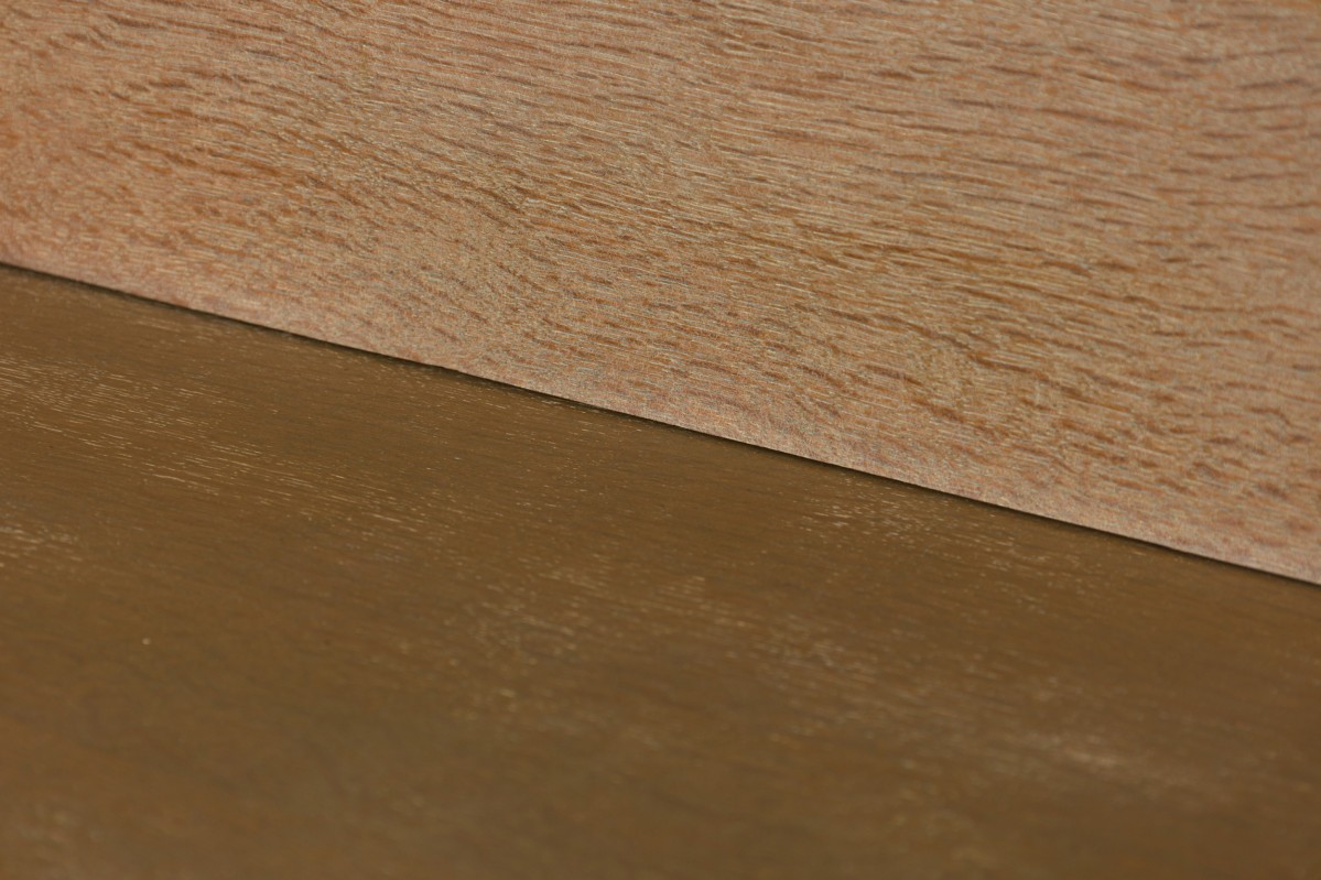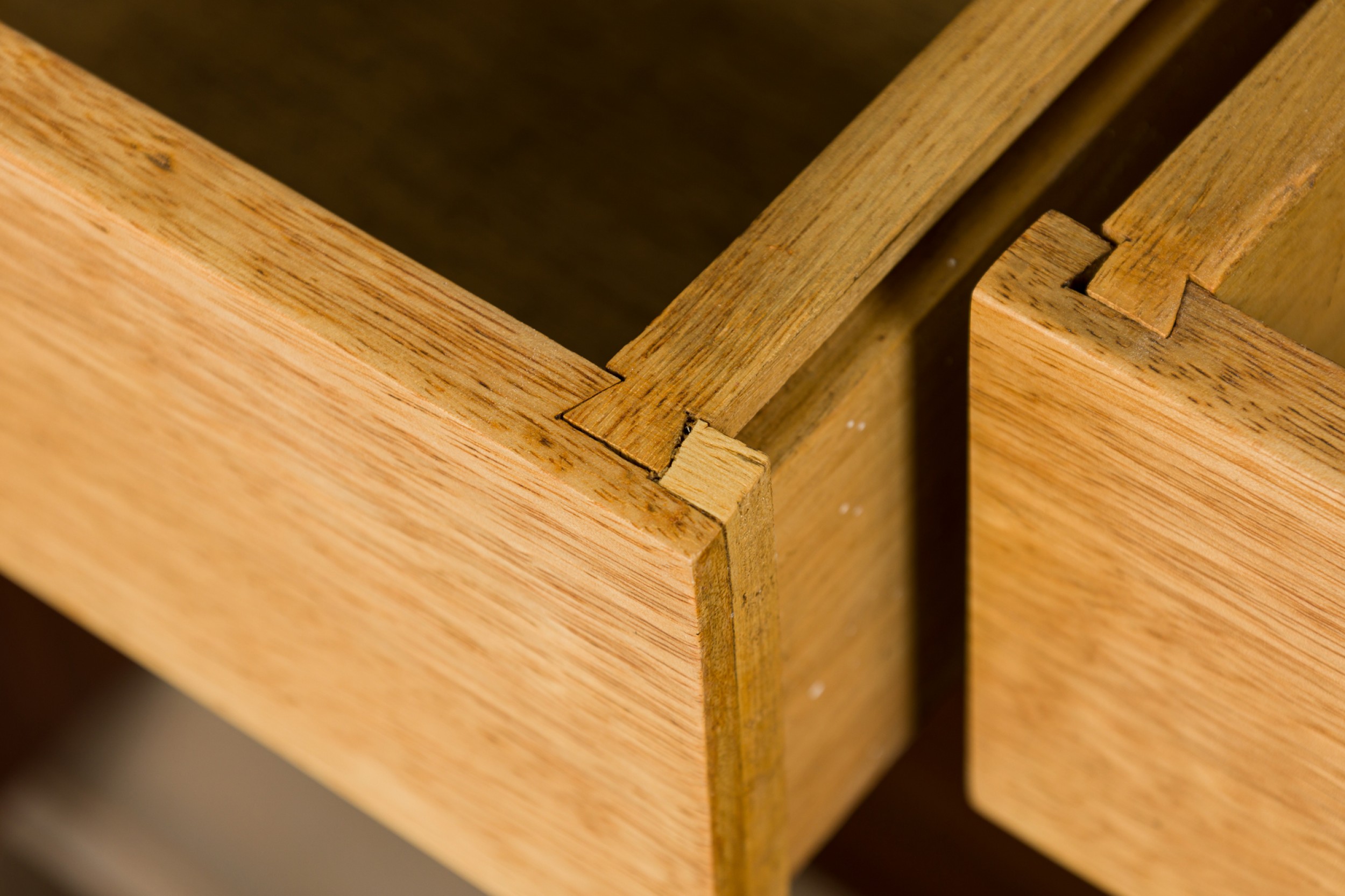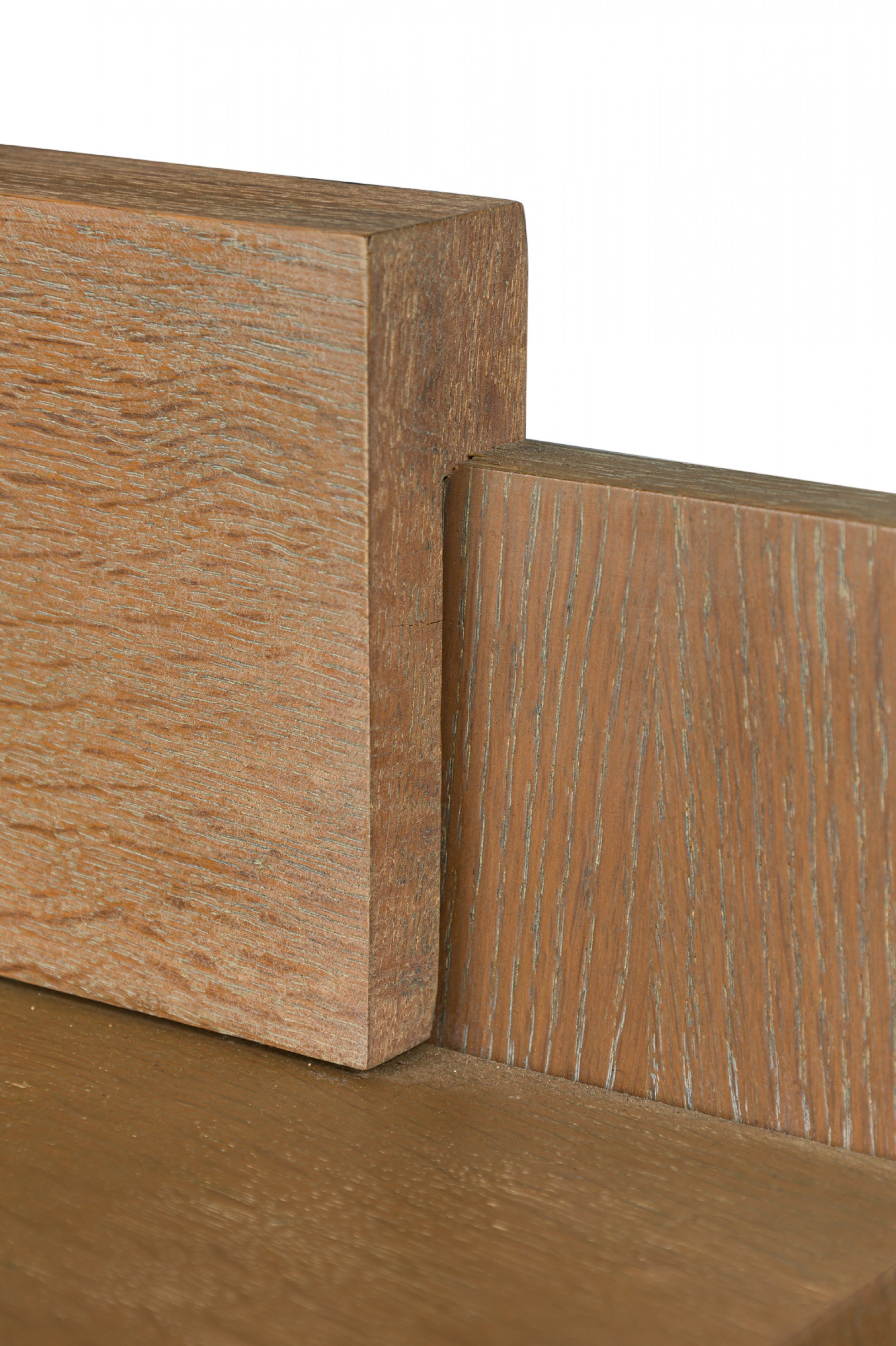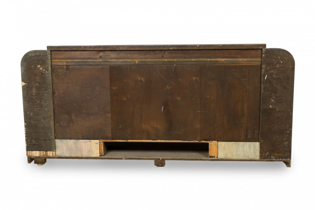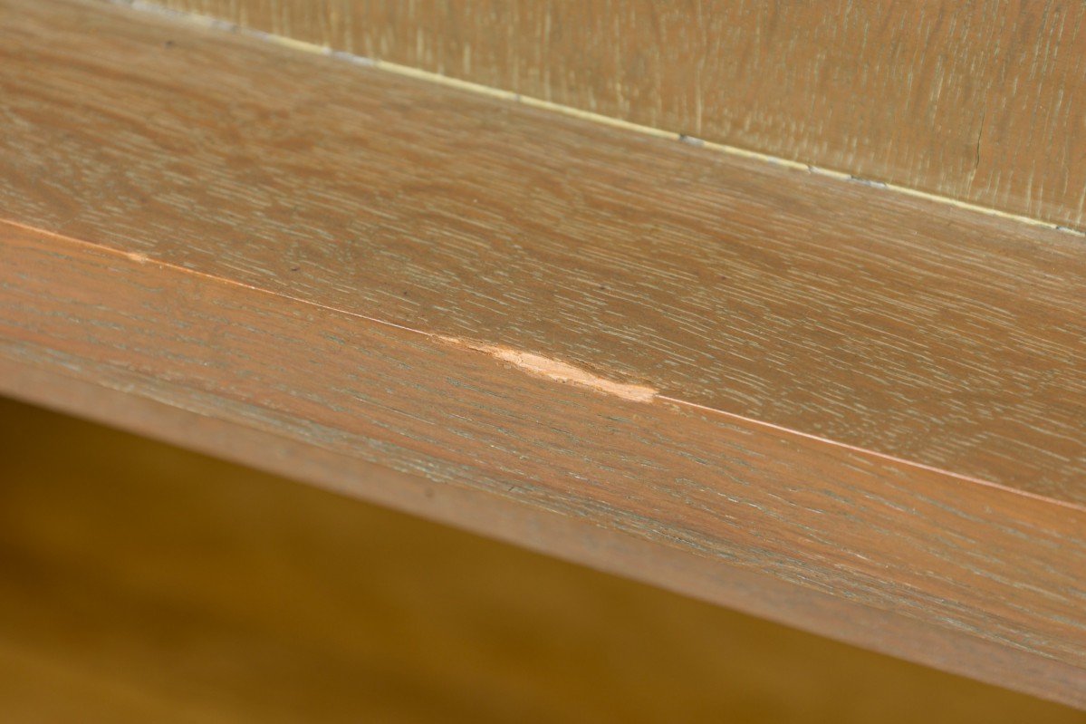French Mid-Century limed oak sideboard with two exterior single door cabinets with large amber glass door pulls which open to reveal a two compartment interior centering a two-door cabinet compartment which opens to reveal two lower compartments and two upper drawers, resting on two large cylindrical supports on a wide platform base.