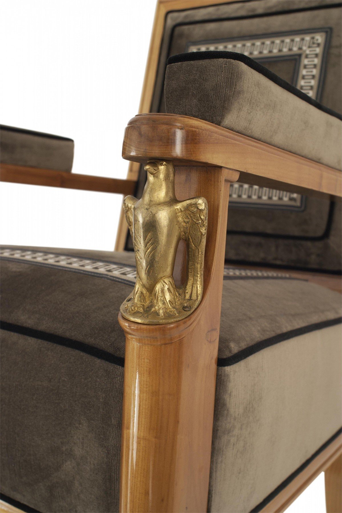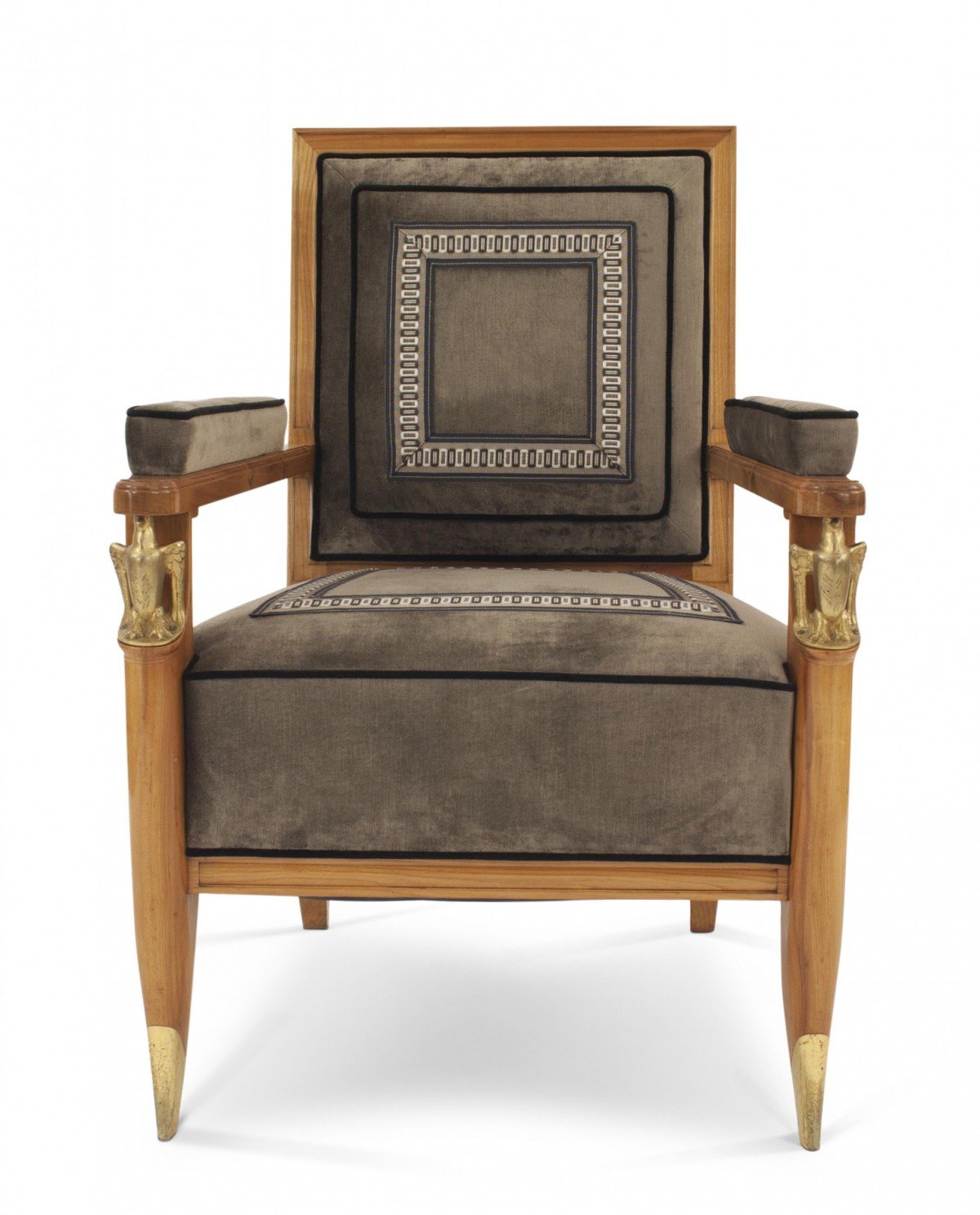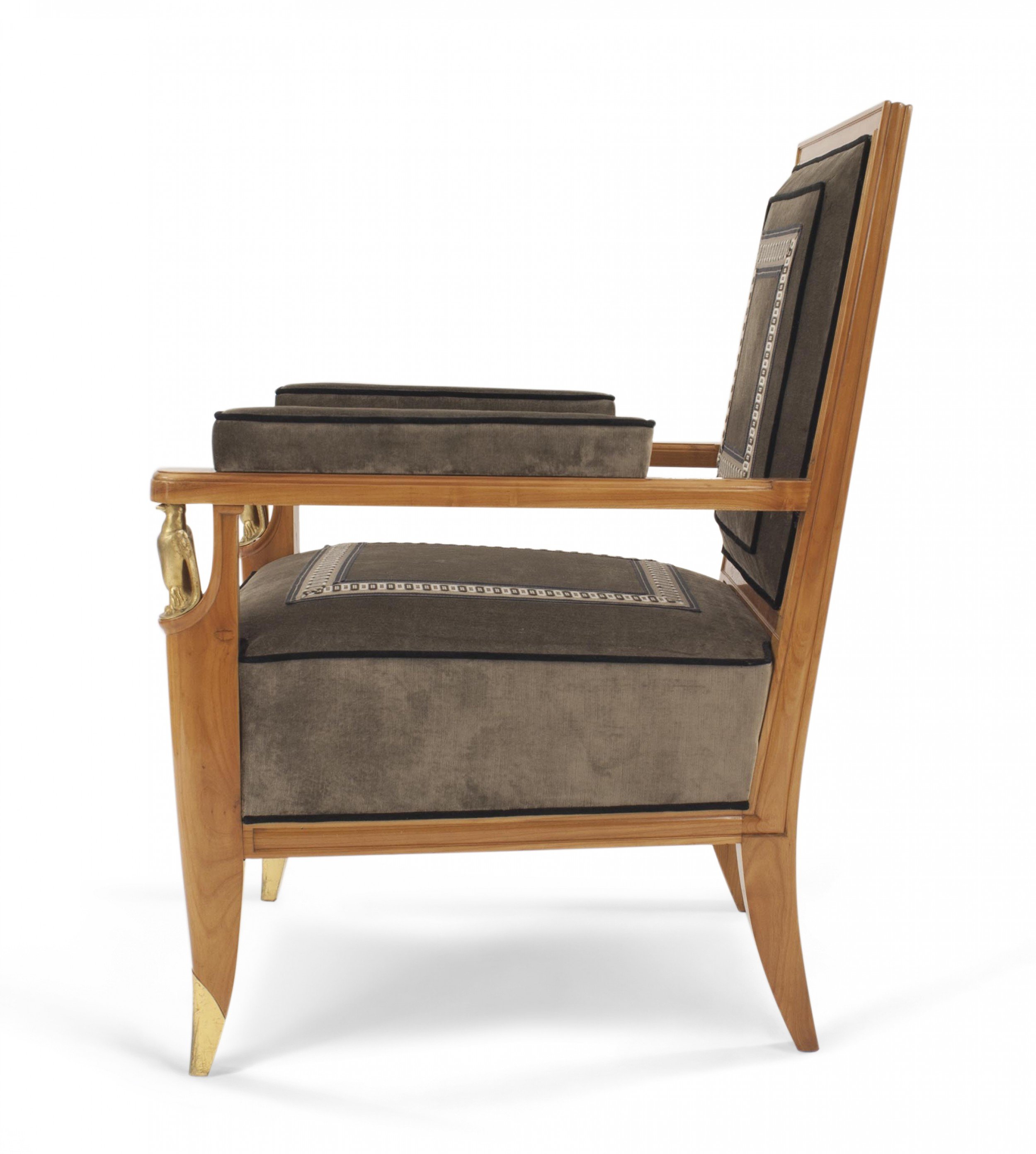 French Mid-Century light mahogany arm chair with gilt bronze sabot feet and armrest supported by gilt bronze eagles with brown upholstery