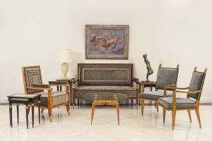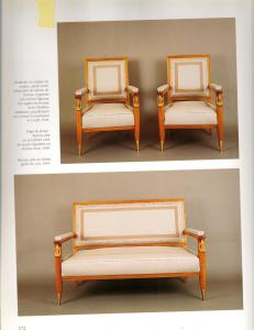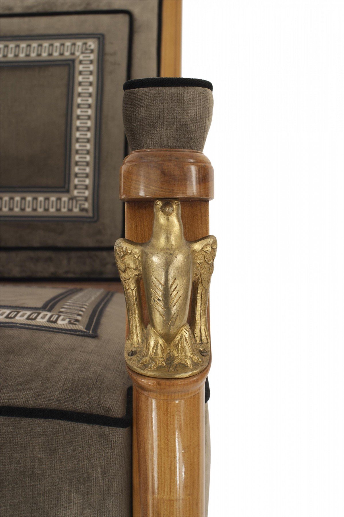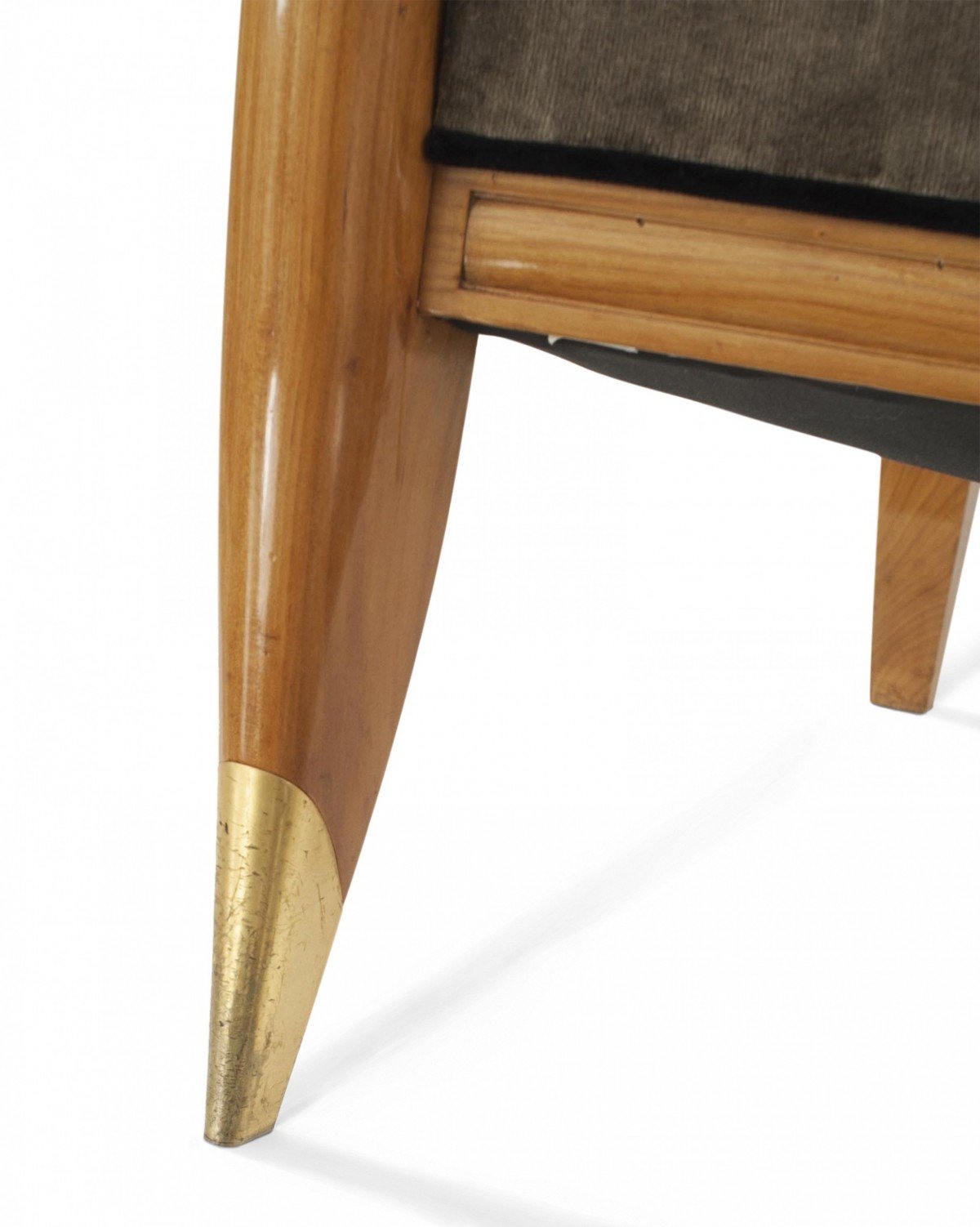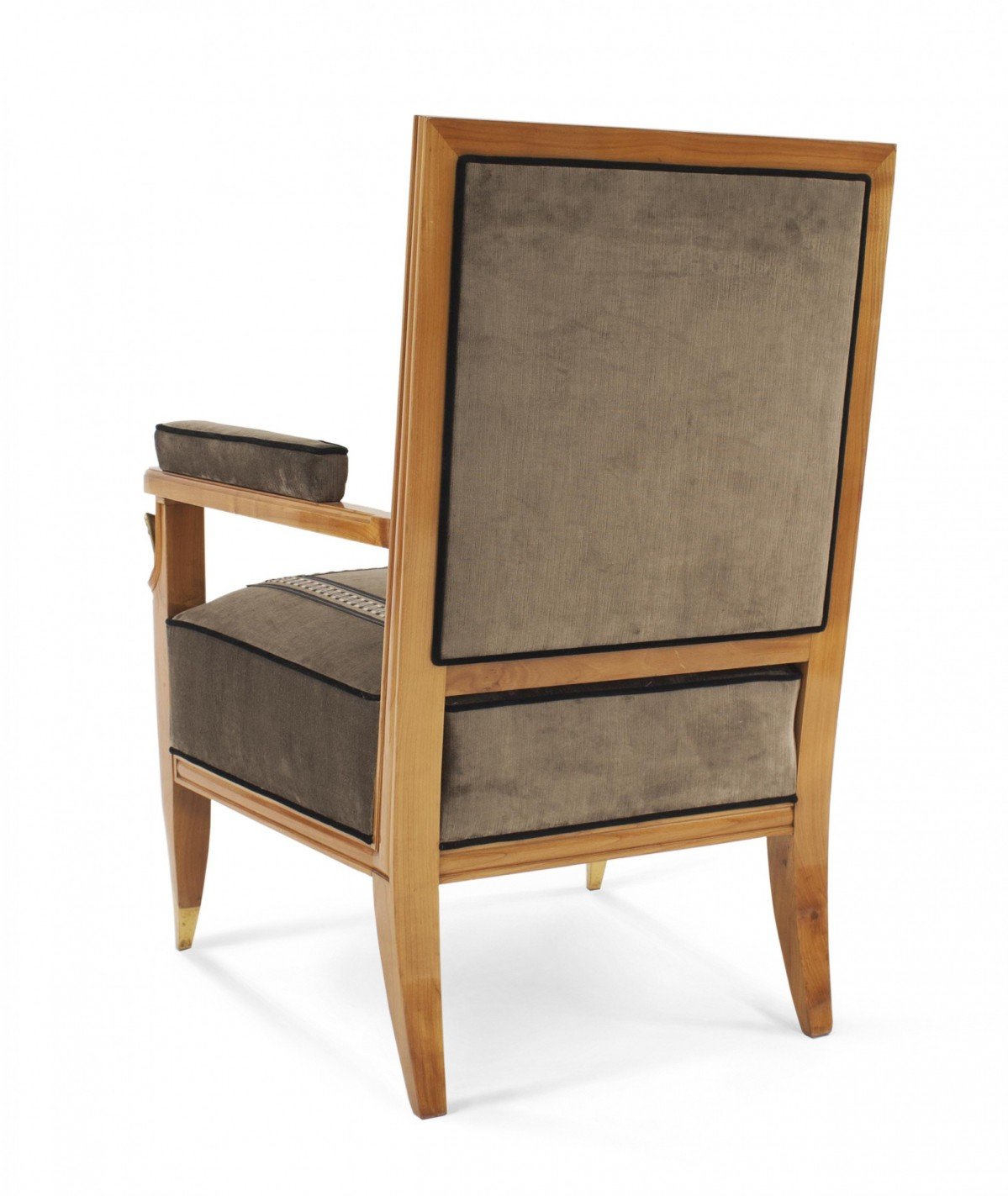 French Mid-Century light mahogany arm chair with gilt bronze sabot feet and armrest supported by gilt bronze eagles with brown upholstery