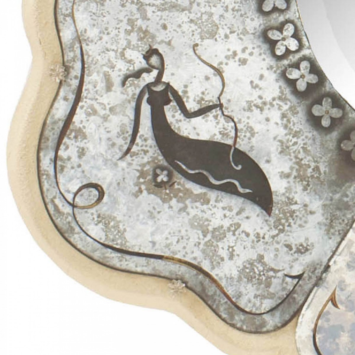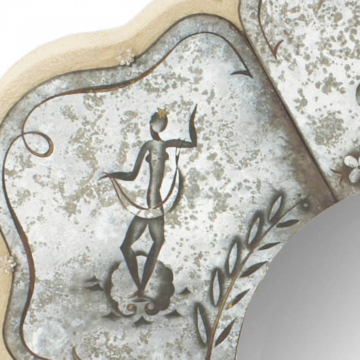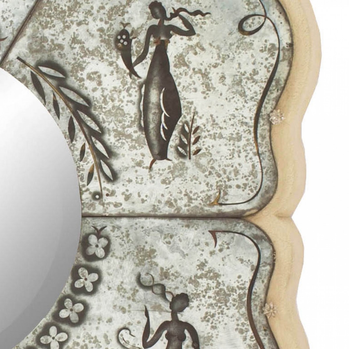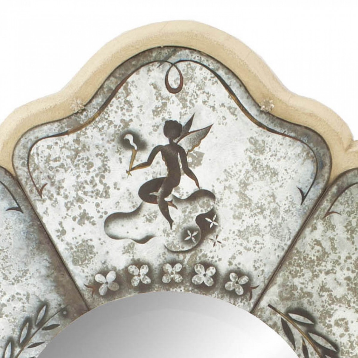 French Mid-Century round mirror with a scalloped off-white frame with verre eglomise decorated panels featuring zodiac symbols (by PIERRE LARDIN)