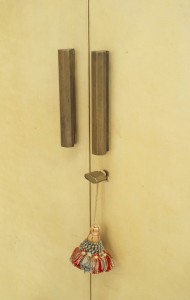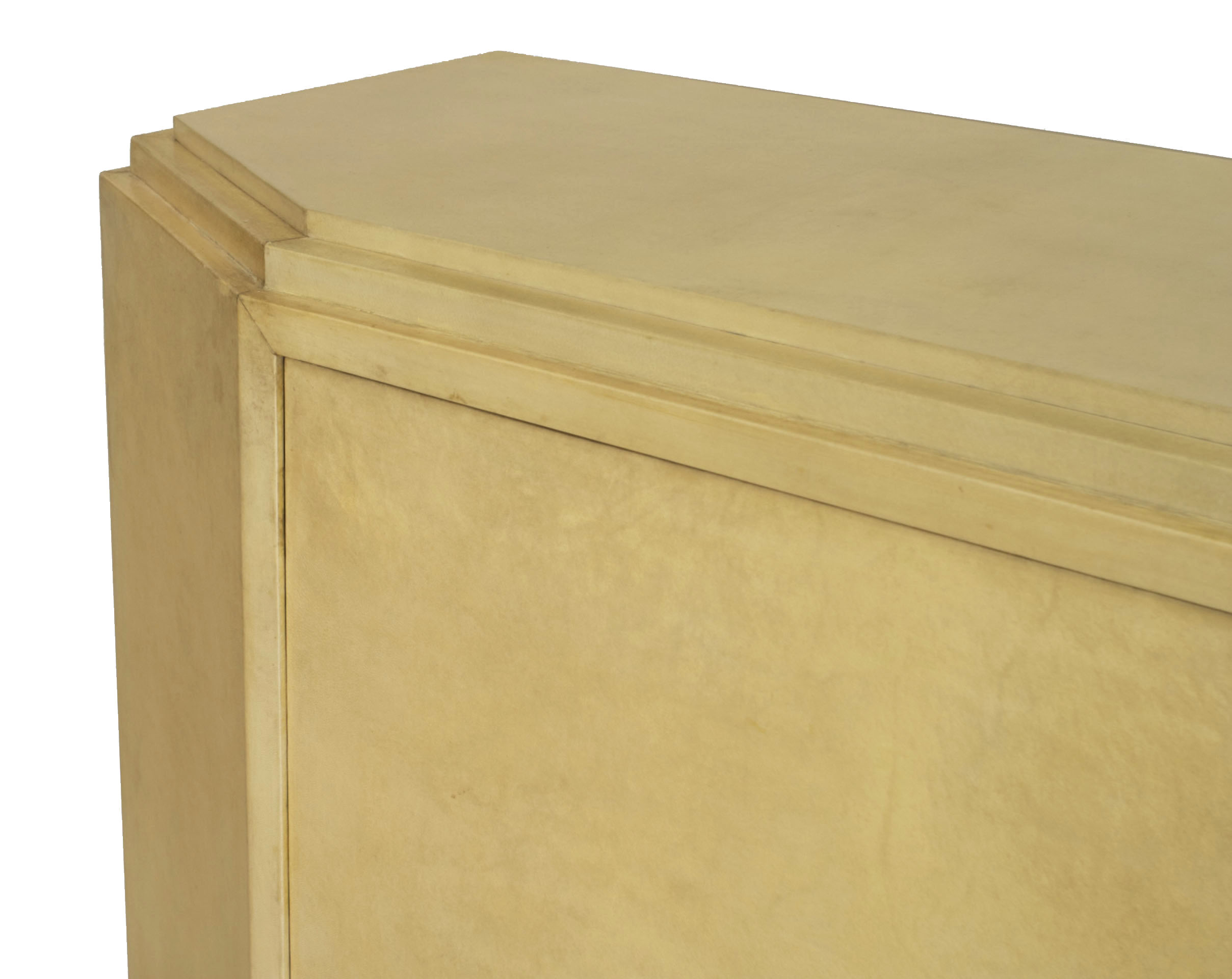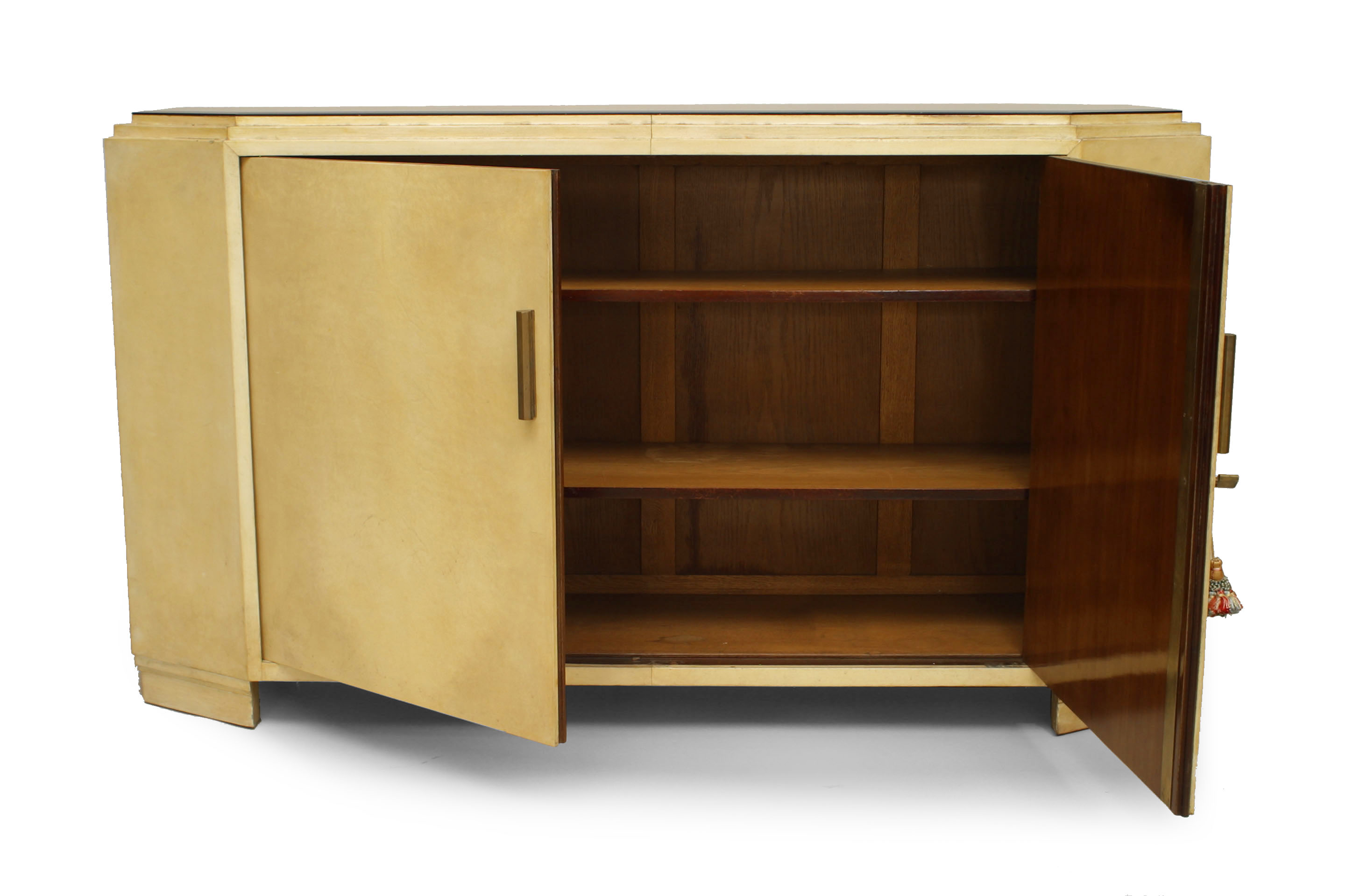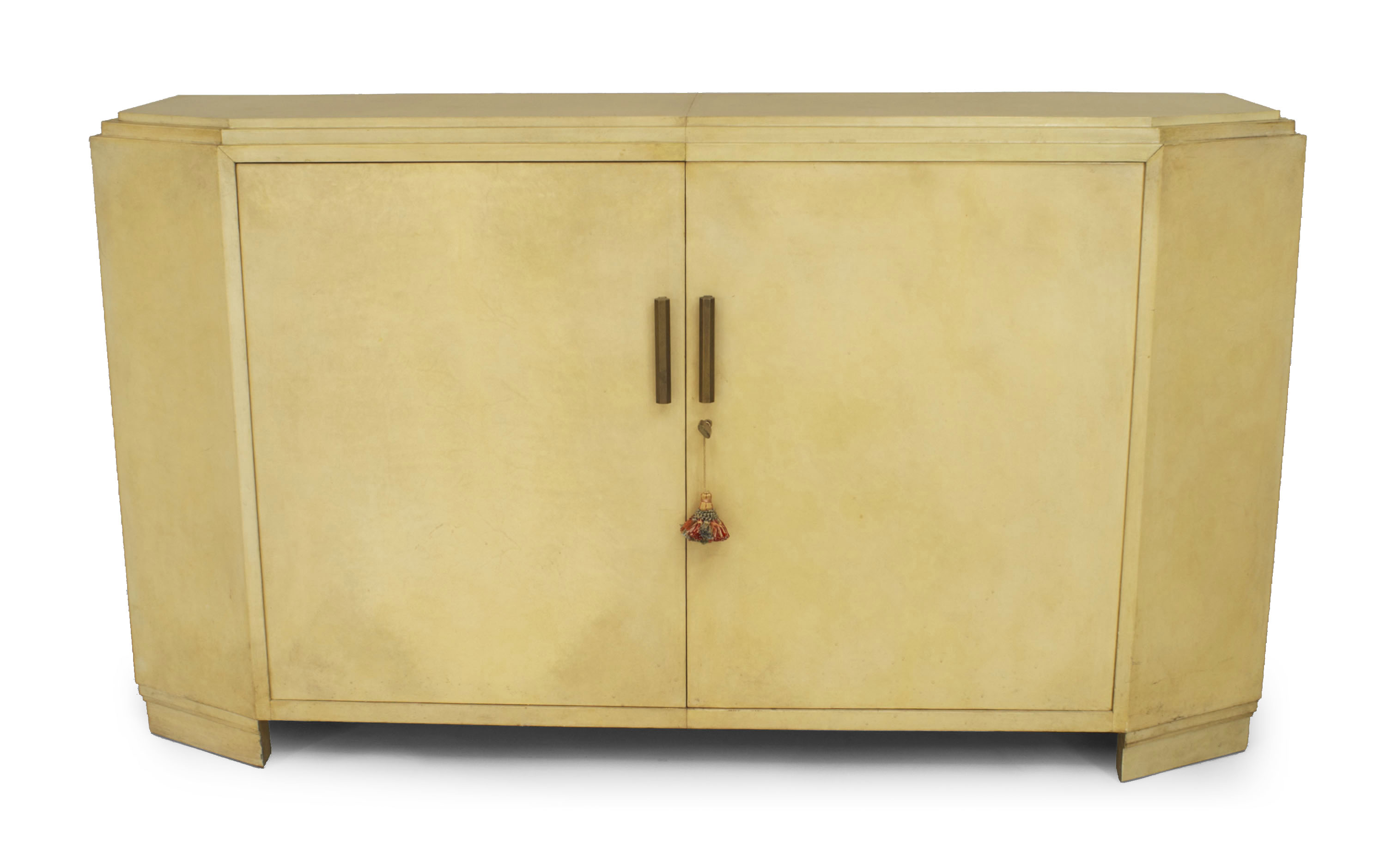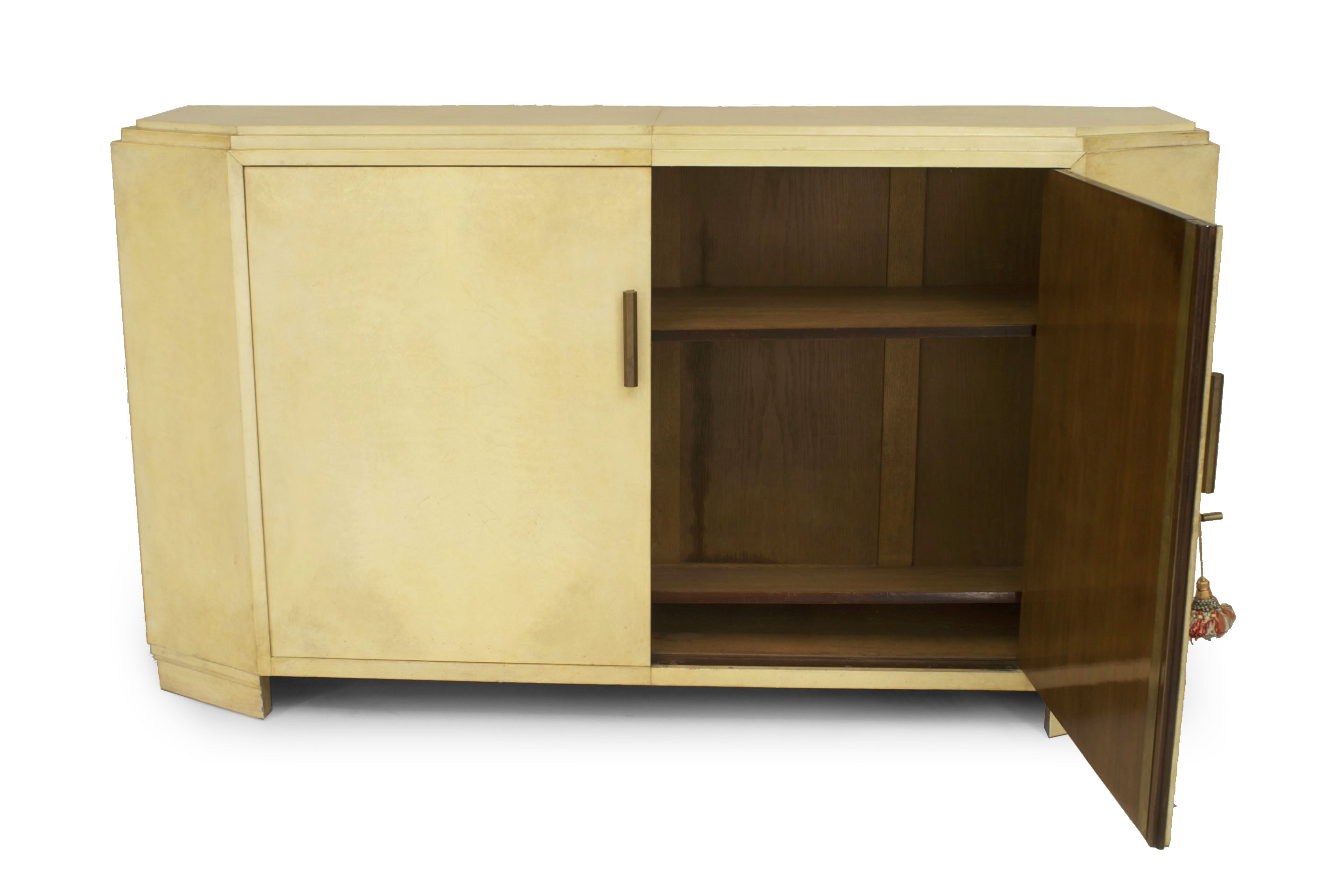 French Mid-Century (1940s) white parchment narrow sideboard cabinet with canted sides and a stepped up top with 2 front doors having bronze cylindrical handles.