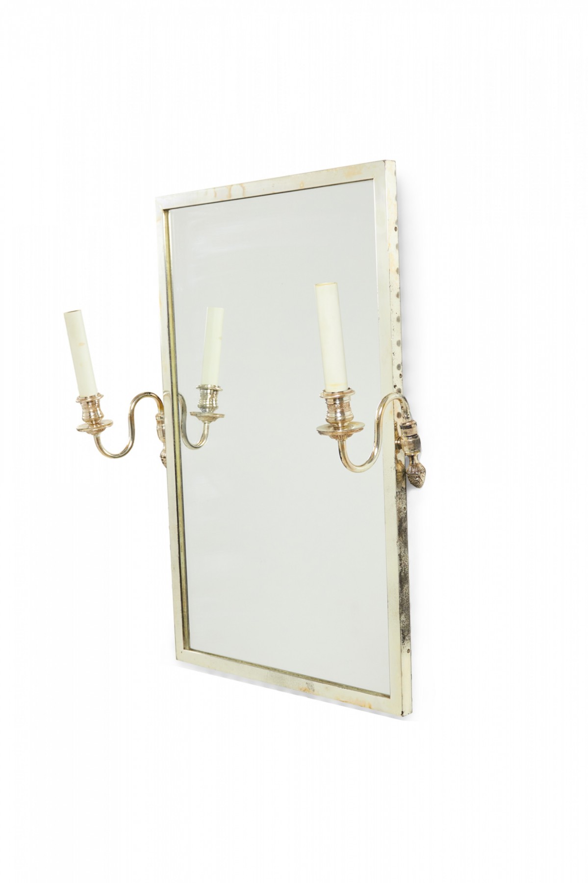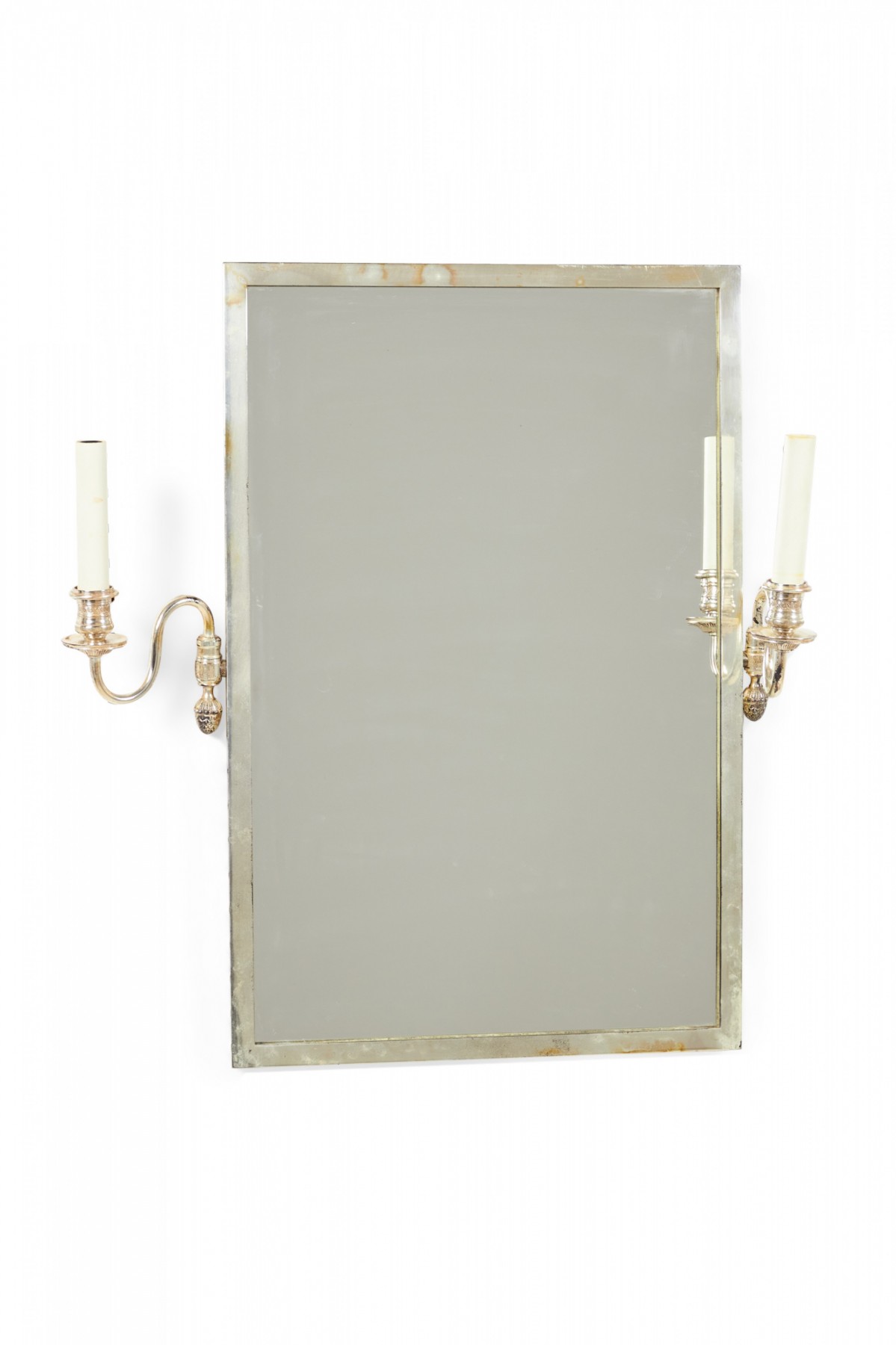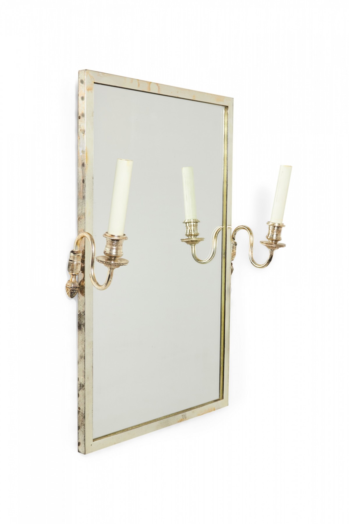 French Regence-style silver framed rectangular wall mirror with two electrified silver sconce arms with off-white plastic candle sleeves on either side.