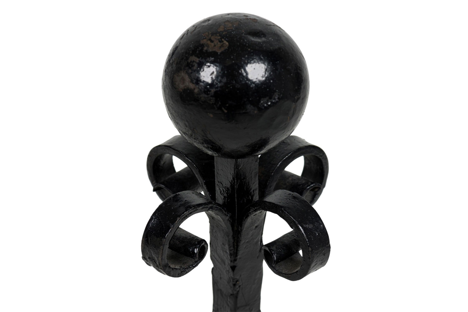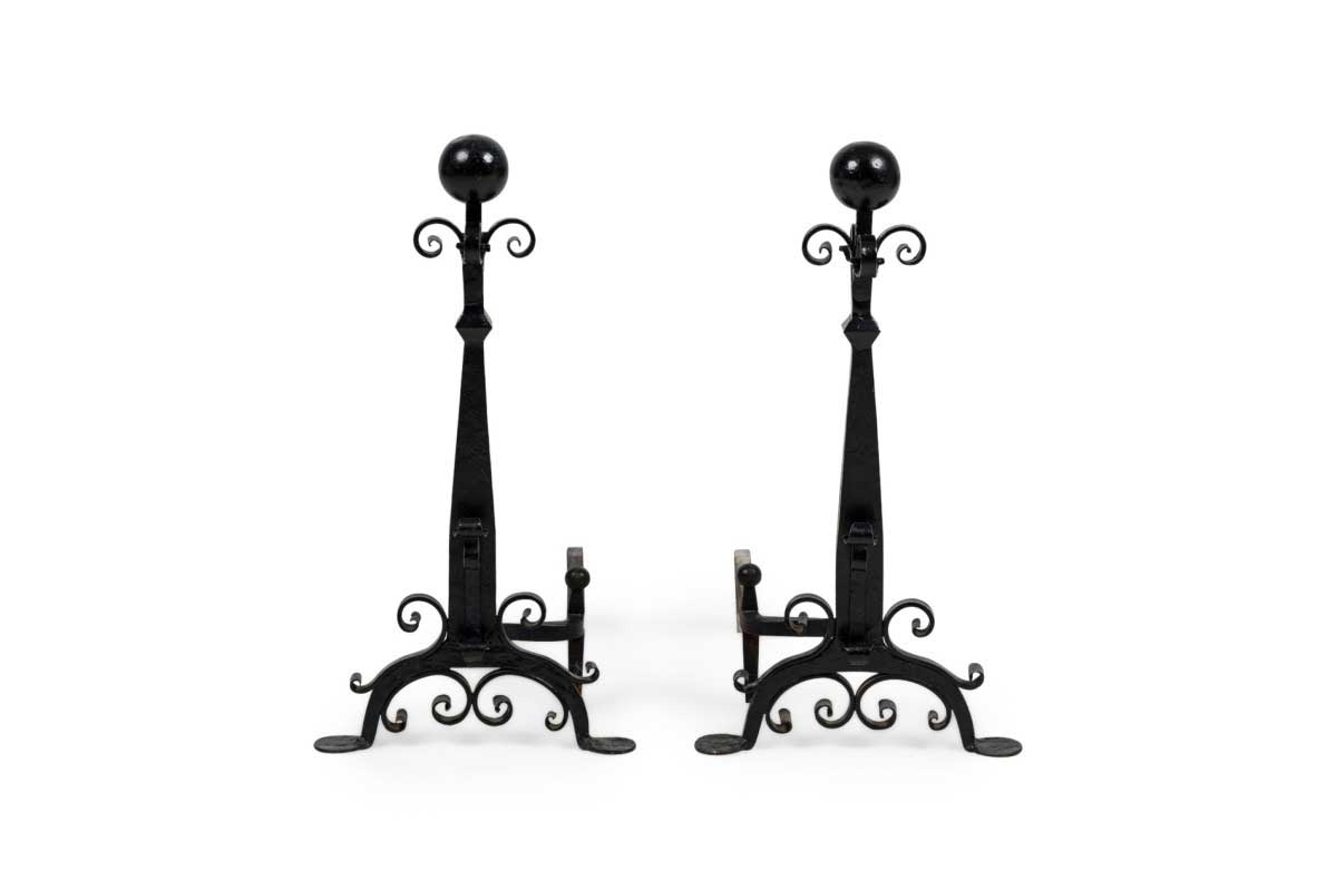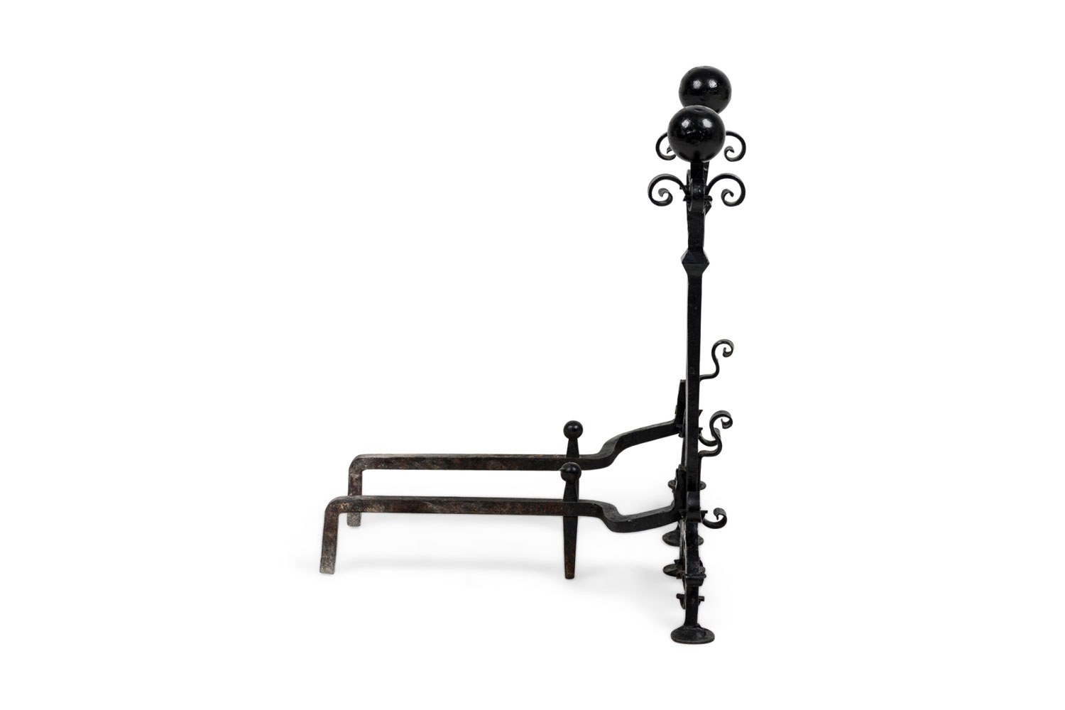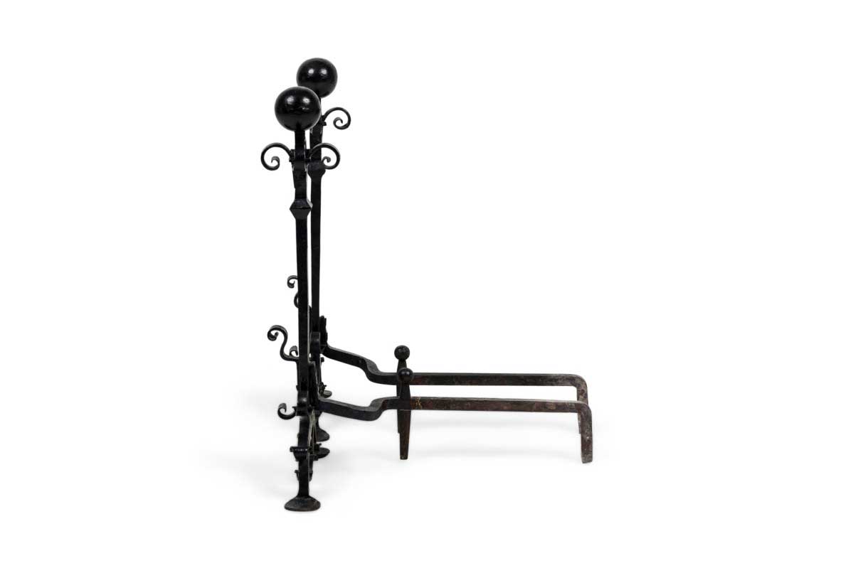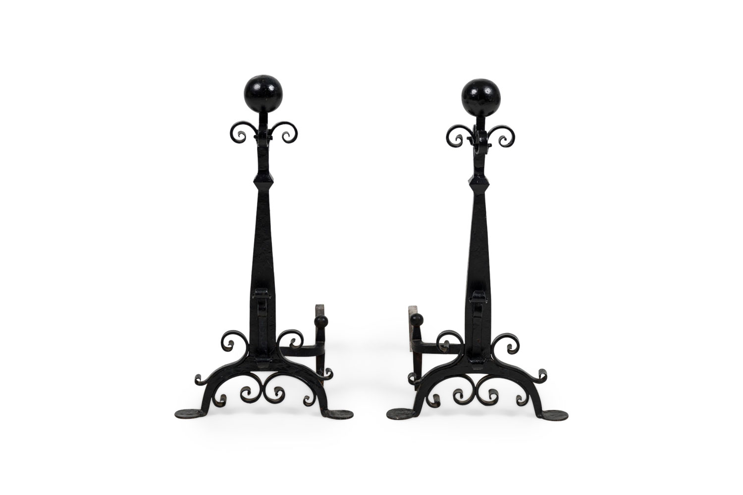 PAIR of French Victorian style black painted wrought iron andirons with a 2 legged base having protruding scrolls and a ball top