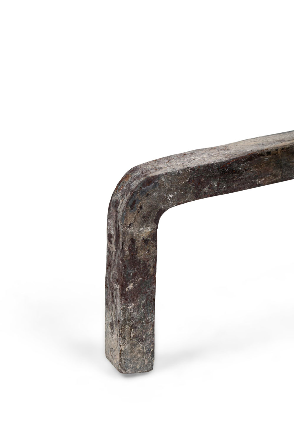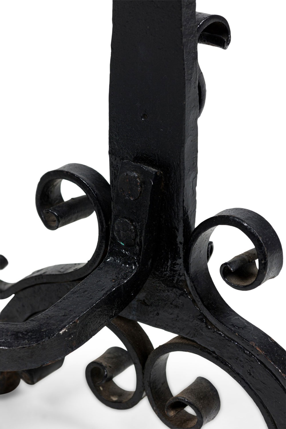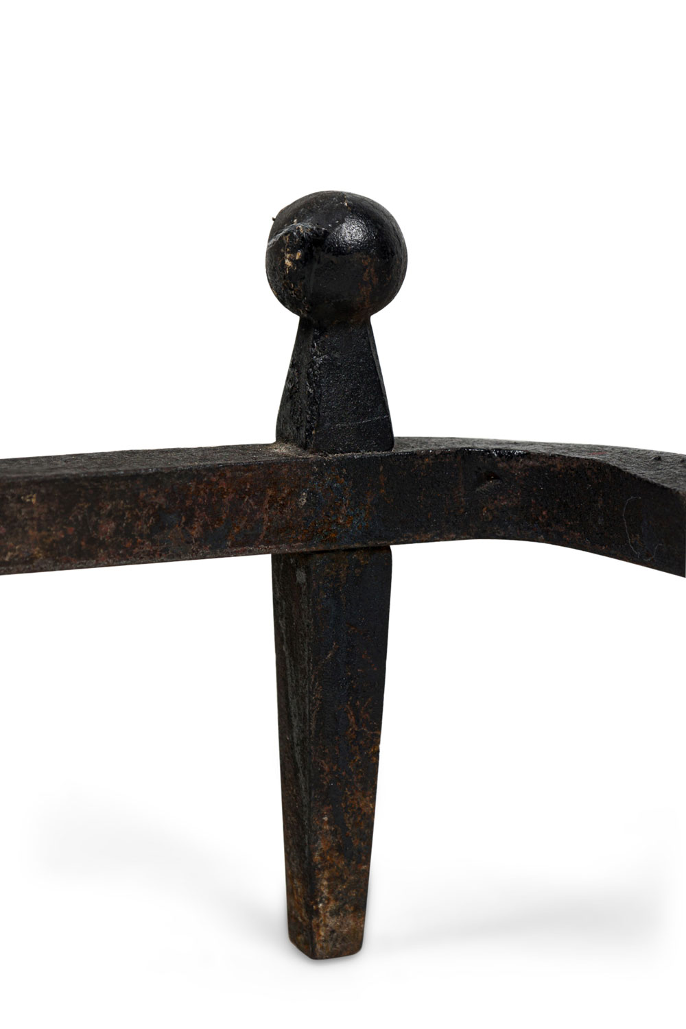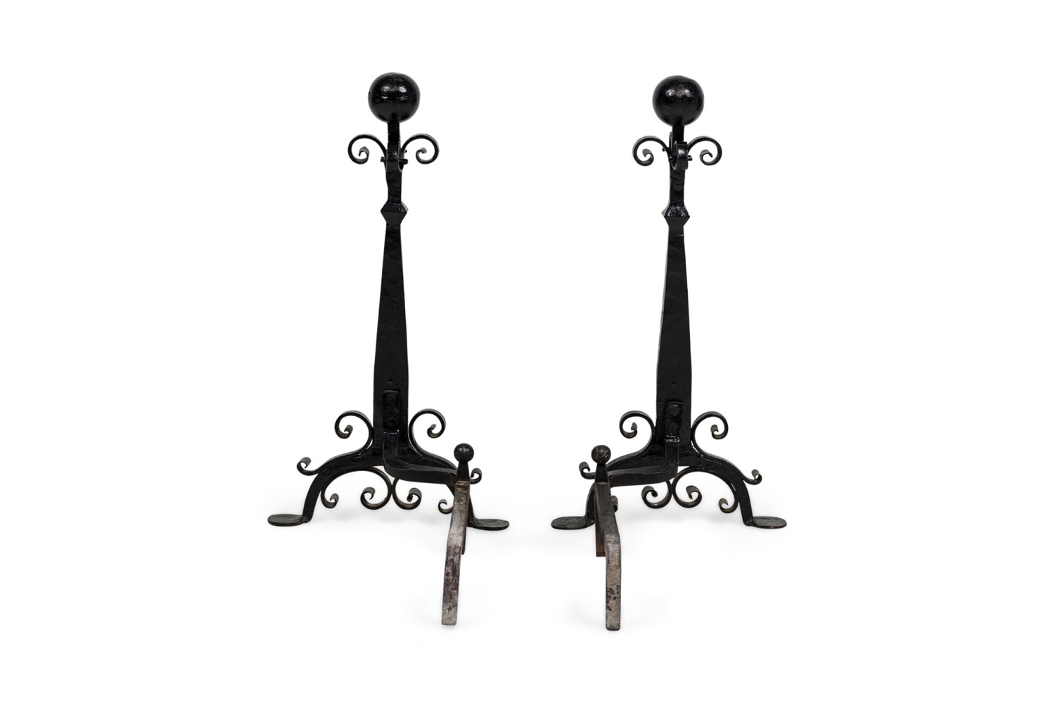 PAIR of French Victorian style black painted wrought iron andirons with a 2 legged base having protruding scrolls and a ball top