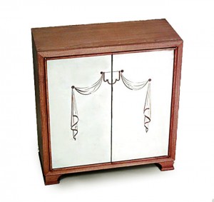 2 French 1940s oak commodes with 2 mirrored doors with painted drape design (PRICED EACH)