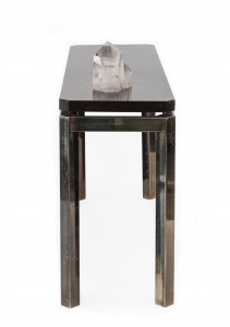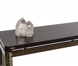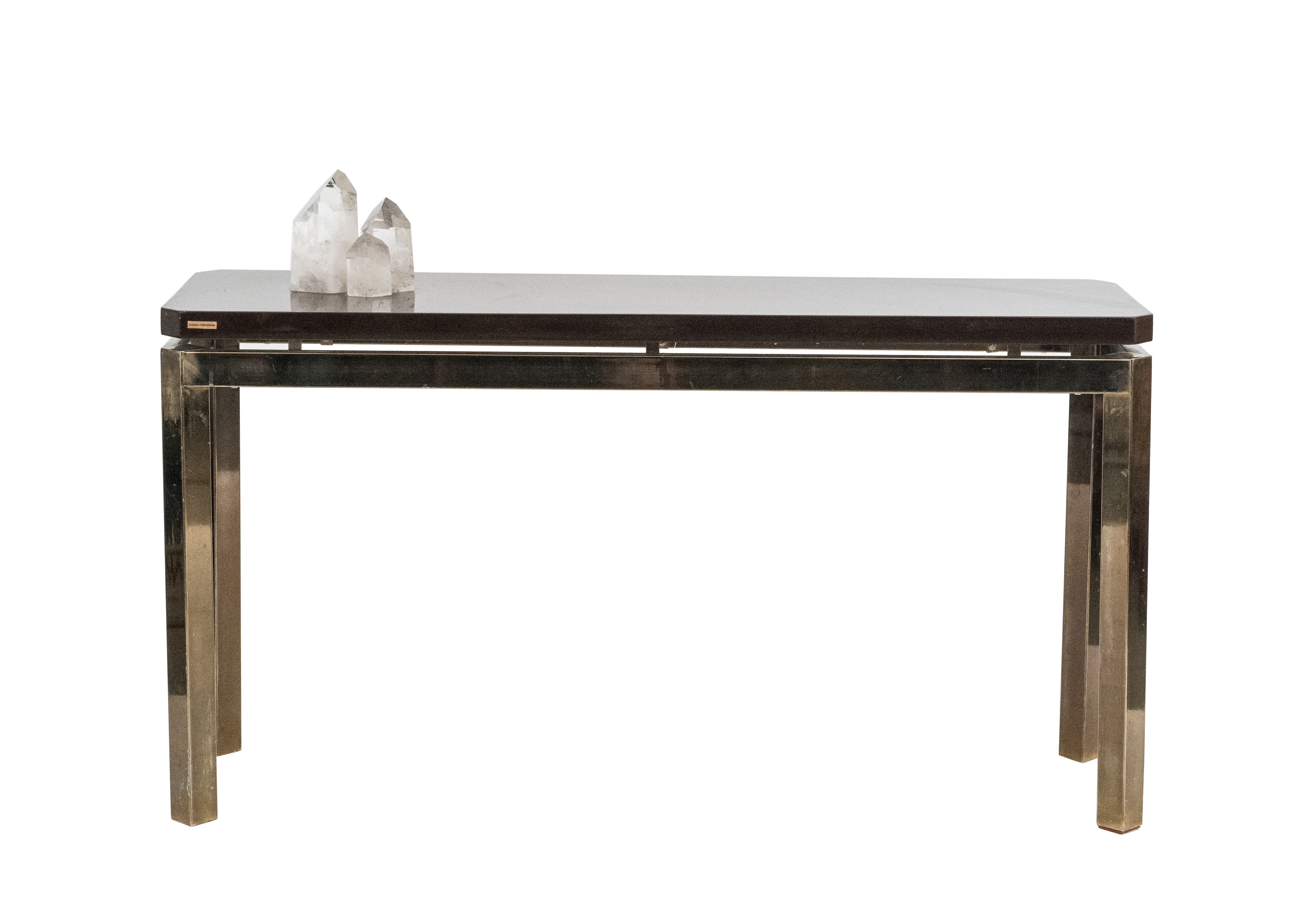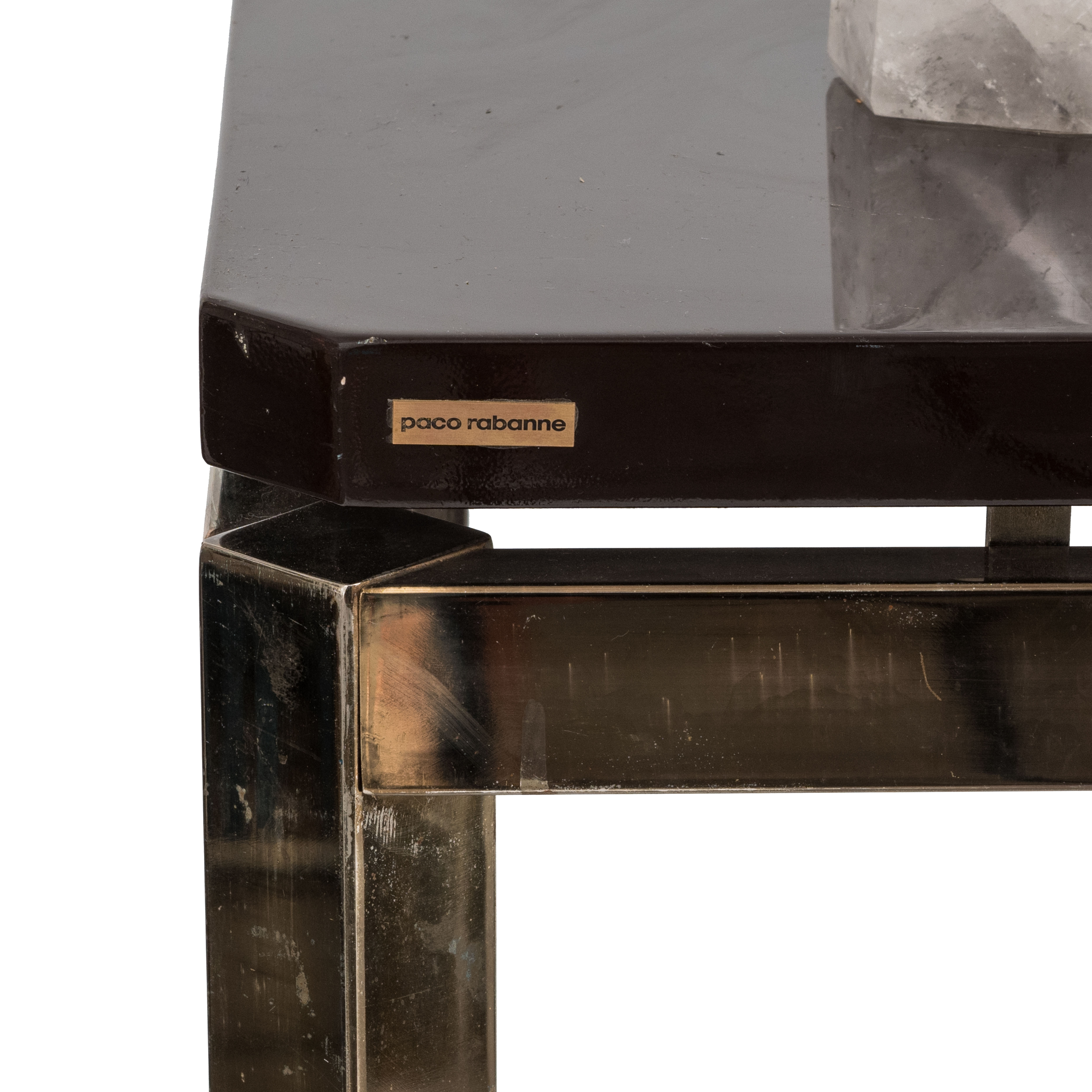 French Post-War Design (1970s) console table with a brass base supporting a brown lacquered top having a protruding quartz sculpture (signed: PACO RABANNE)