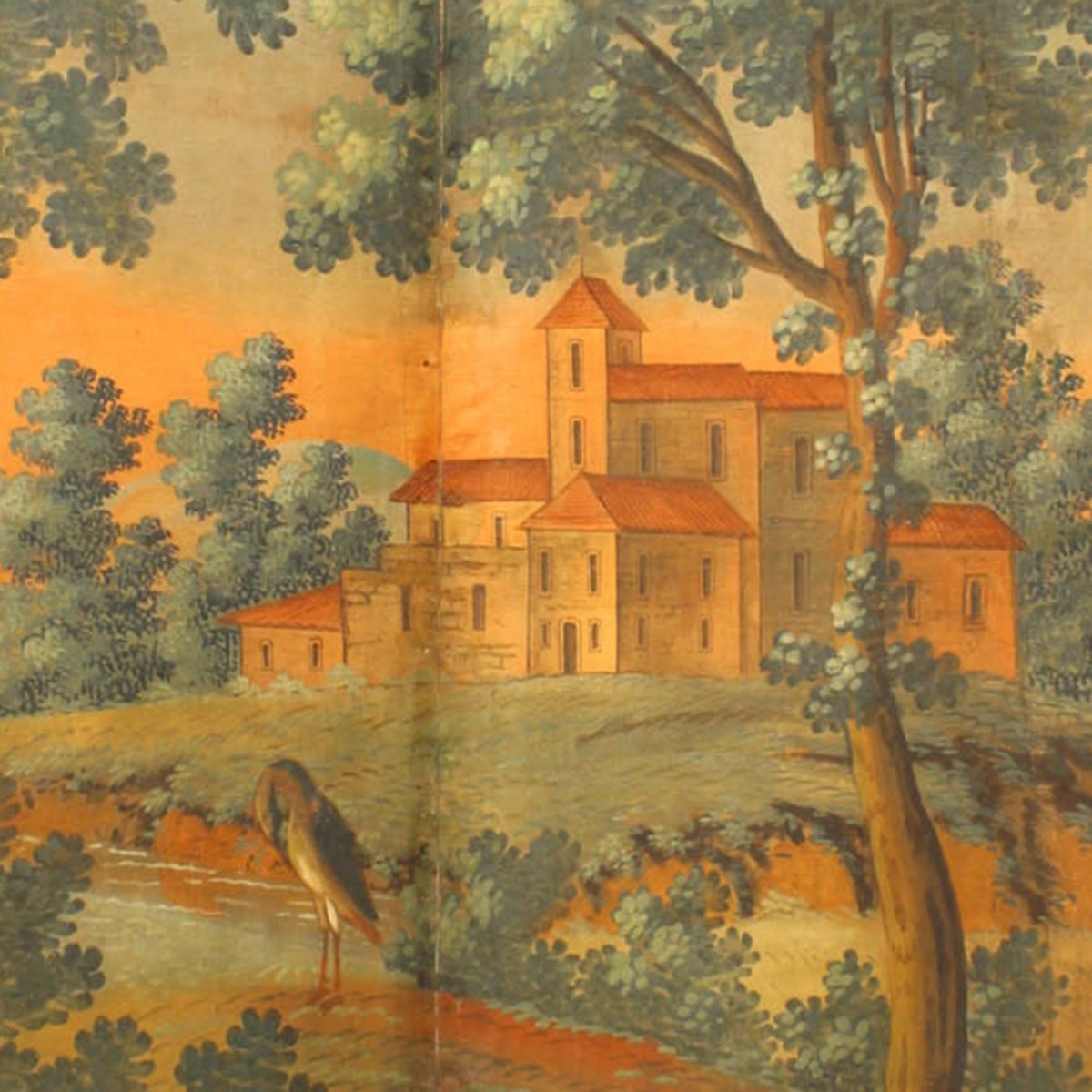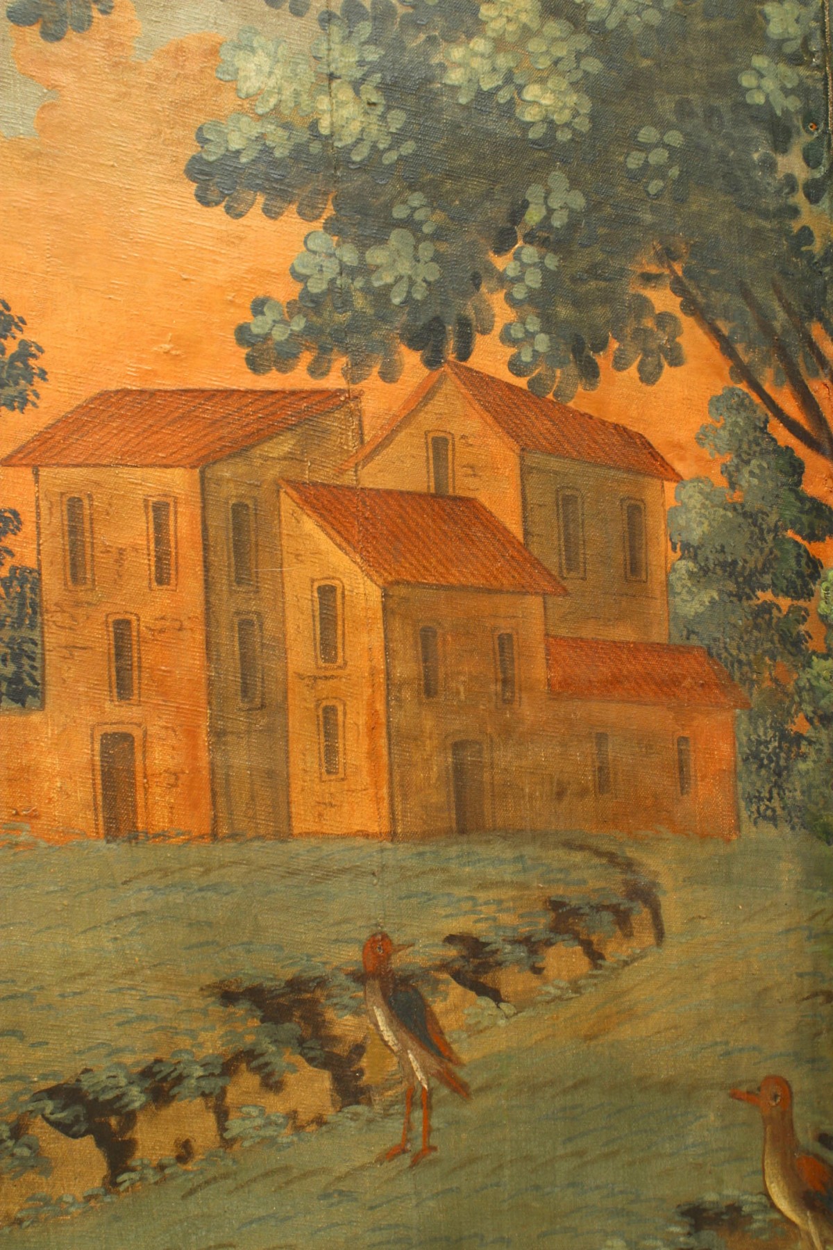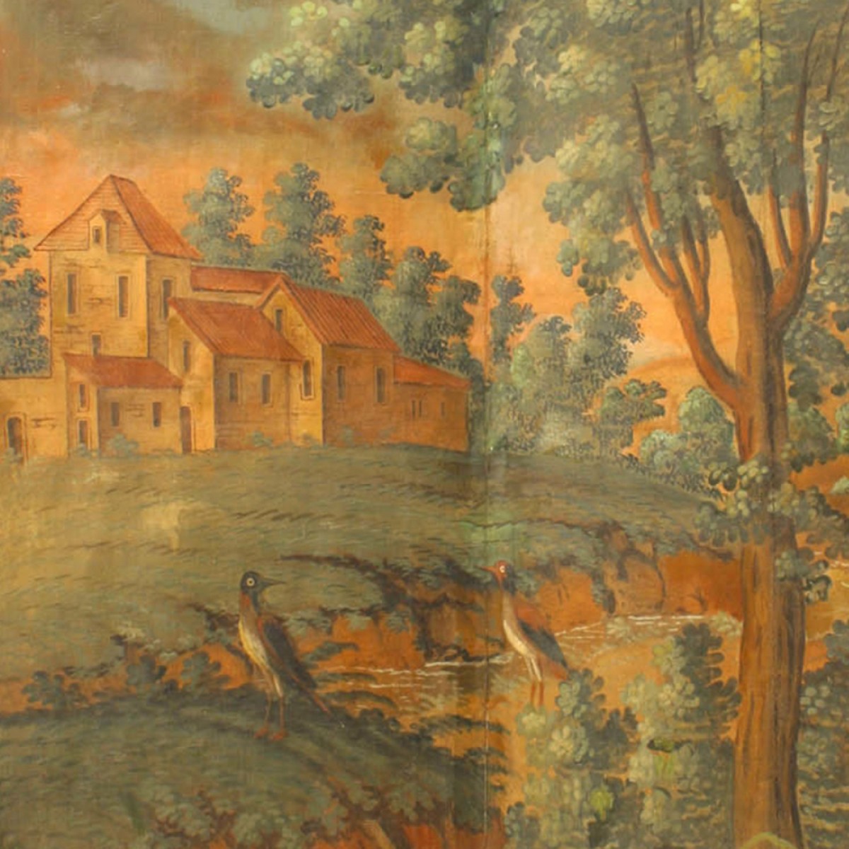 French Provincial (18th Century) 6 fold screen with painted scenes of rustic countryside with farm house.