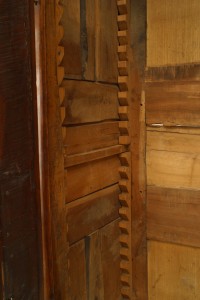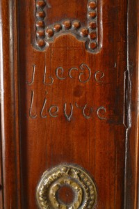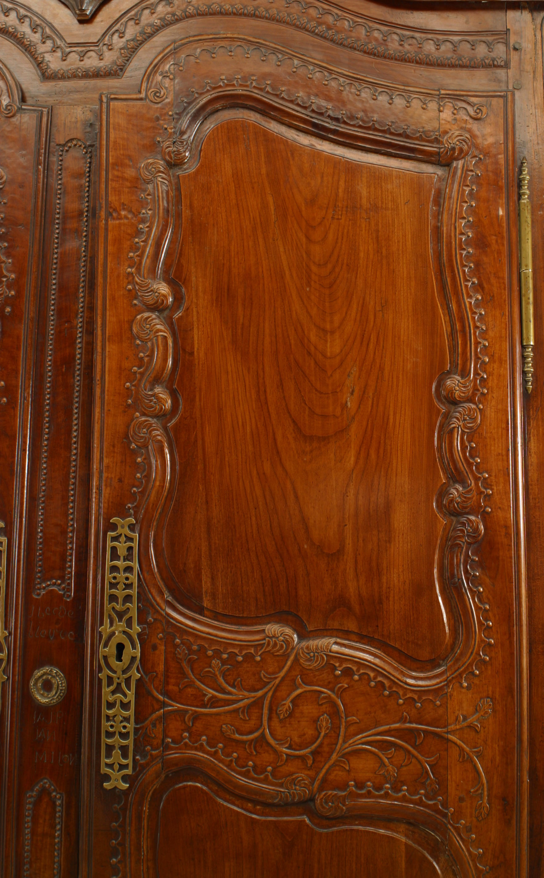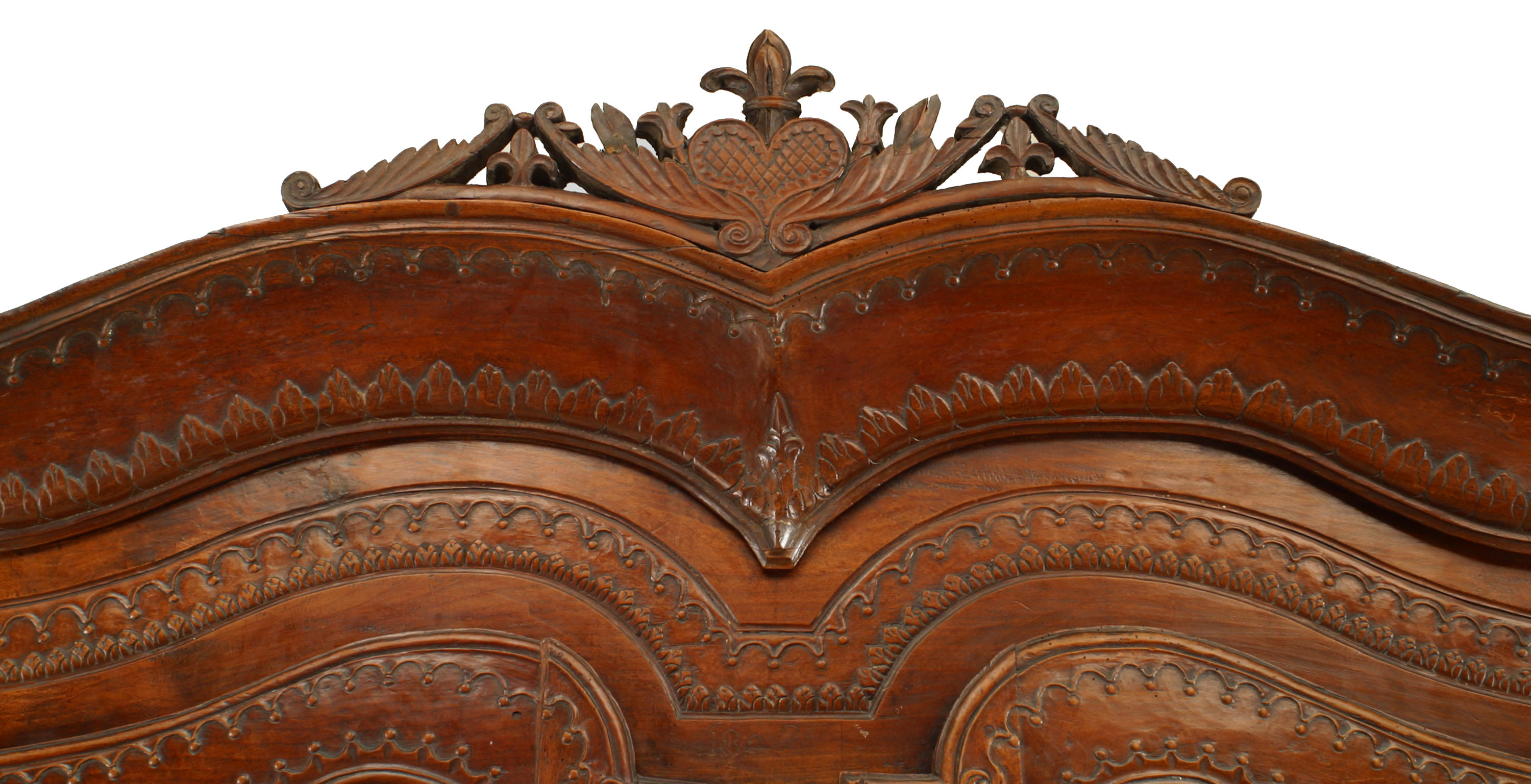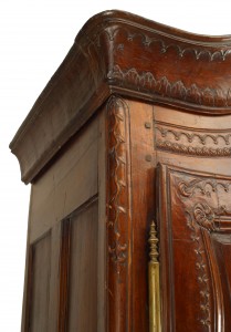 French Provincial (18th Century) walnut carved armoire with double scroll top and 2 doors with carved border