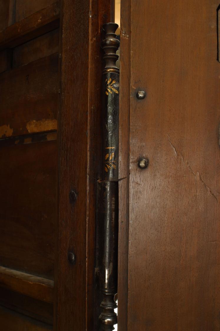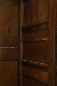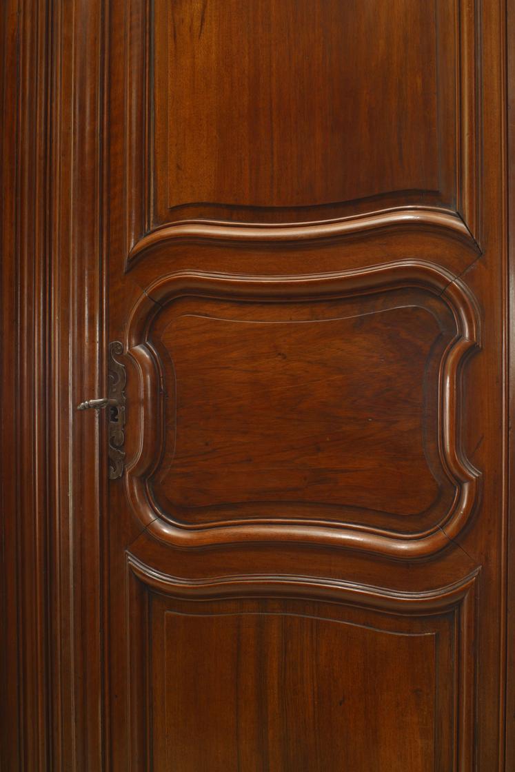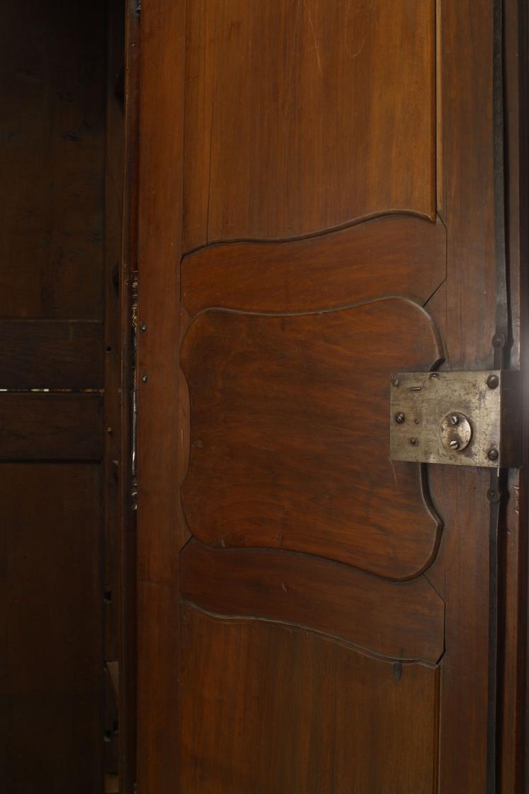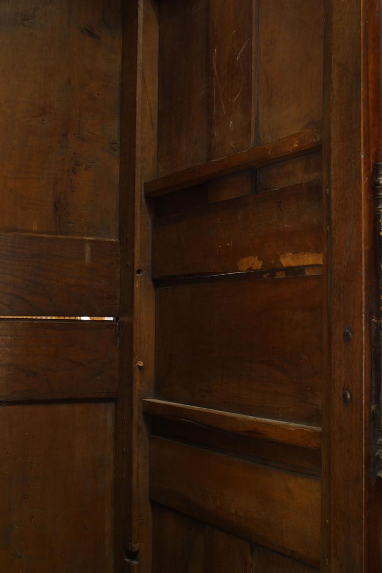 French Provincial (18th Century) two door large scale armoire in walnut with original hardware and shield, bird, and foliate carving on cornice.