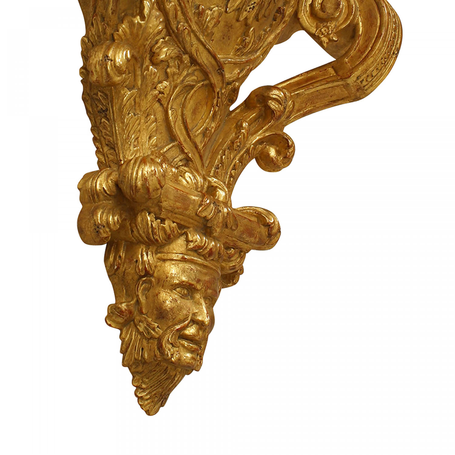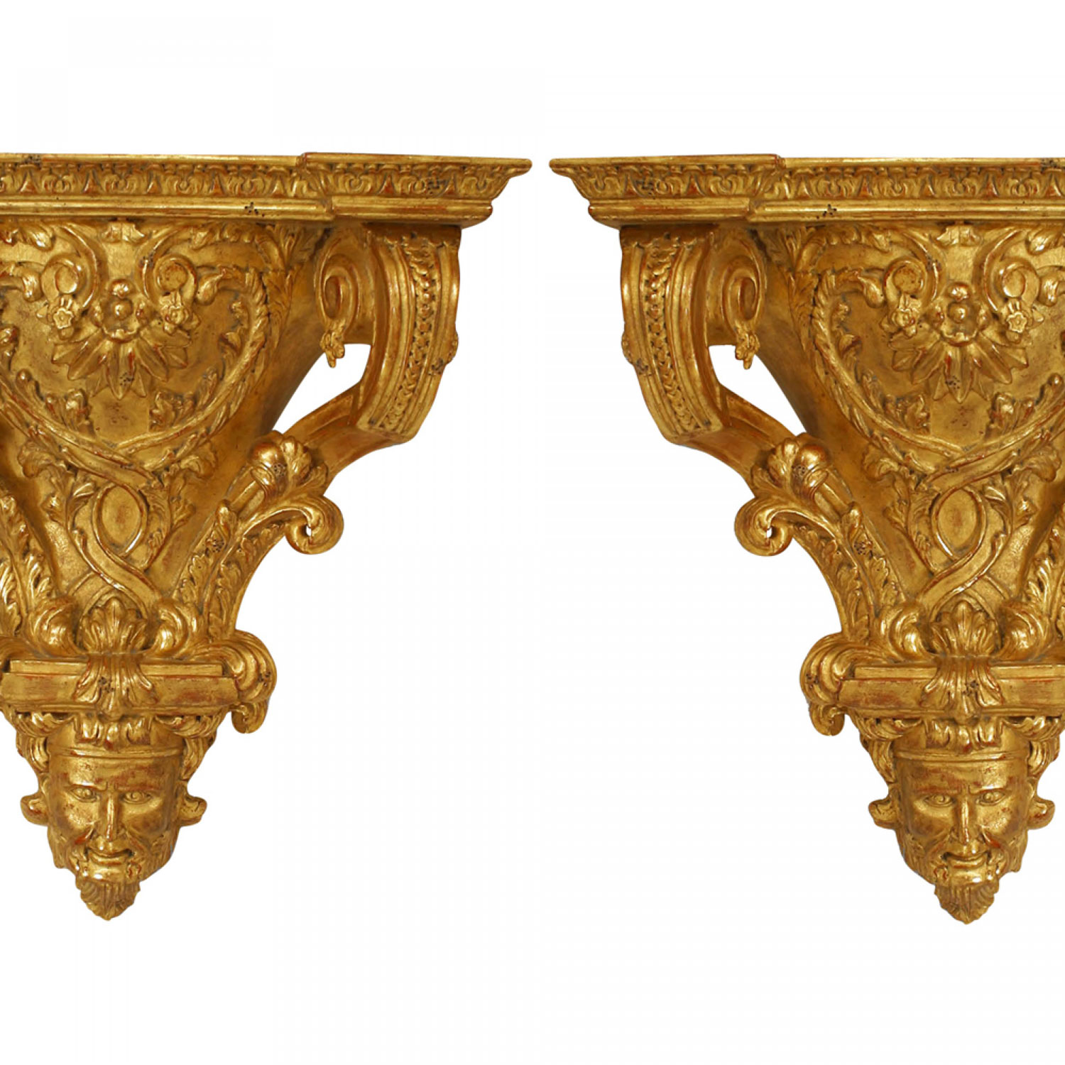 PAIR of French Regence style (20th Cent) gilt carved wall shelves with a carved head centered between scroll design sides.