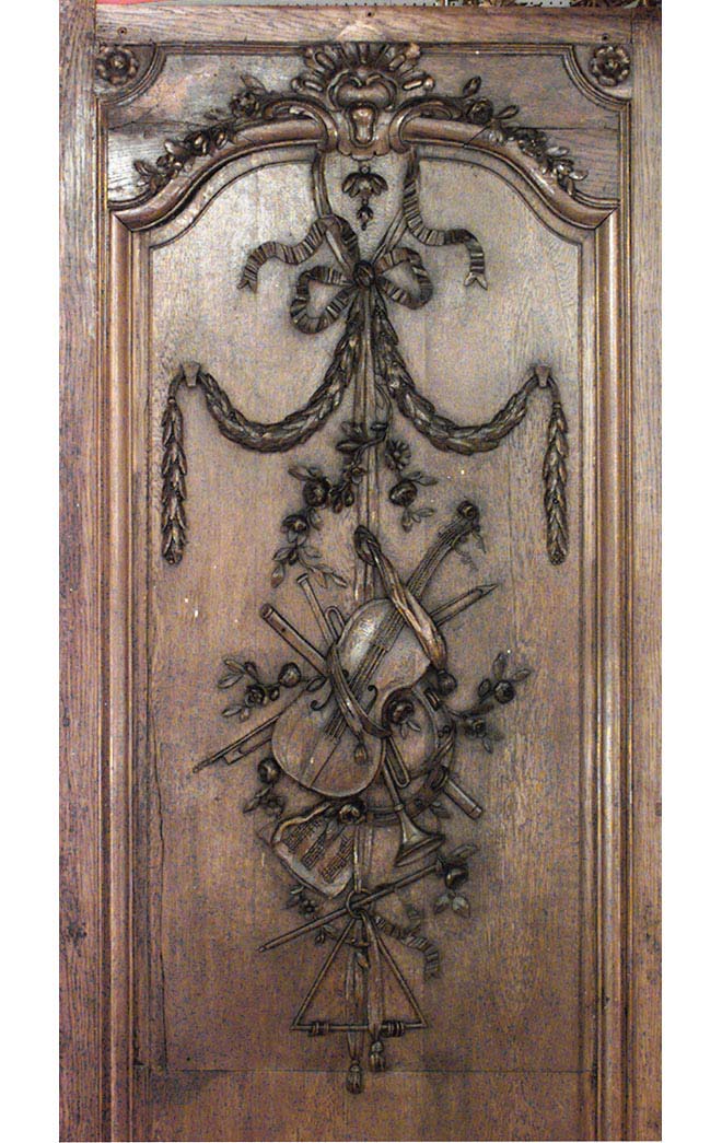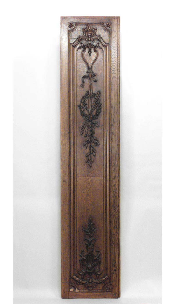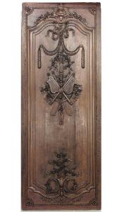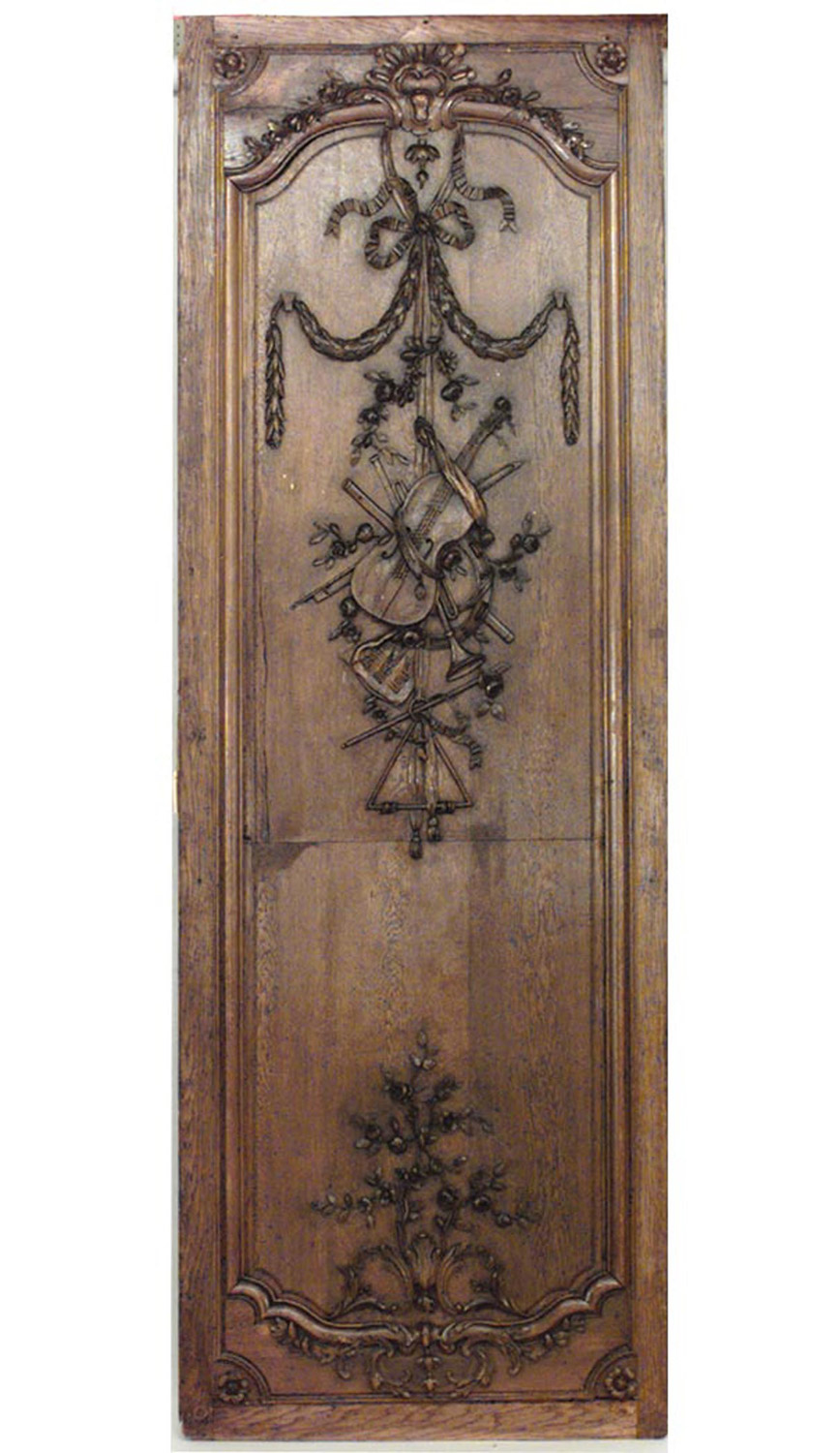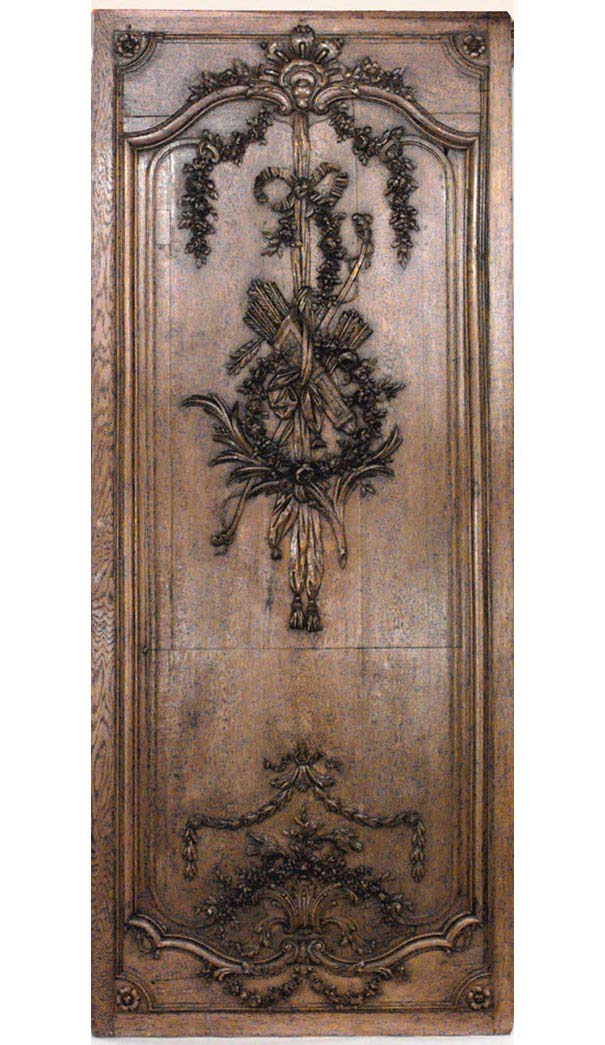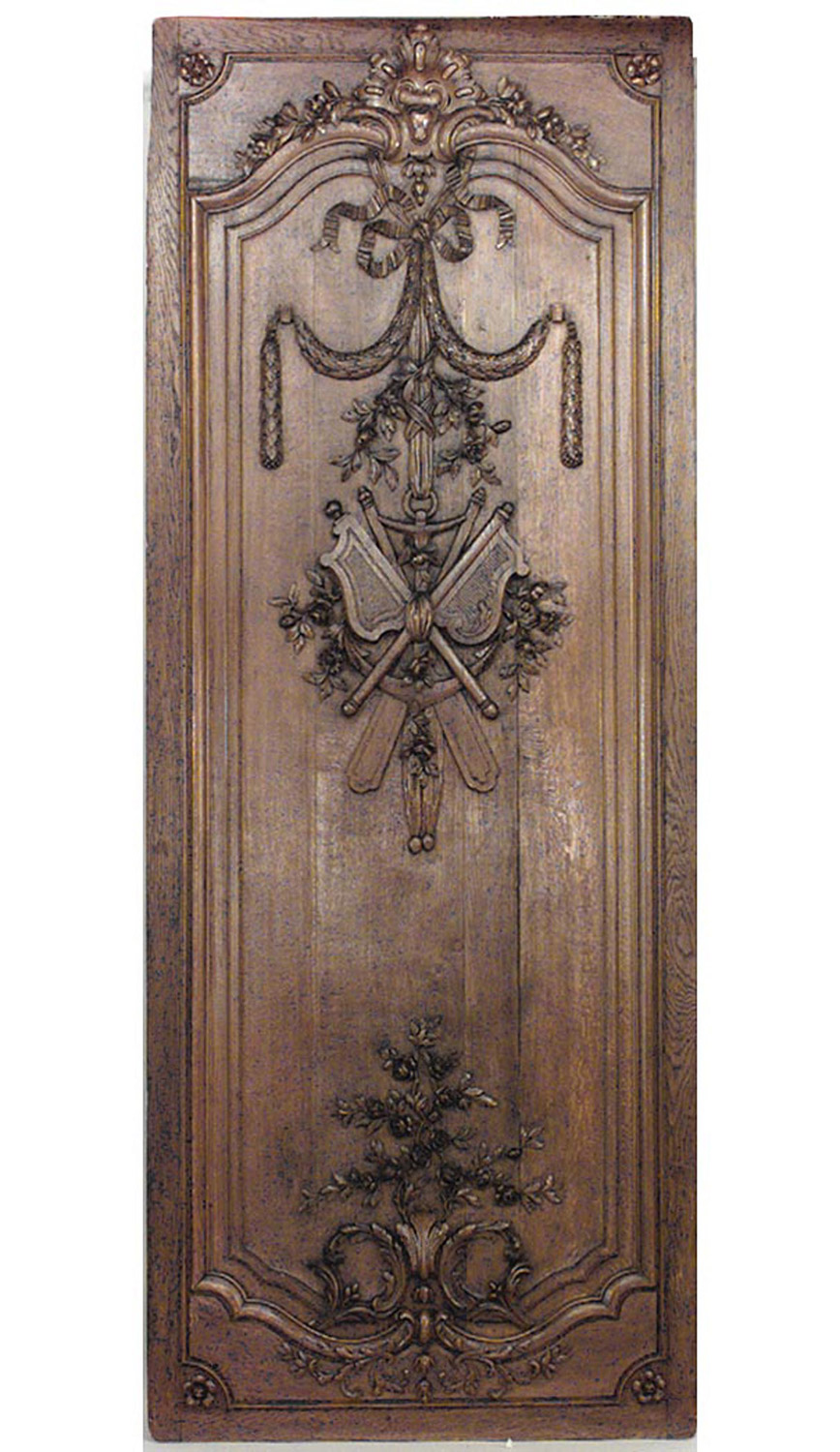 Thirty-two French Regence style (19th Century) oak paneled room with trophy carving. Approximately 50 running feet. Individual panel measurements: 29.5" W x 1" D x 120" H 18.5" W x 1" D x 120" H 14" W x 3.5" D x 120" H
