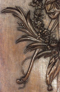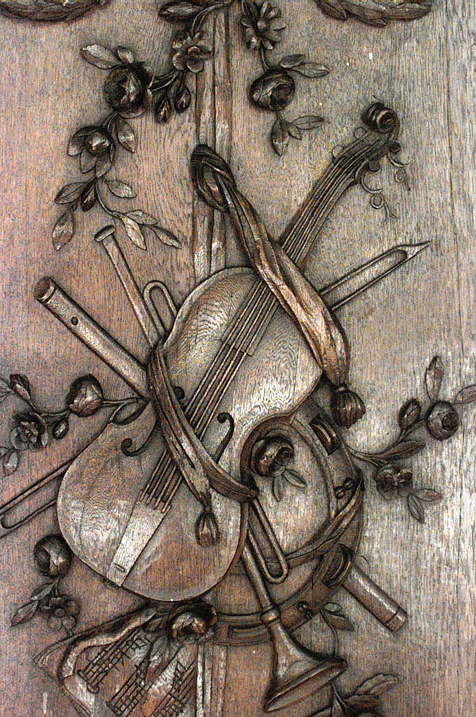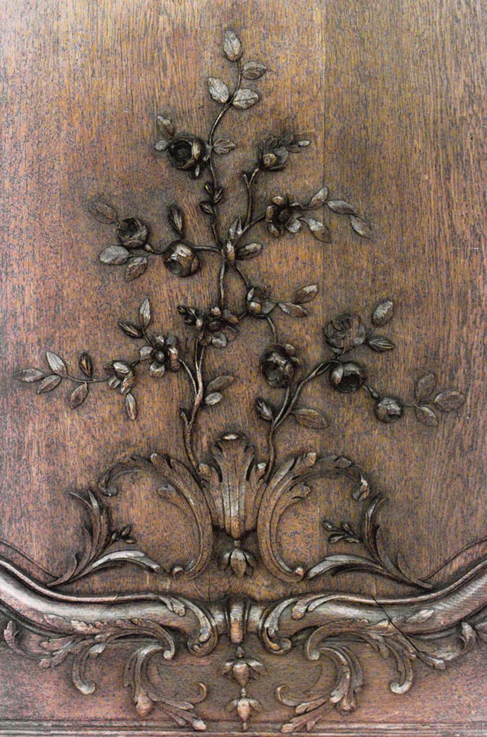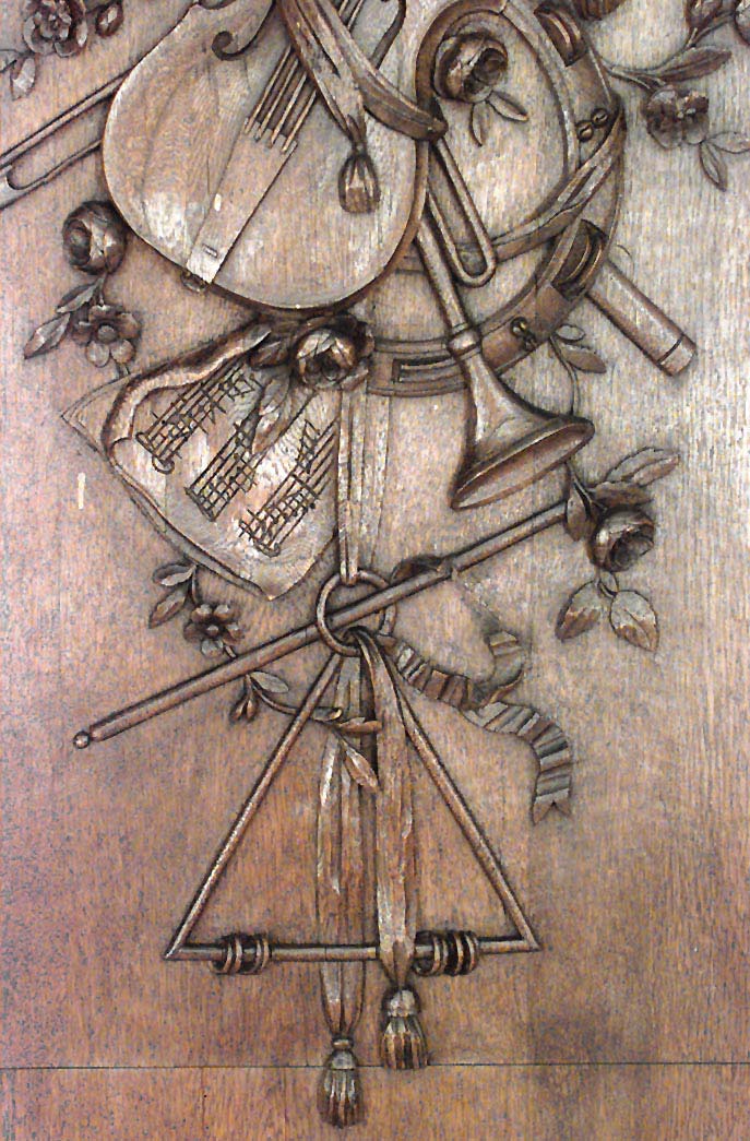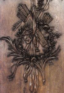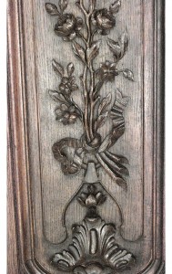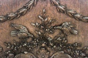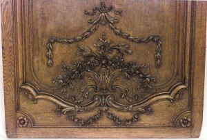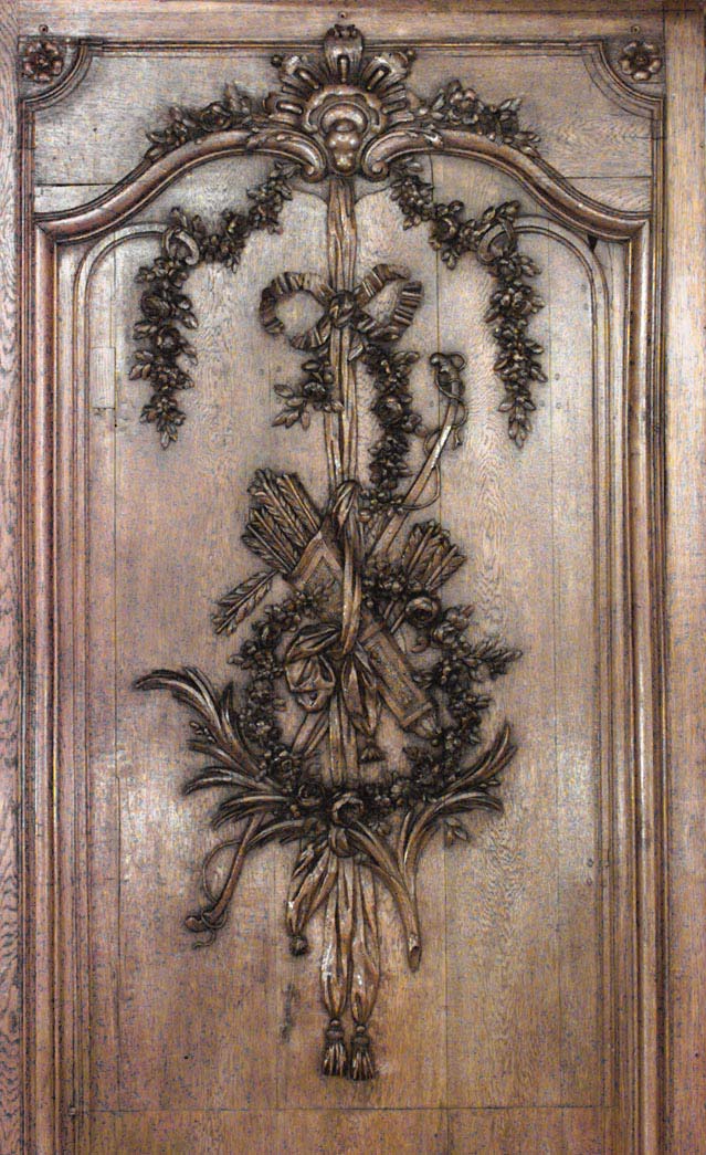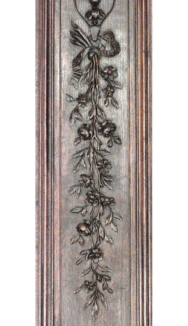 Thirty-two French Regence style (19th Century) oak paneled room with trophy carving. Approximately 50 running feet. Individual panel measurements: 29.5" W x 1" D x 120" H 18.5" W x 1" D x 120" H 14" W x 3.5" D x 120" H