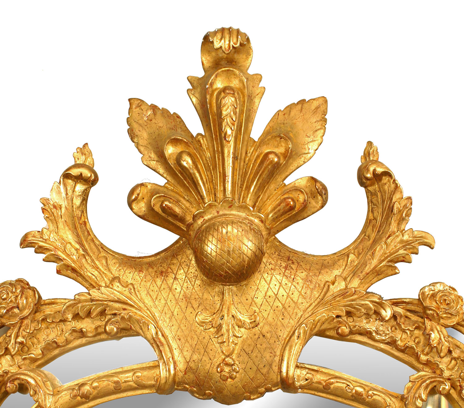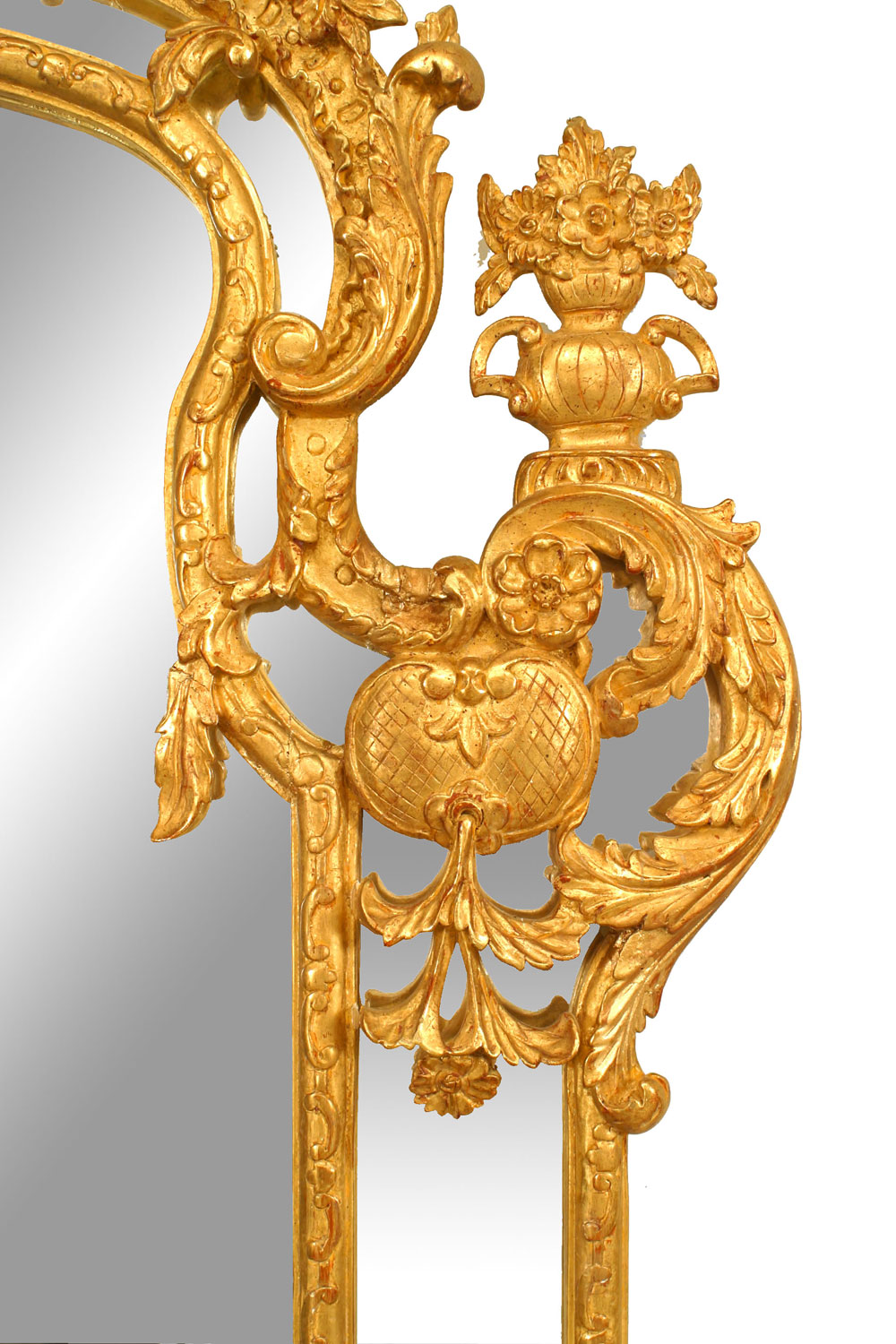 French Regency-style (20th Century) gilt vertical wall mirror with carved pediment top and floral and urn design with carved shell design feet.