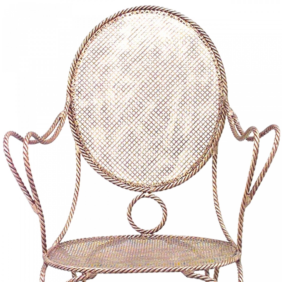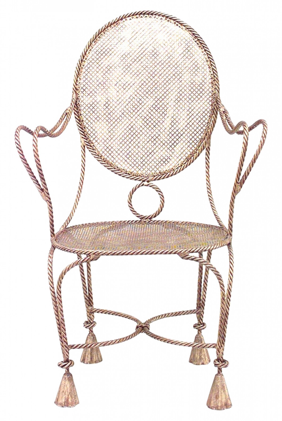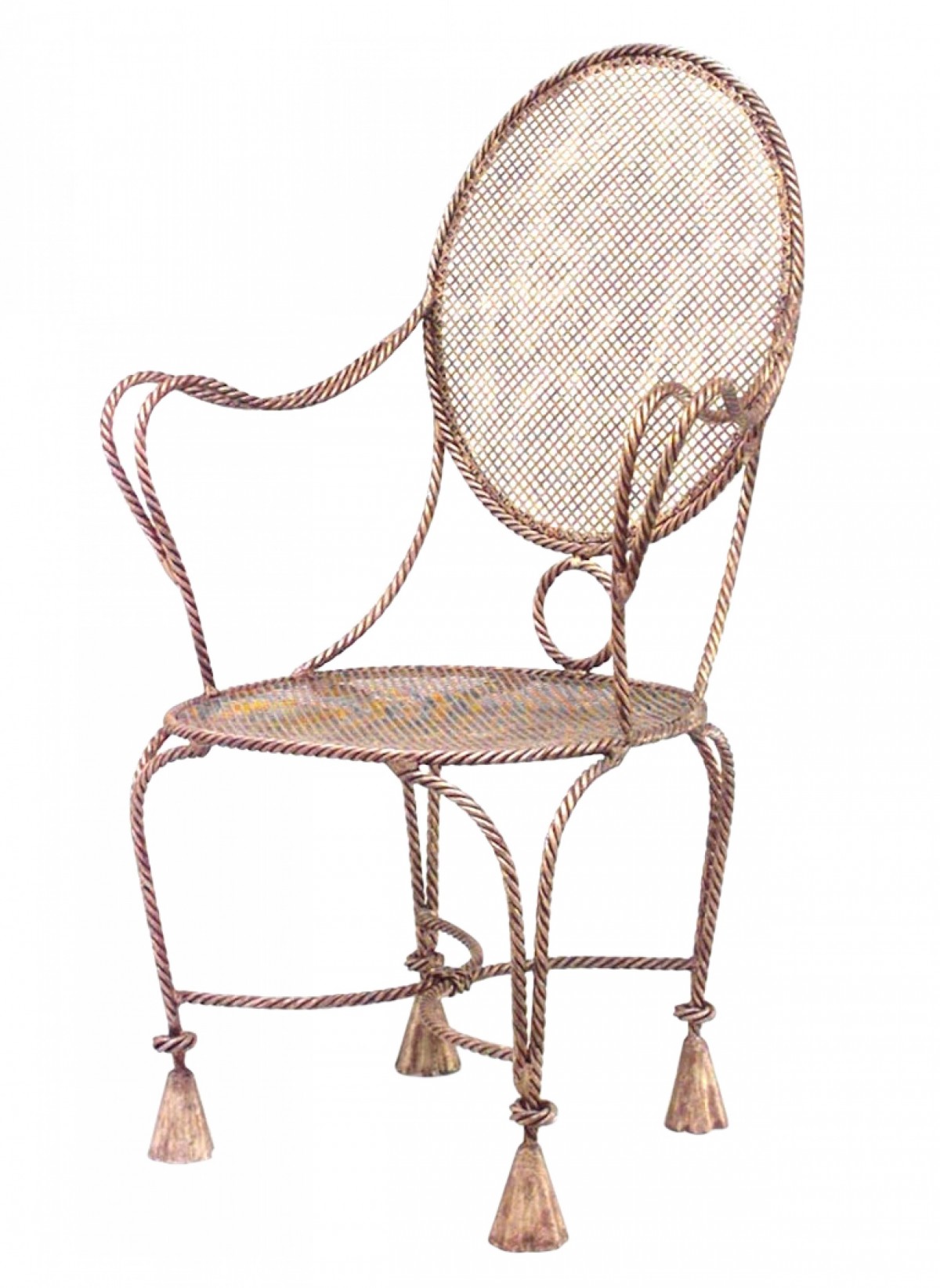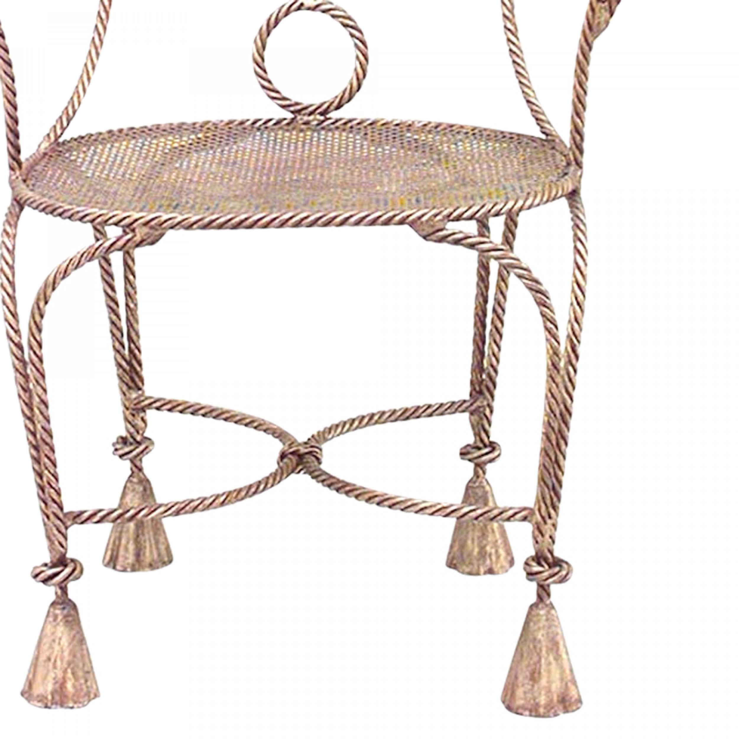 3 French 1940s style rope and tassel design gilt metal arm chairs with oval mesh seat and back. (PRICED EACH)