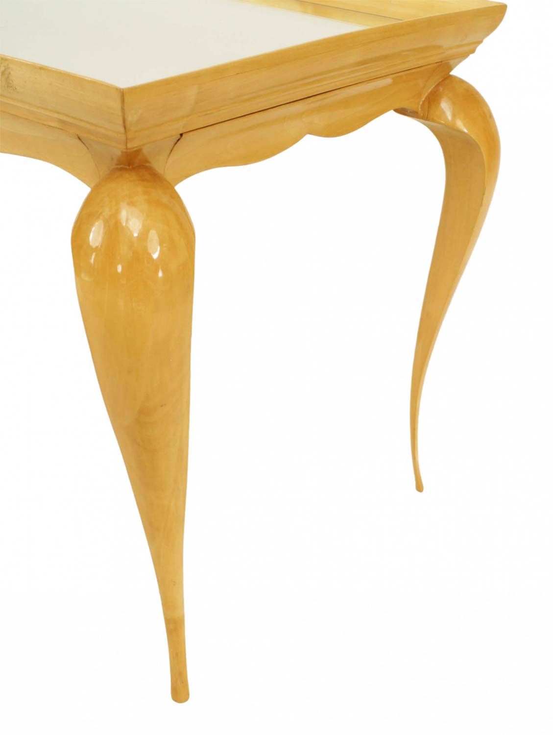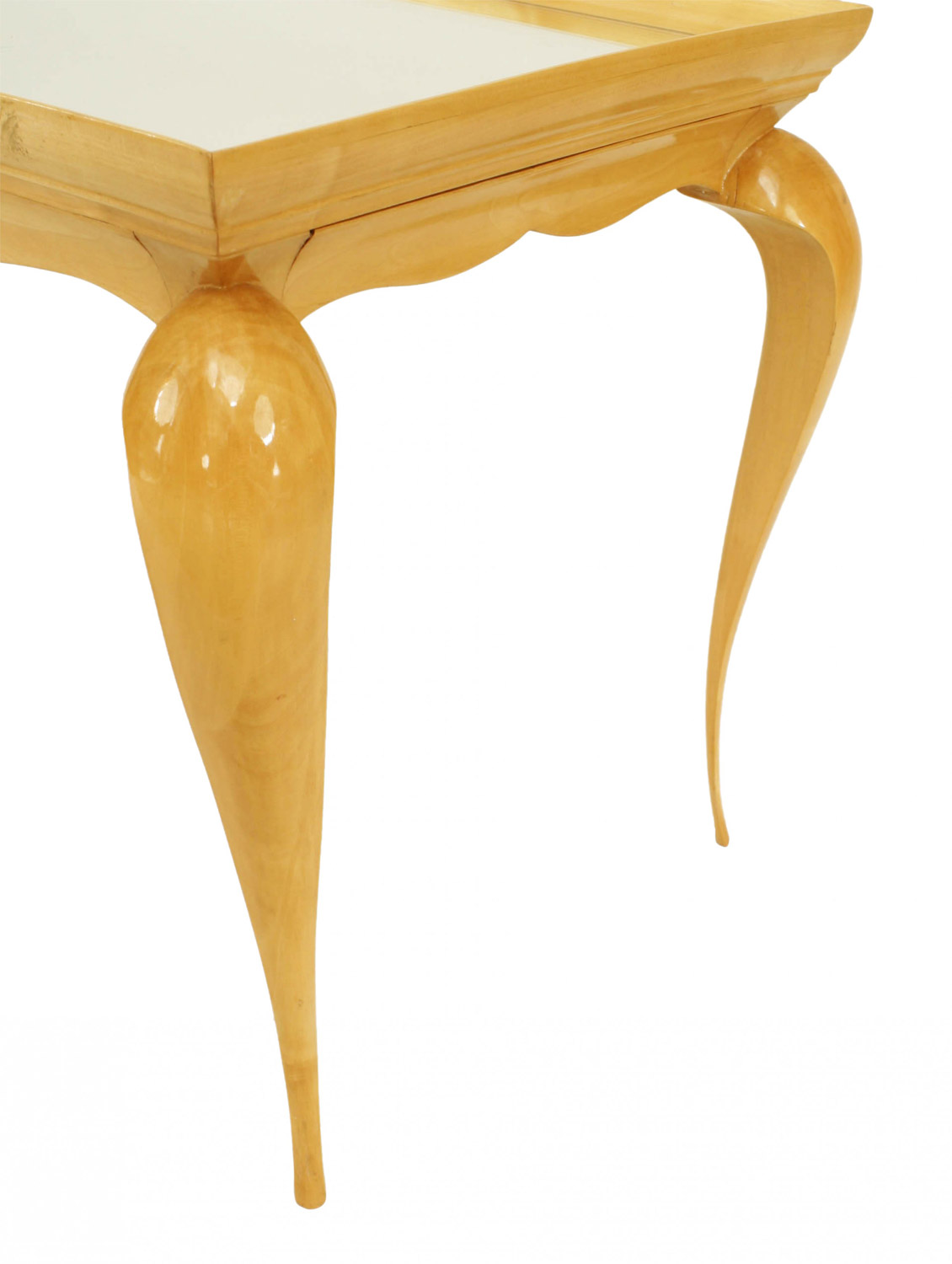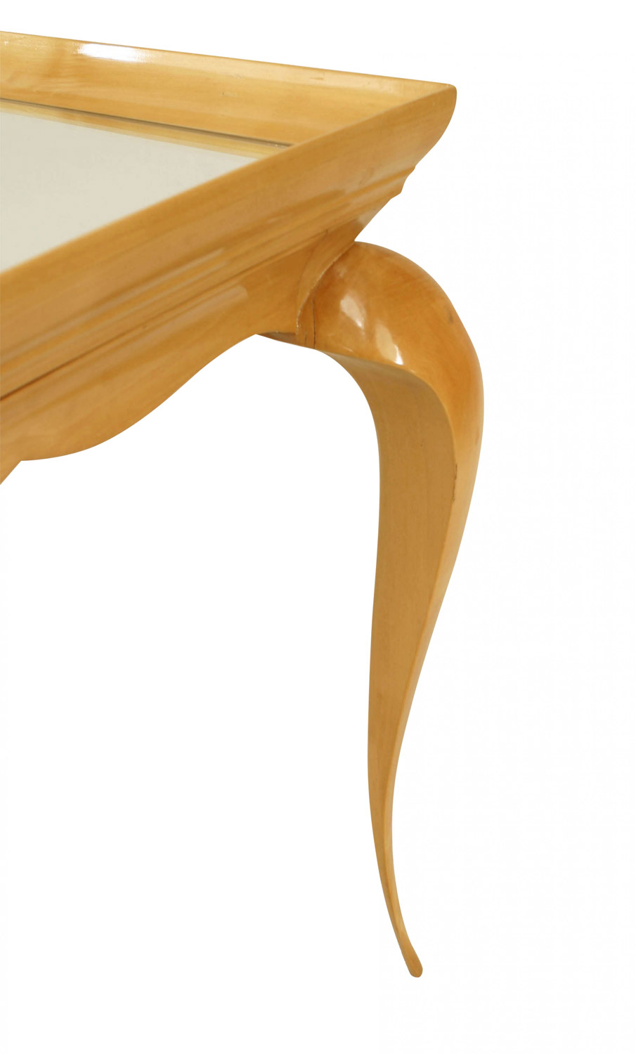 French 1930s rectangular sycamore coffee table with tapered cabriole legs, an inset mirrored top, and a shaped apron.