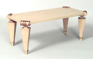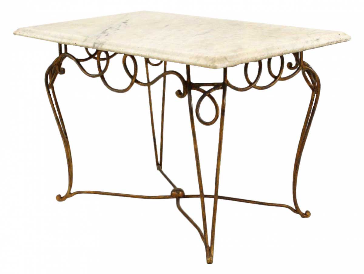 French (1940s) ormolu and travertine marble coffee table with rectangular top above scroll-headed tapering legs.