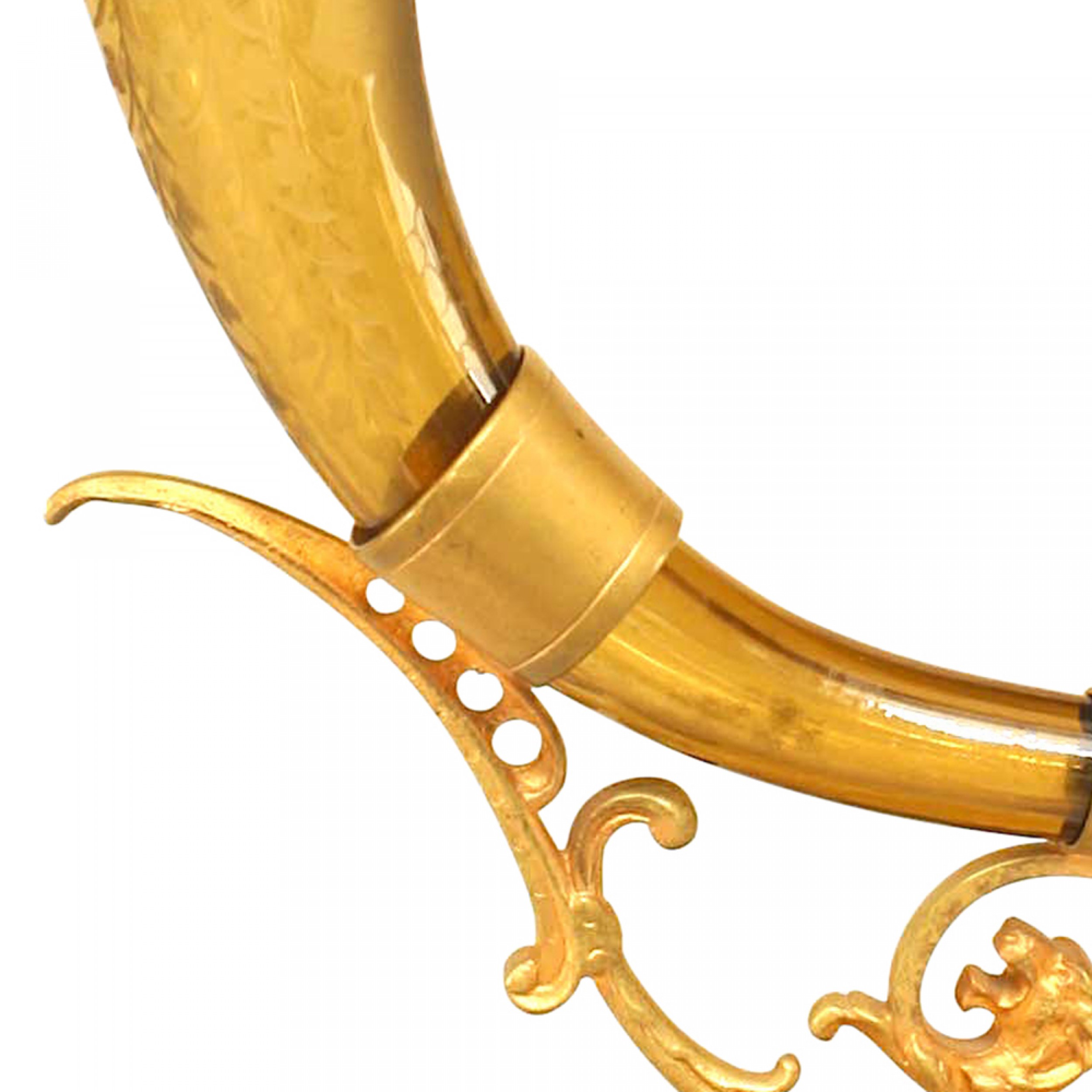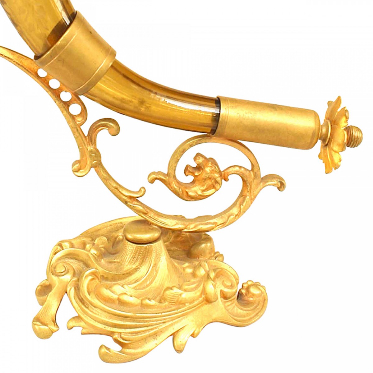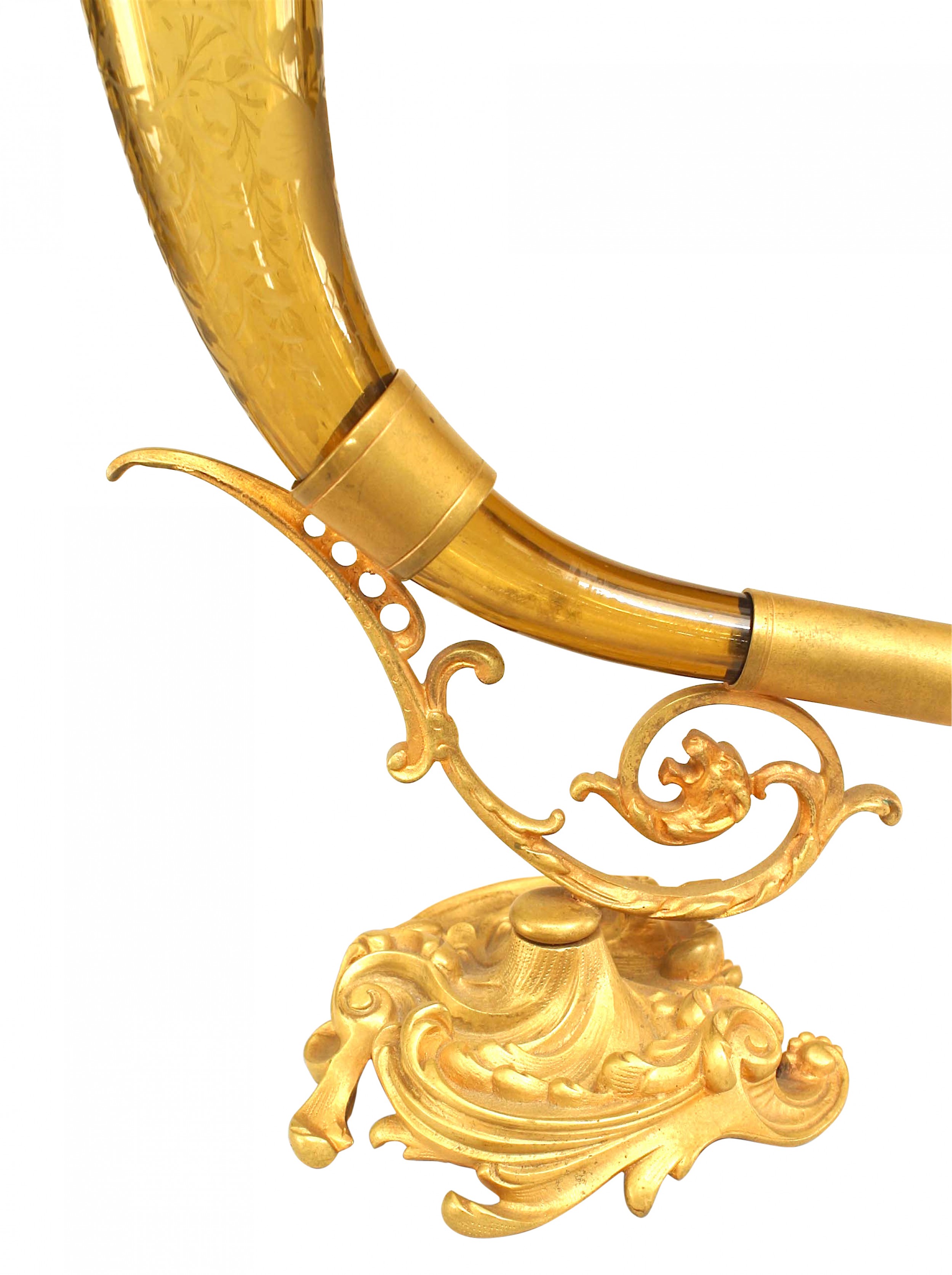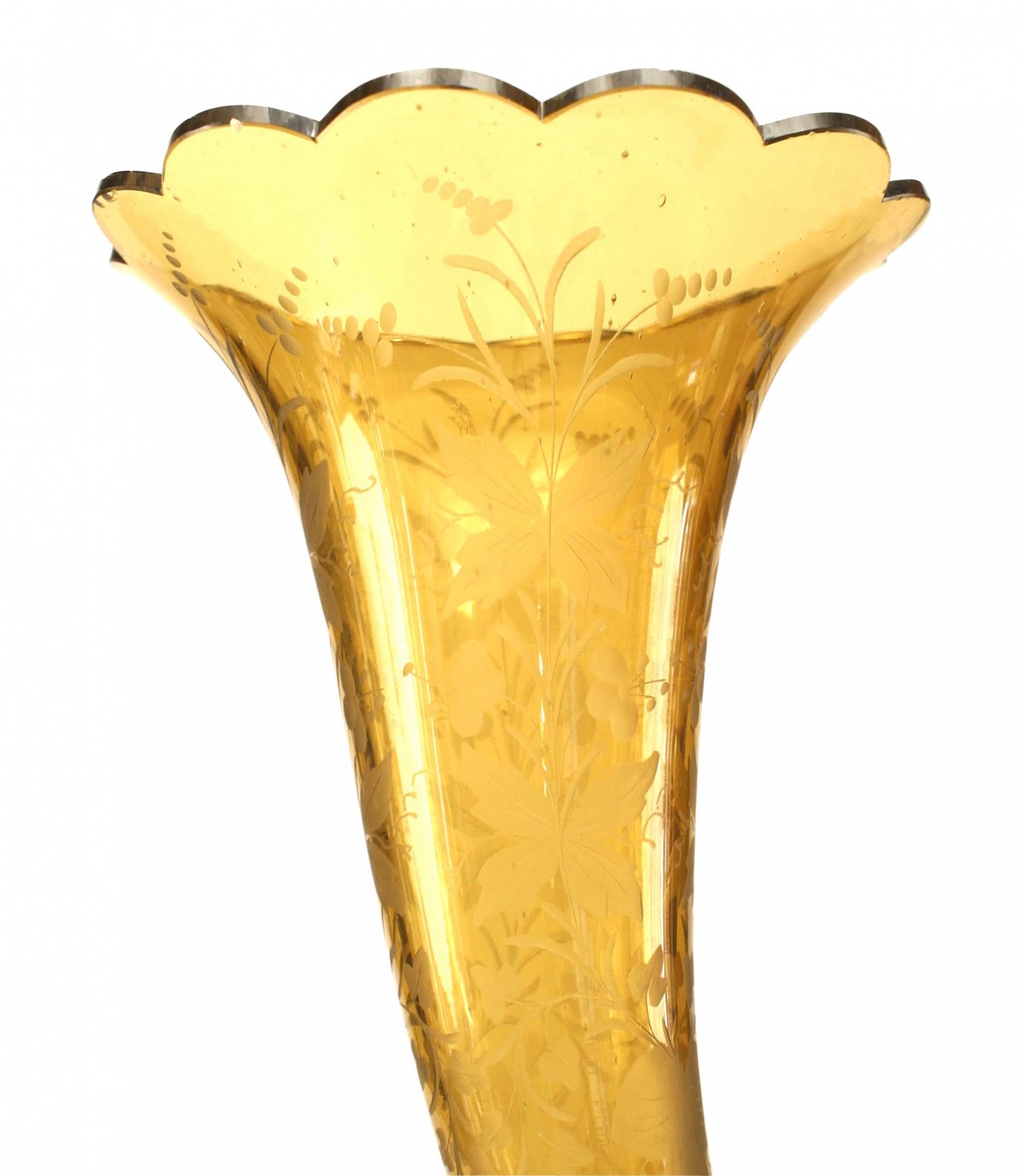 French Victorian amber crystal vase with scalloped edge, & overall etched with foliate detail and mounted on a gilt bronze scroll form base.