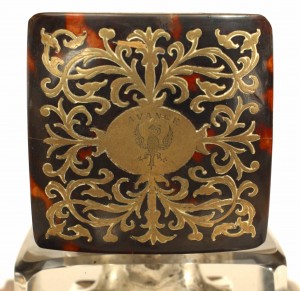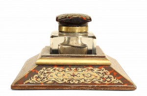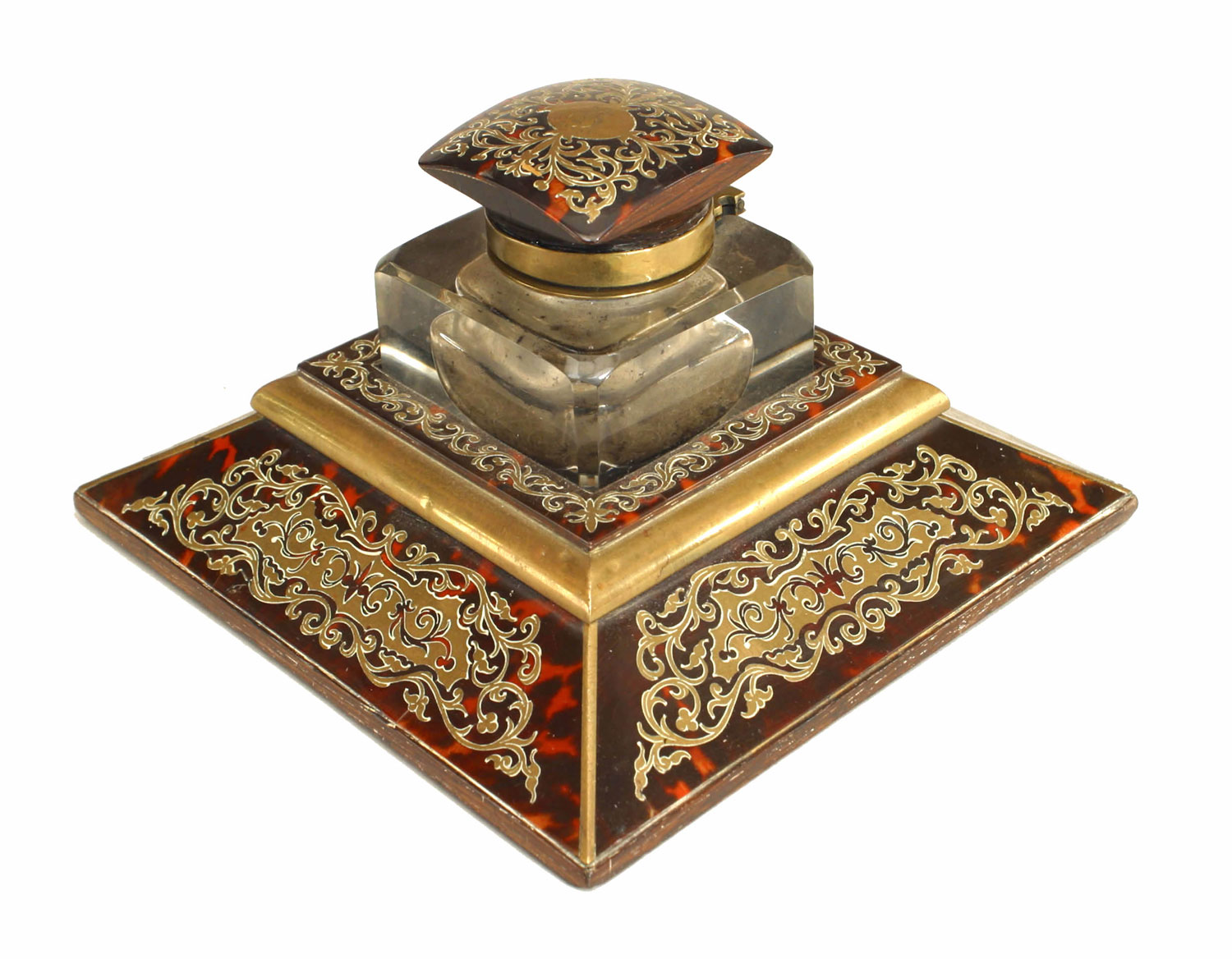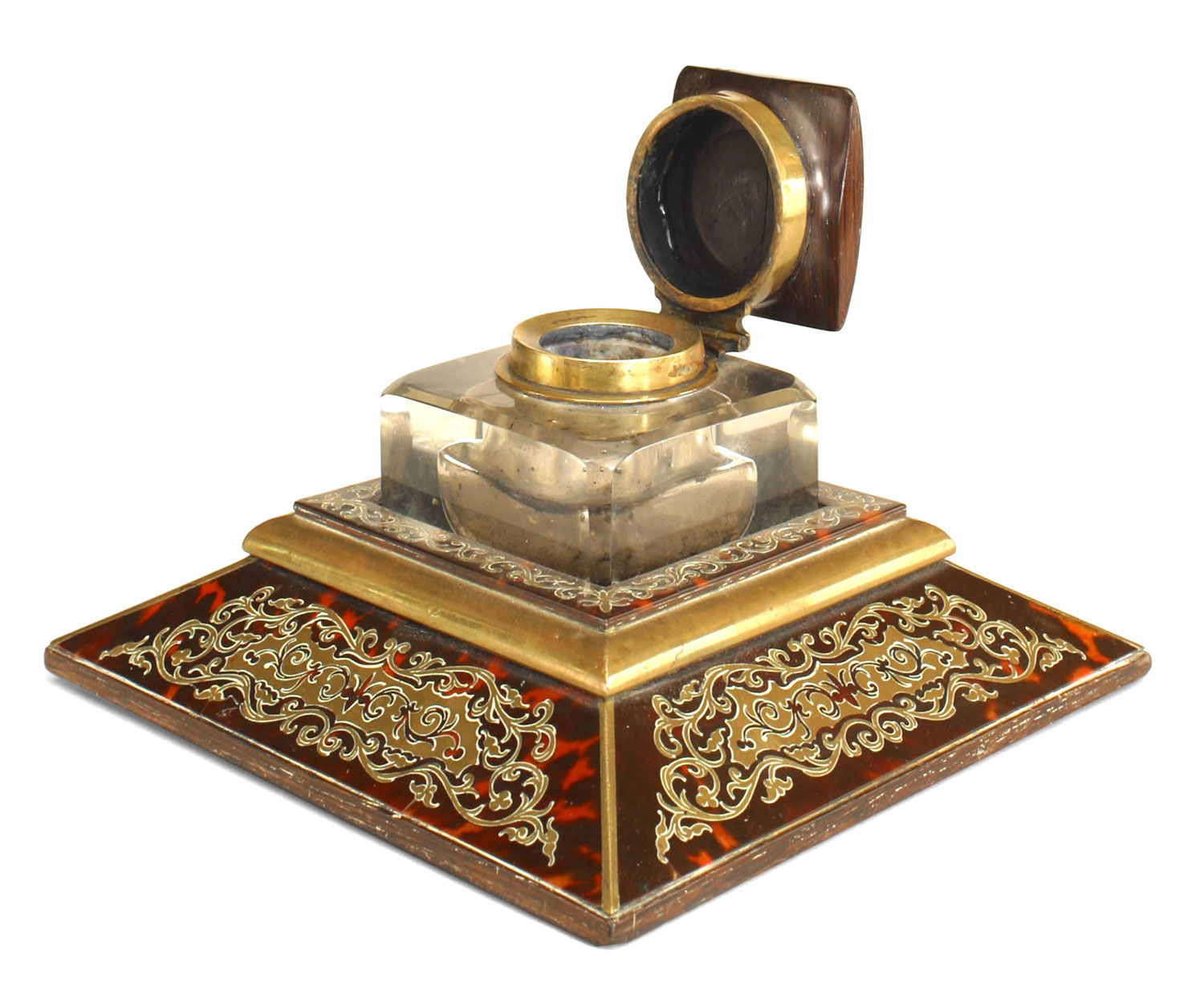 French Victorian Boulle-style square tortoise shell and brass inlaid inkwell with crystal well.