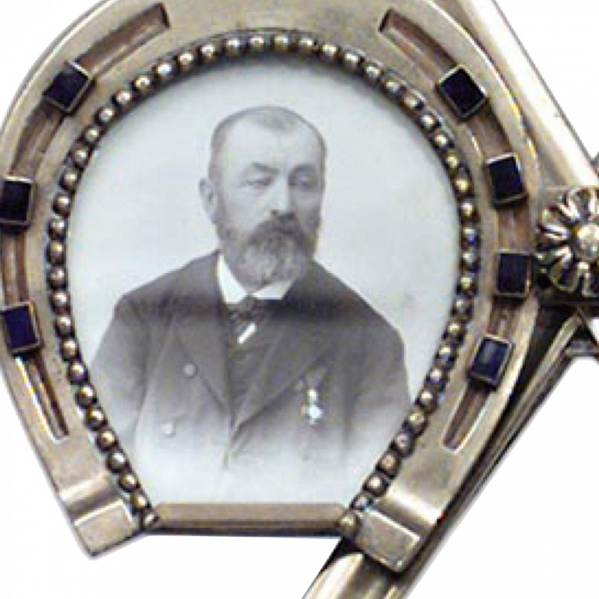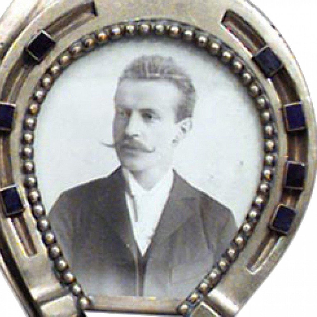 French Victorian enamel and brass easel picture frame of two horse shoes with crossed swords.
