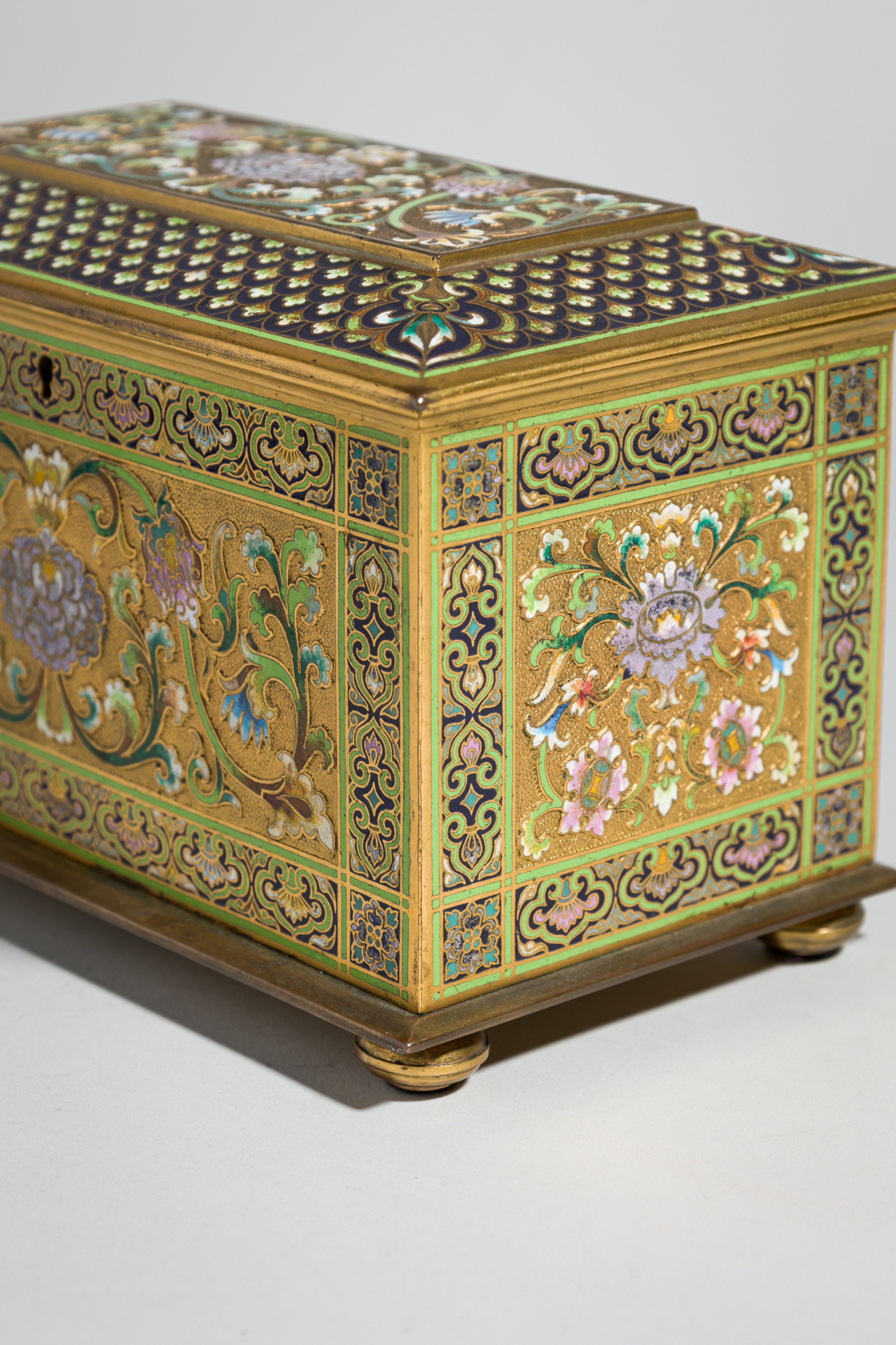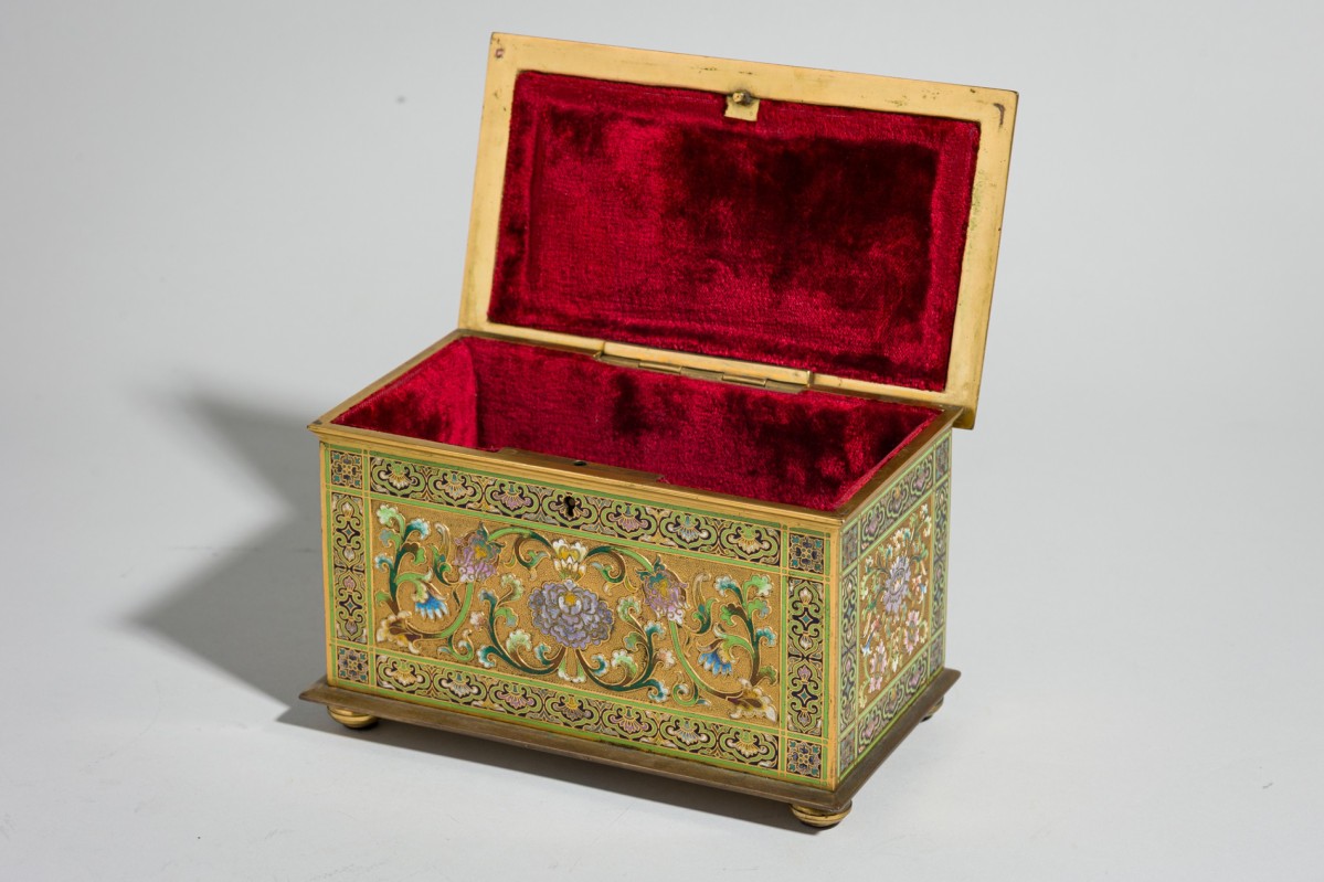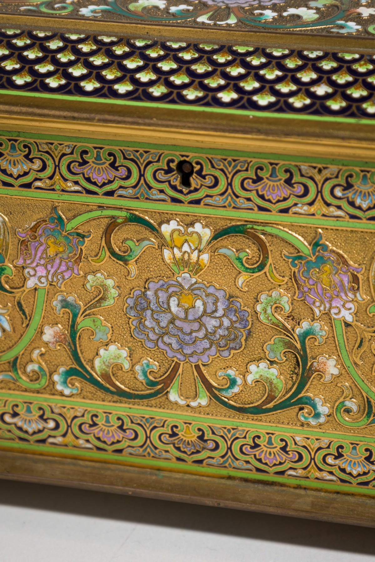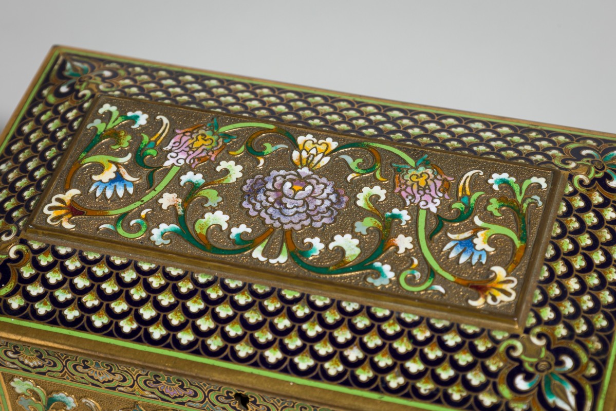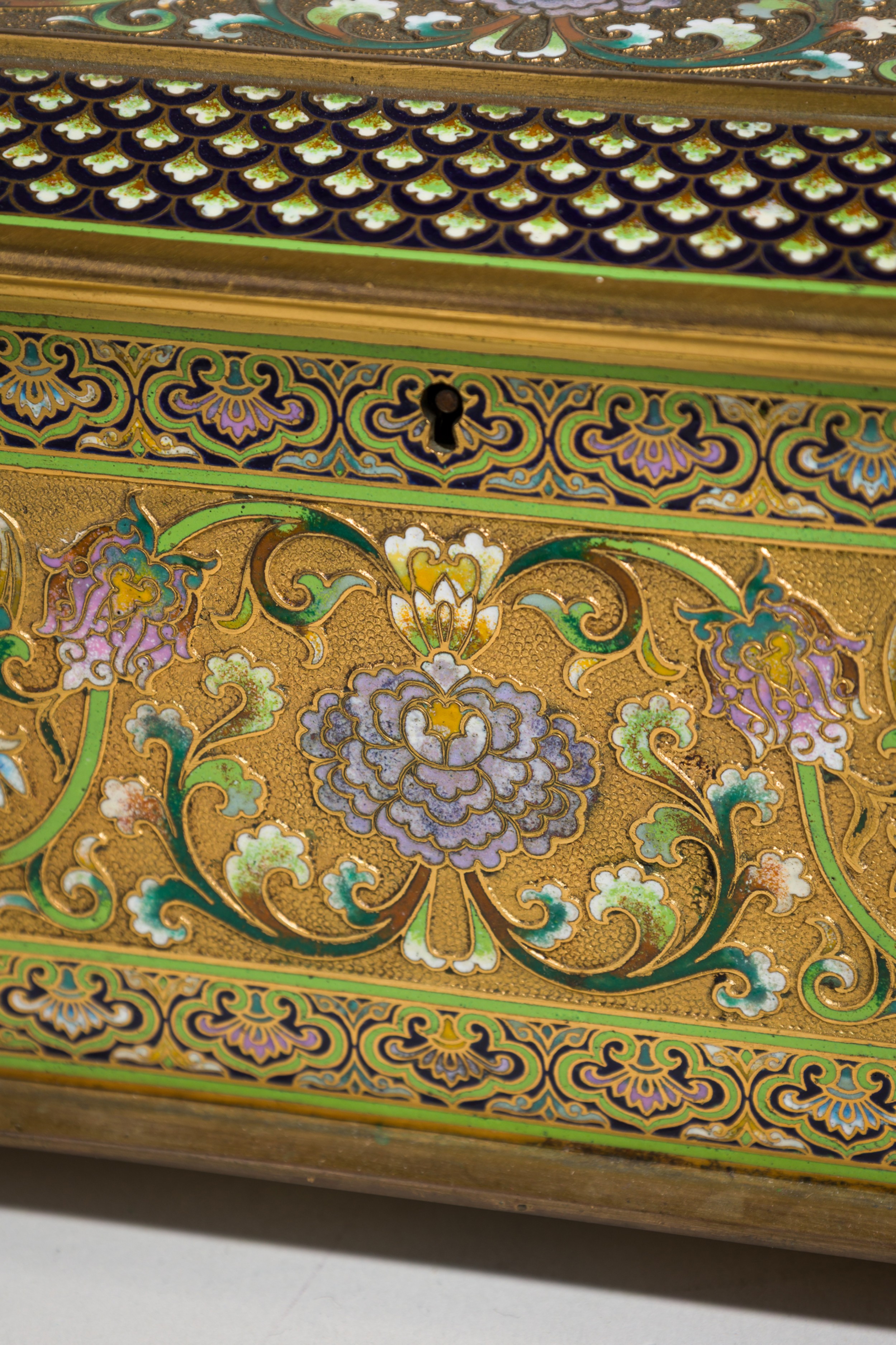 French Victorian bronze and multicolored enamel cloisonne box with floral and scroll design with red velvet interior