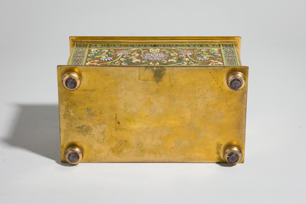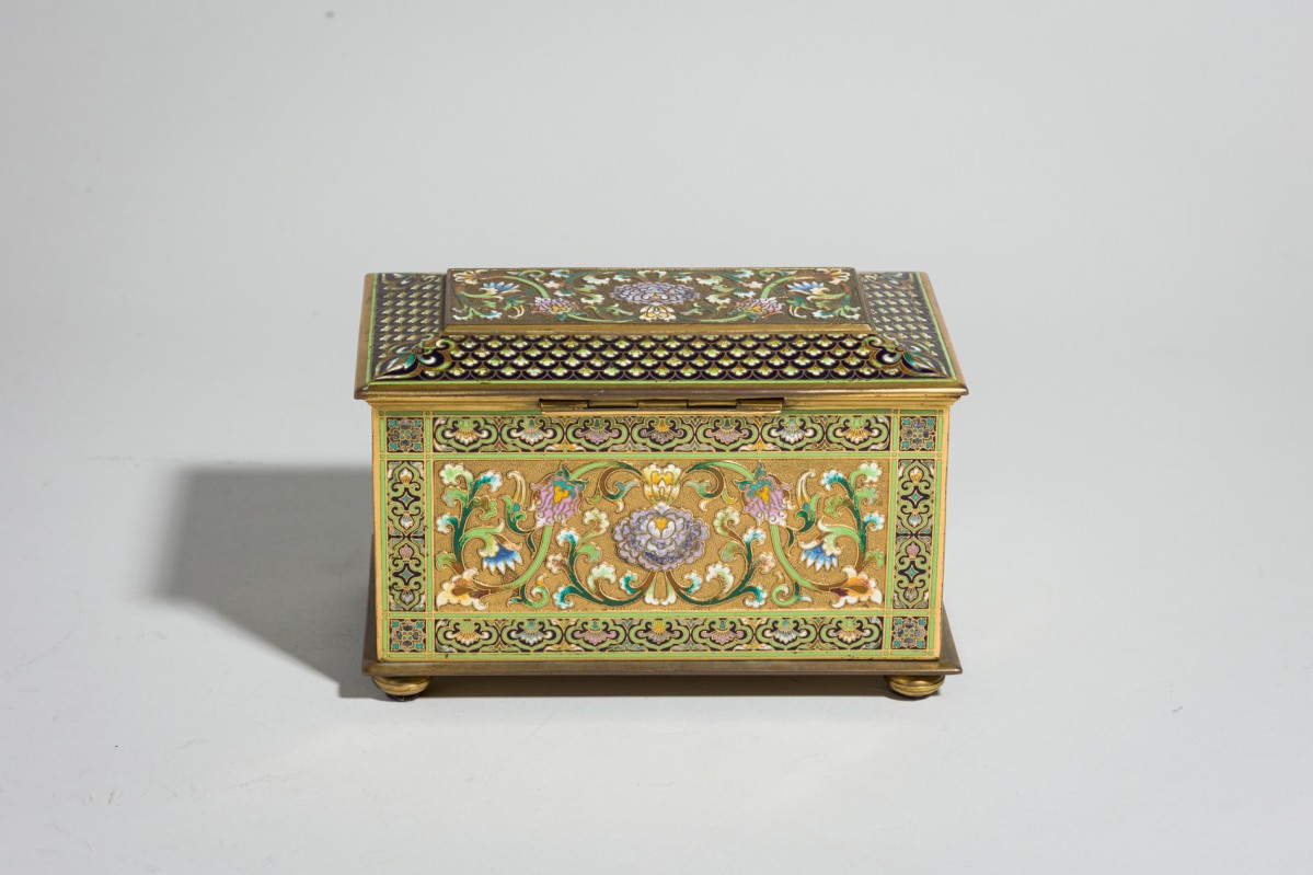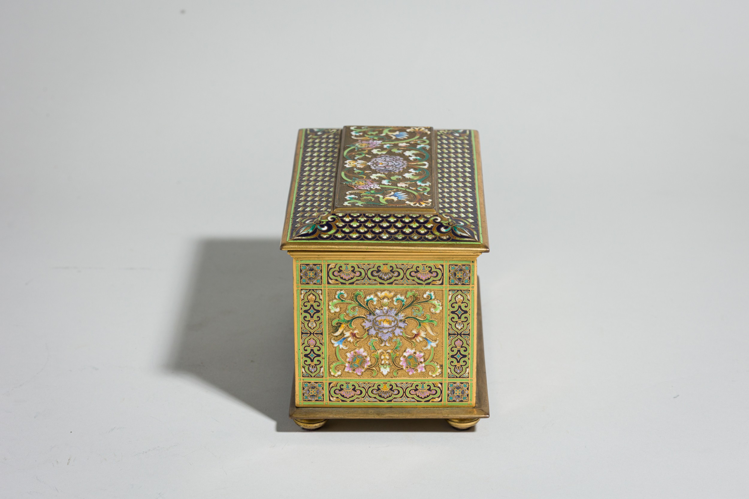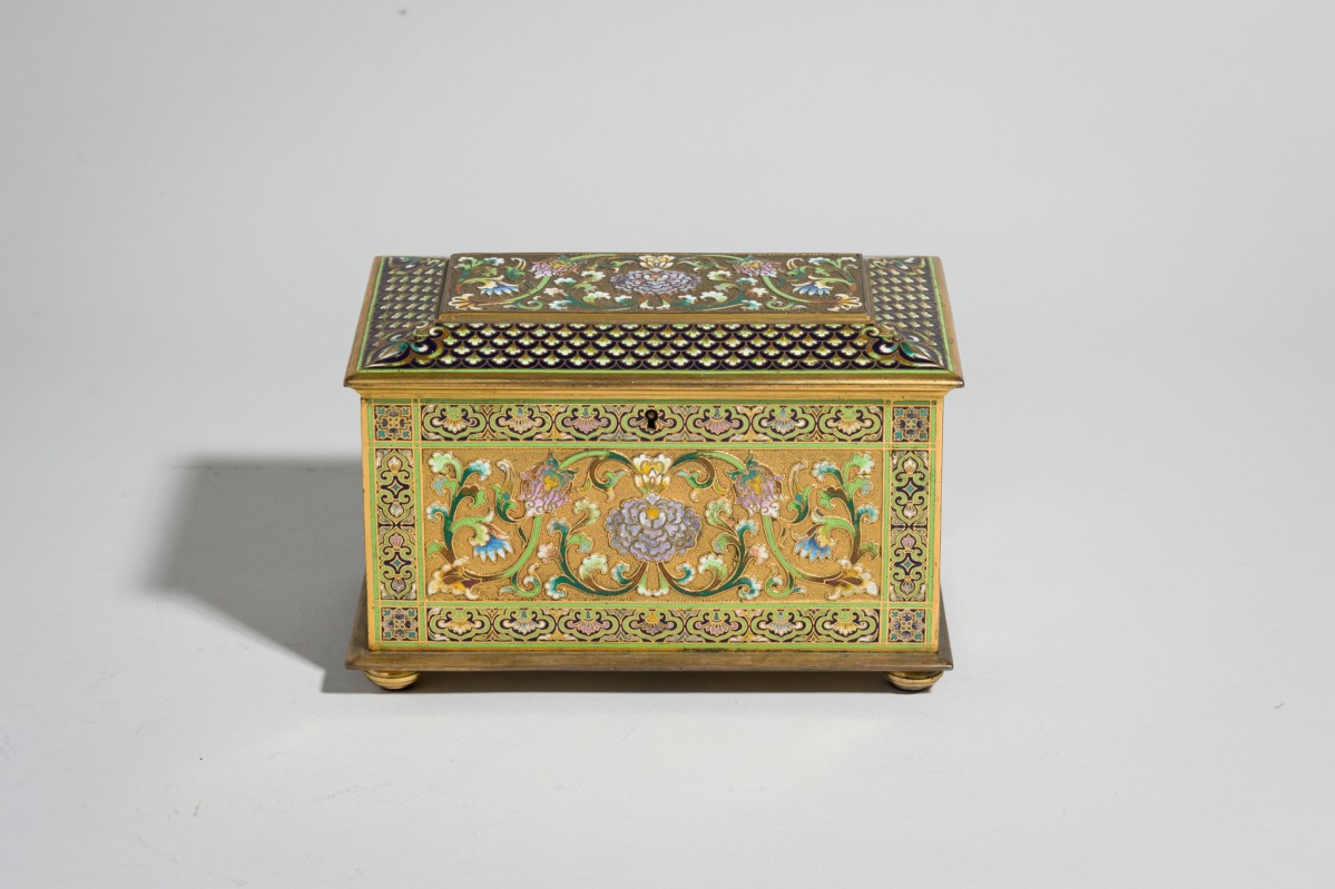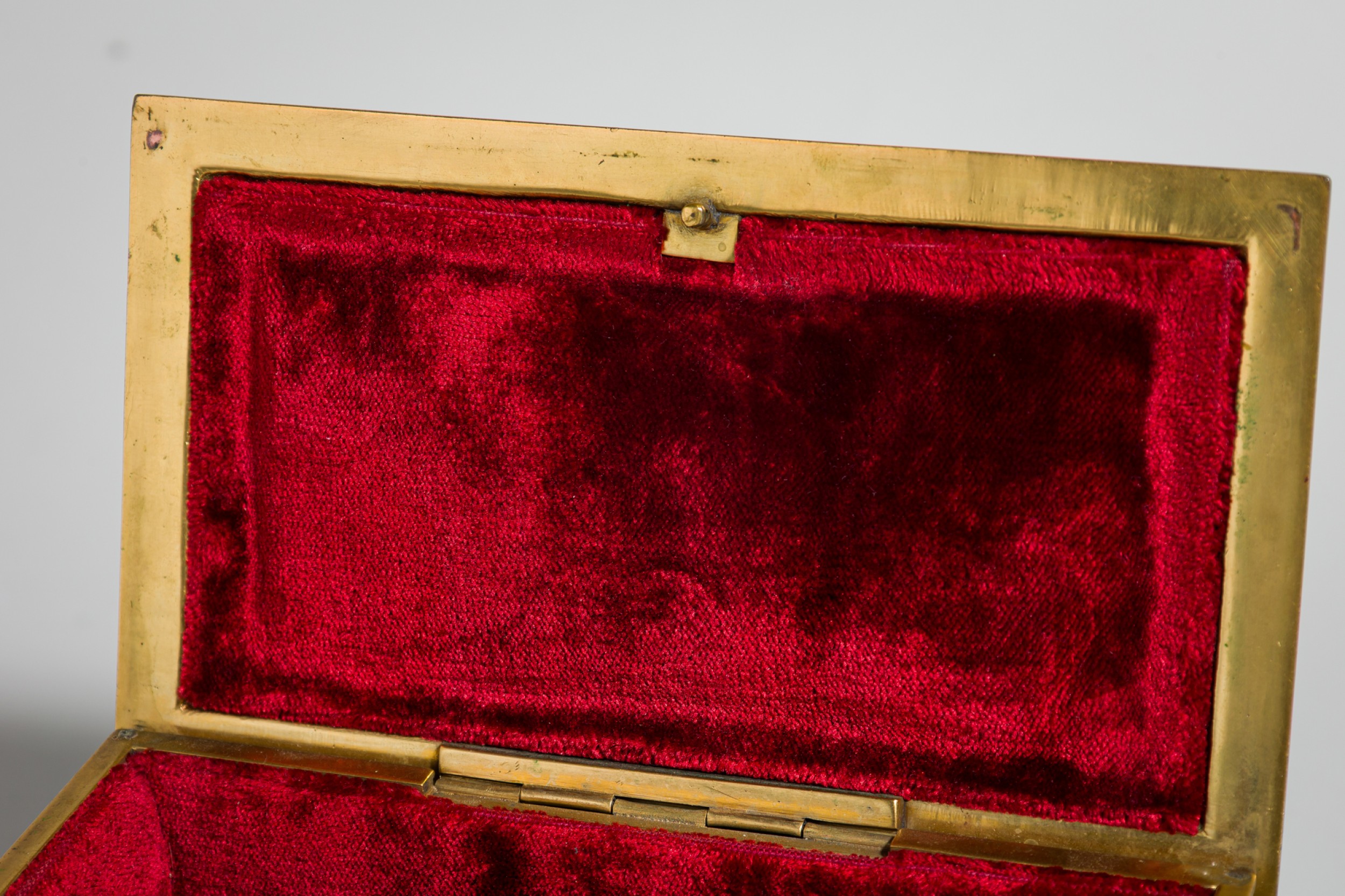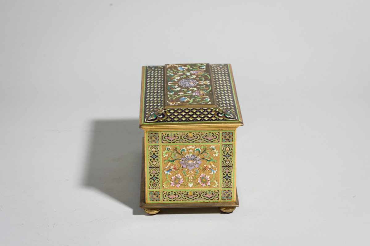 French Victorian bronze and multicolored enamel cloisonne box with floral and scroll design with red velvet interior