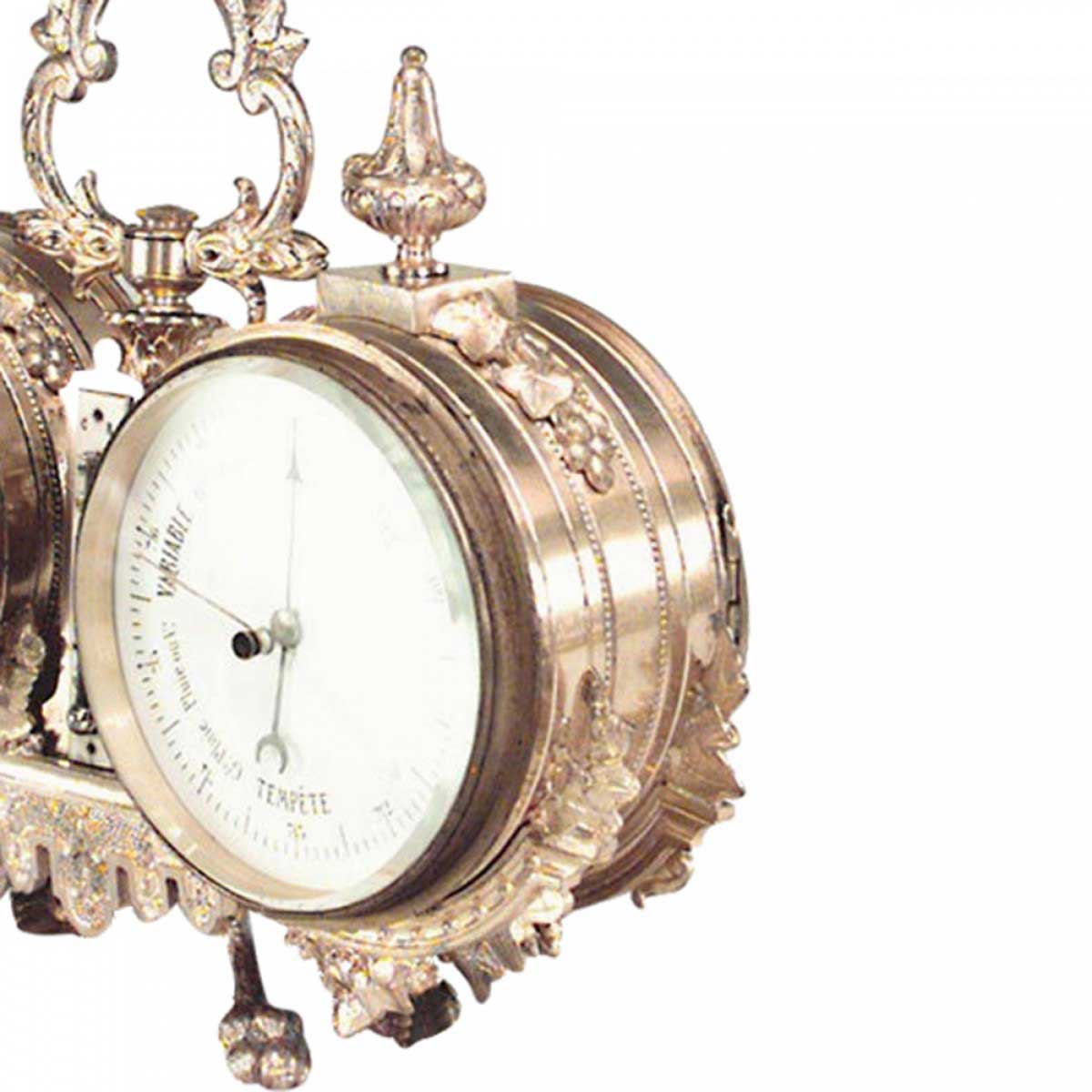 French Victorian small bronze round shaped desk clock and barometer with handle. (Not working)