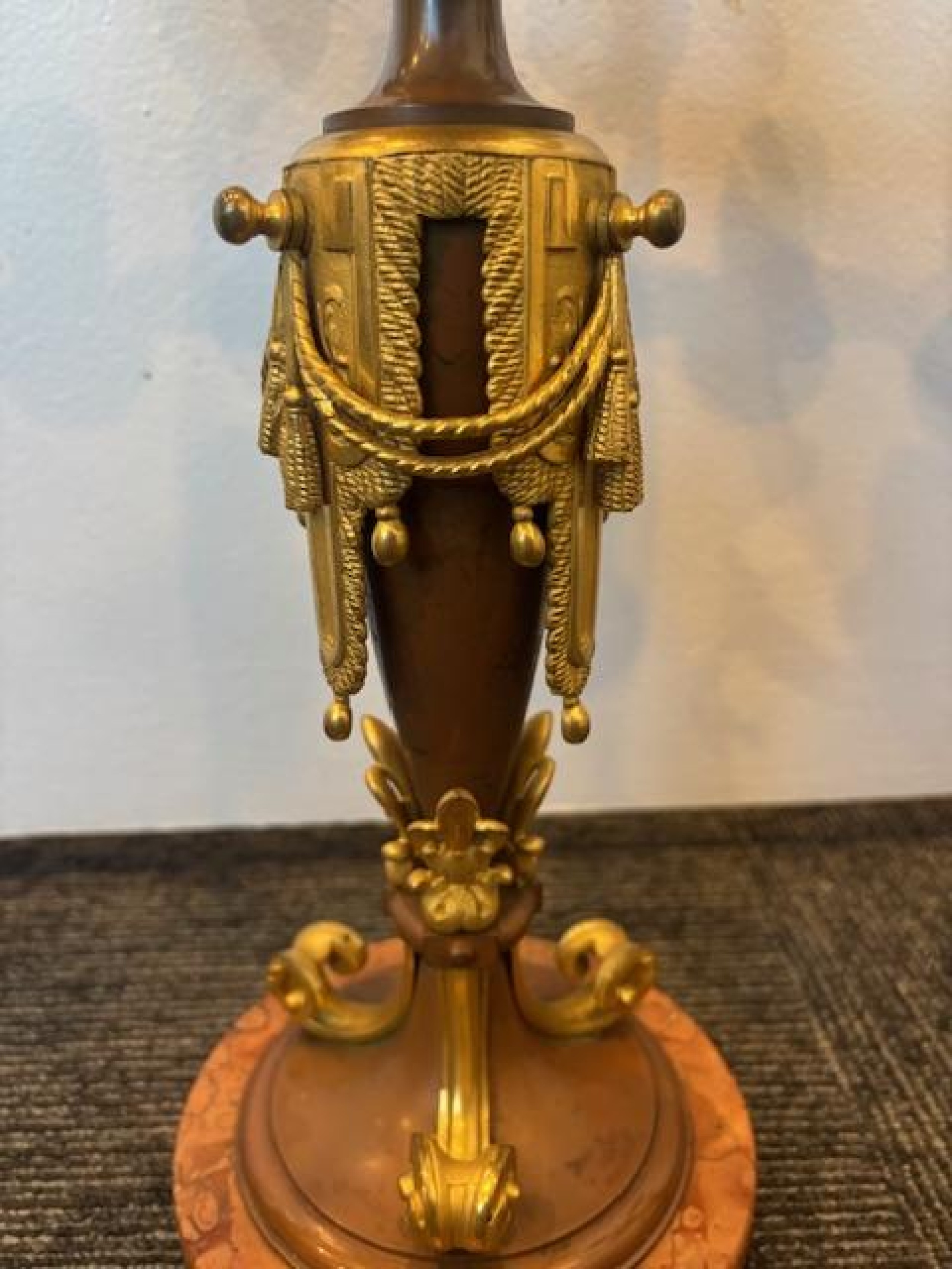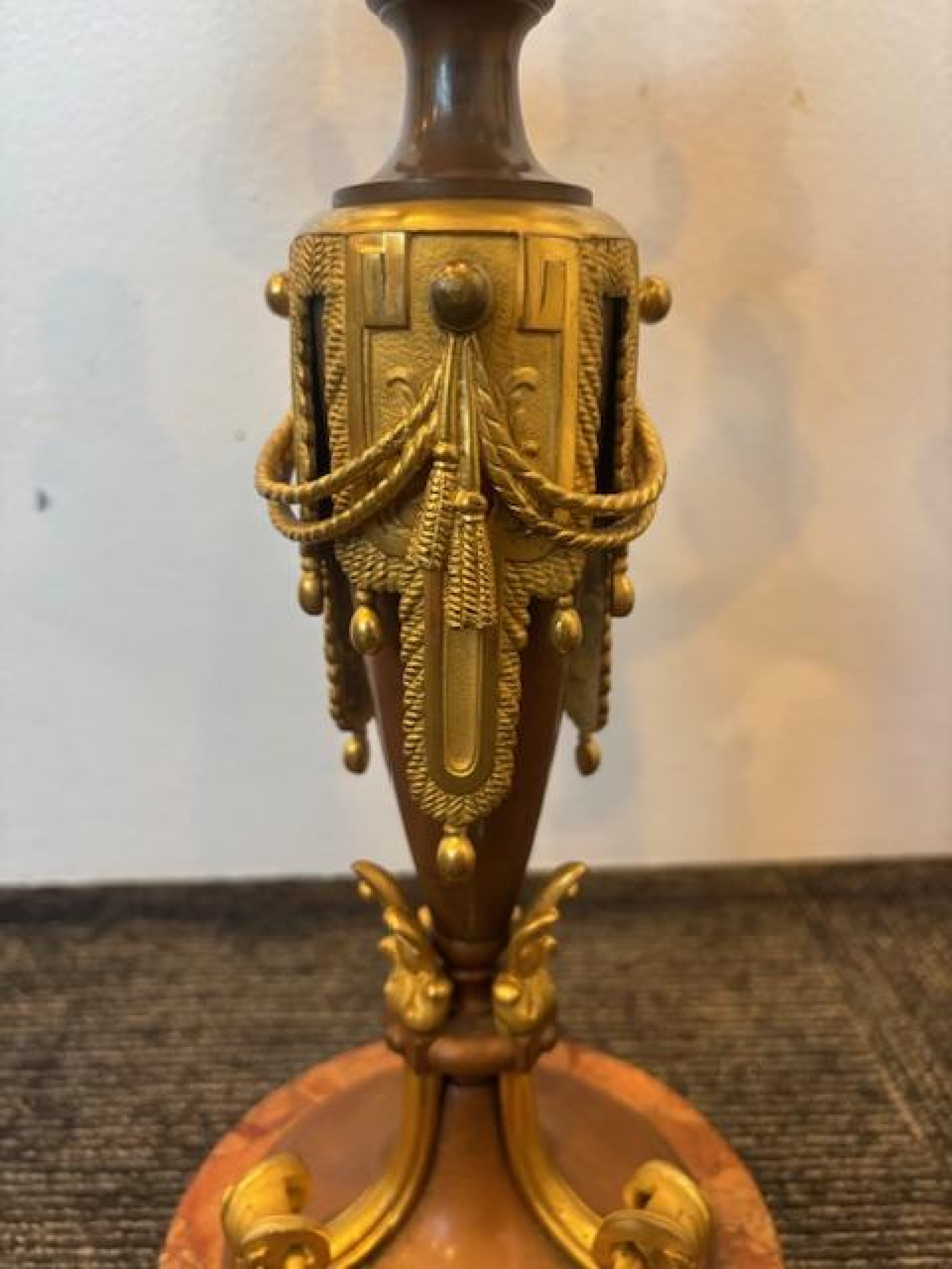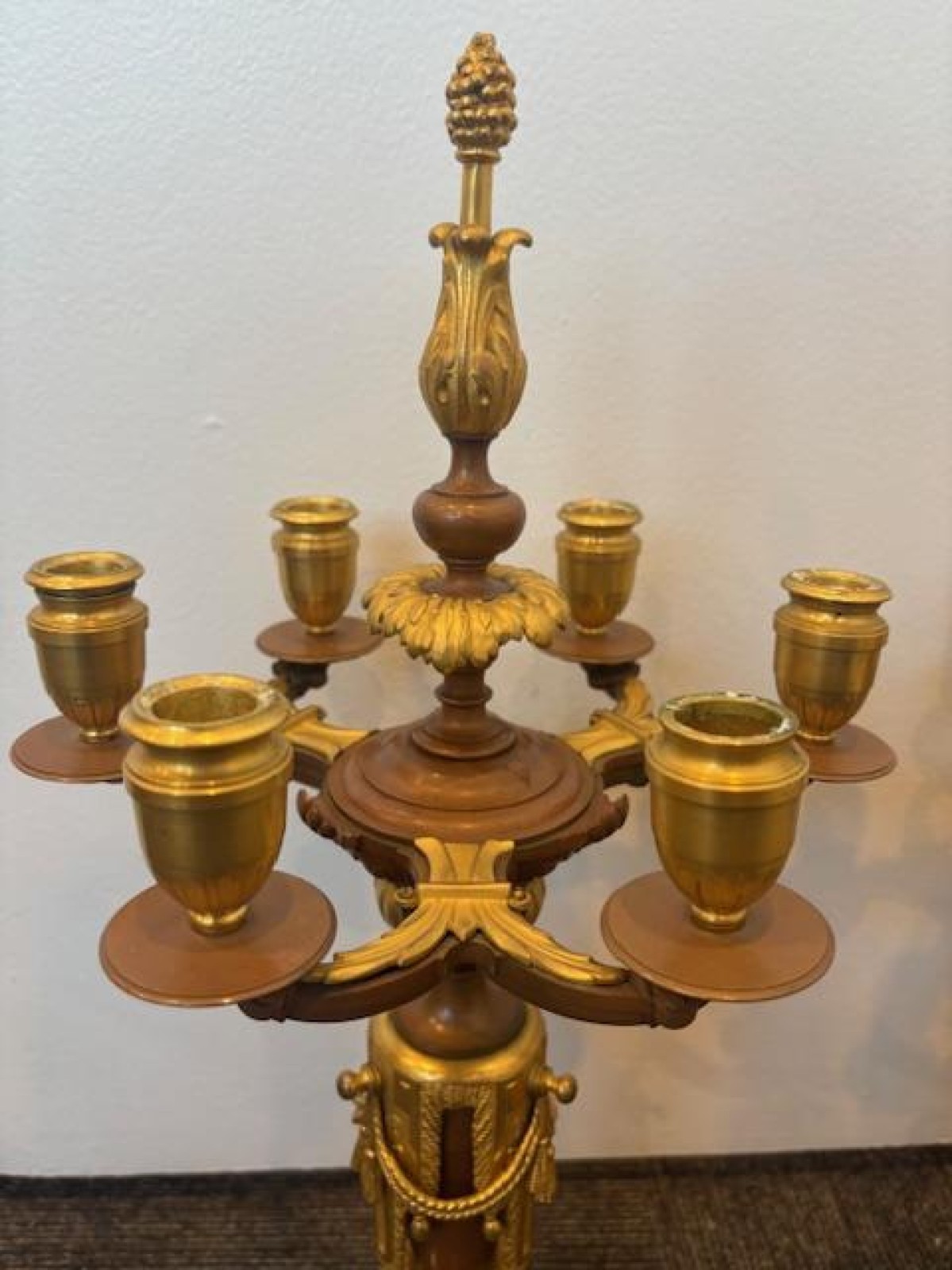 PAIR of French Victorian (19/20th Century) brown bronze and gilt trim candelabra having 6 arms and swag design with a finial top resting on a round brown marble base (PRICED AS PAIR)