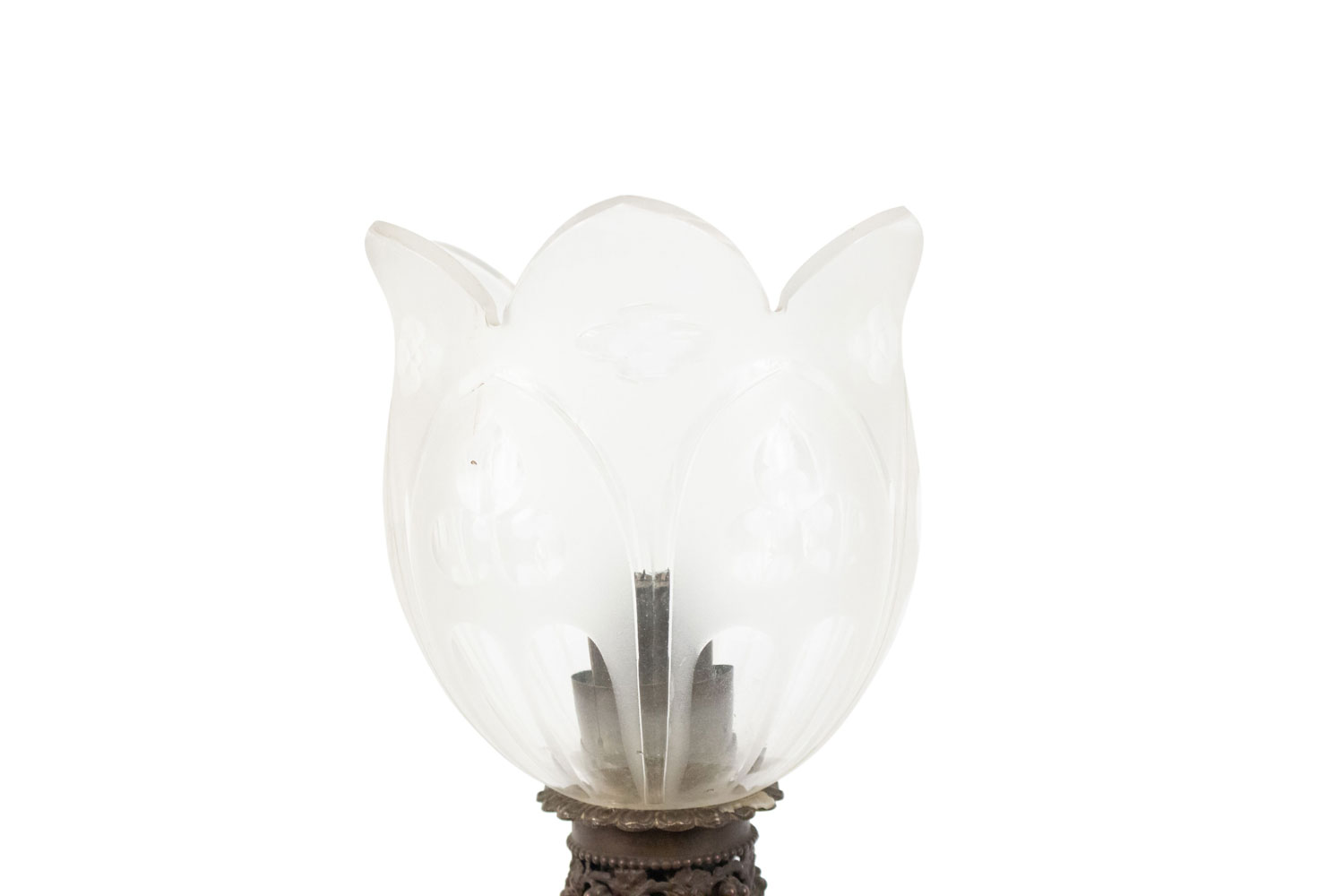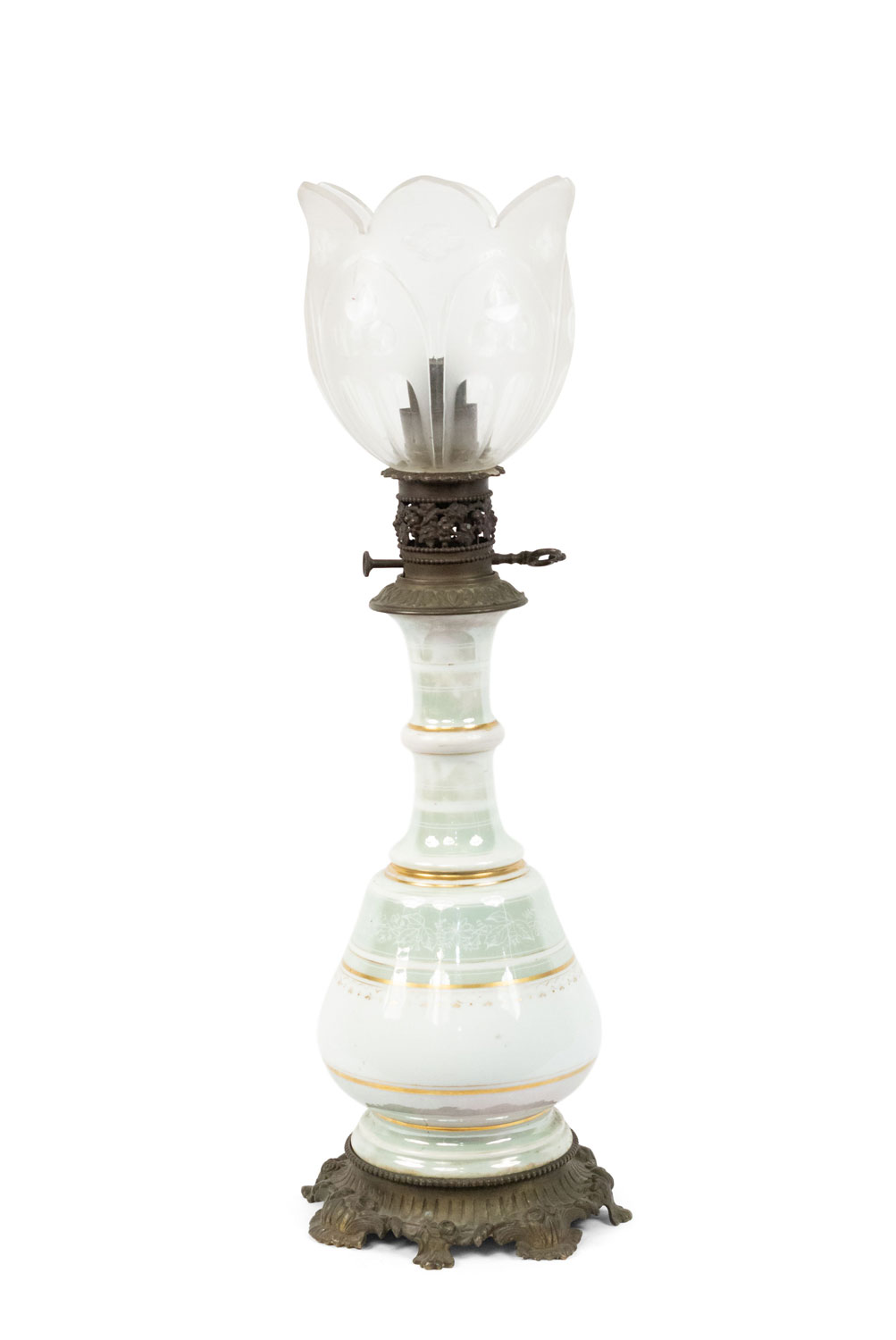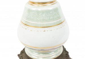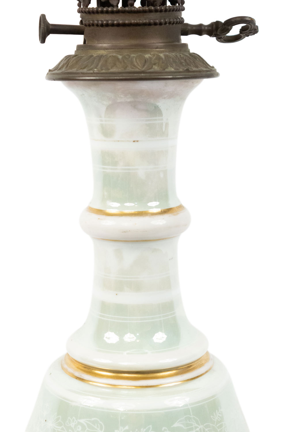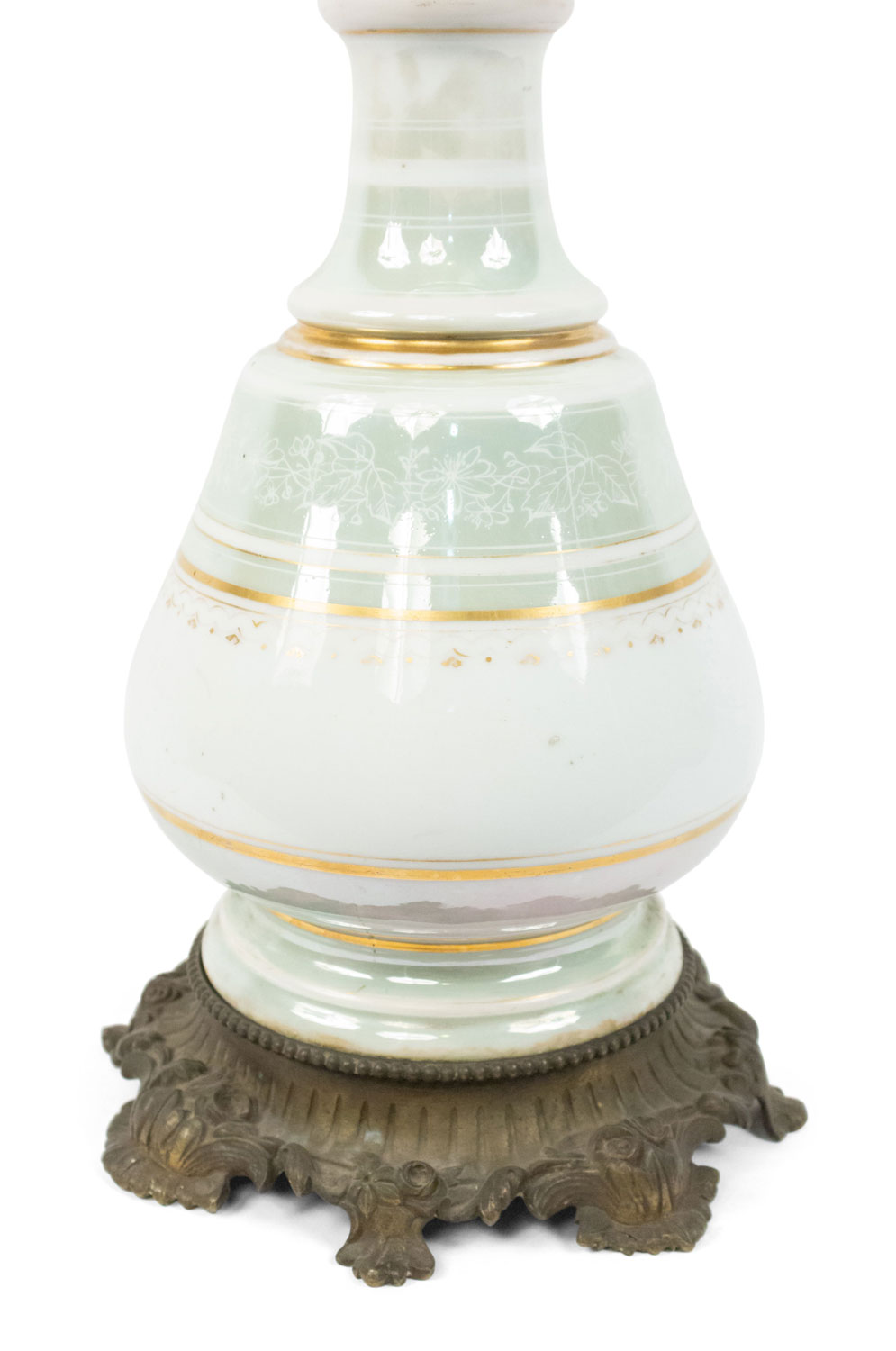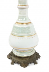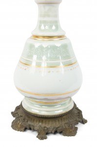 2 French Victorian celadon and white porcelain oil lamps with etched glass shade and bronze base (PRICED EACH)