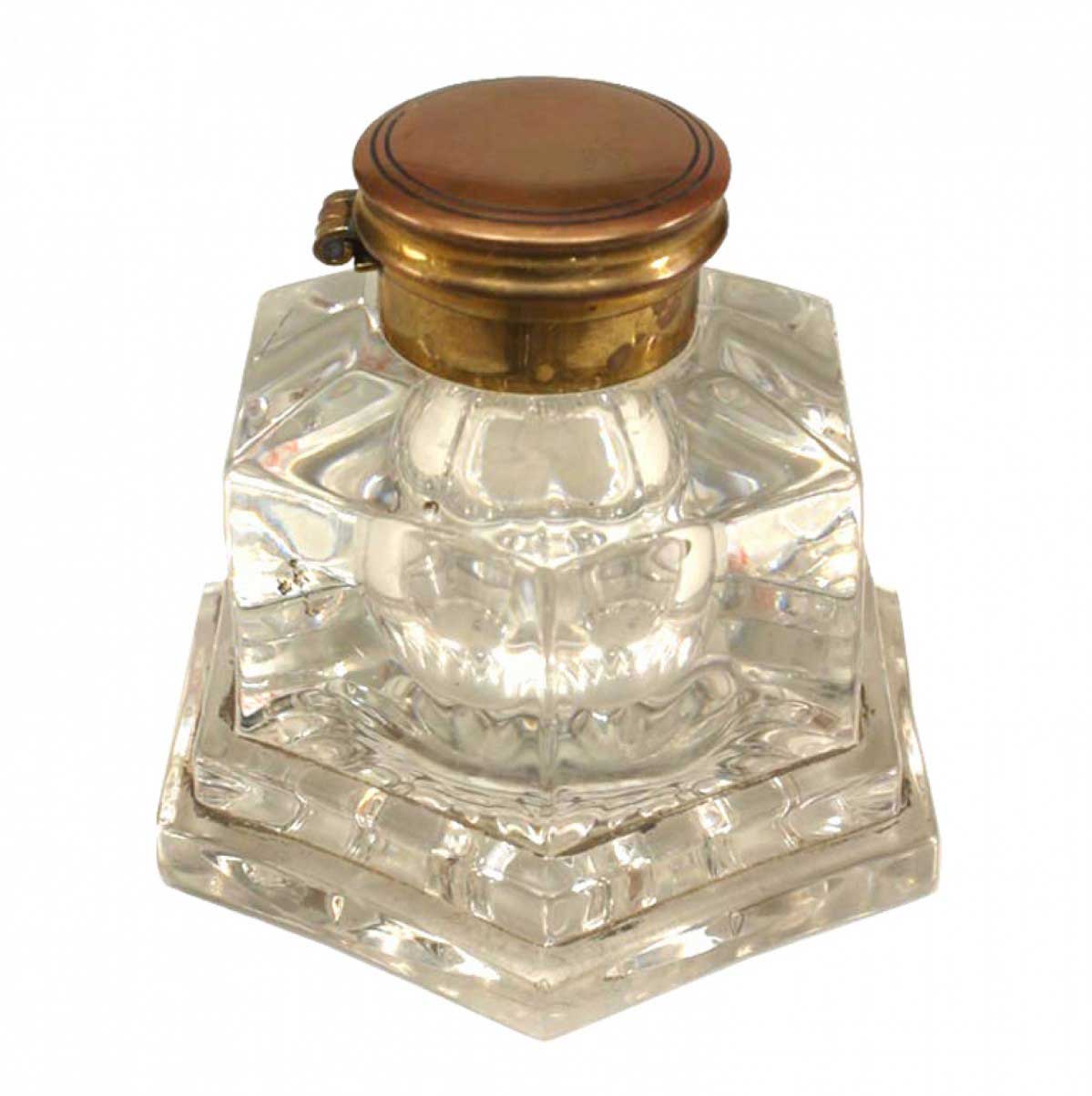 French Victorian octagonal crystal inkwell with step up base and brass cover.
