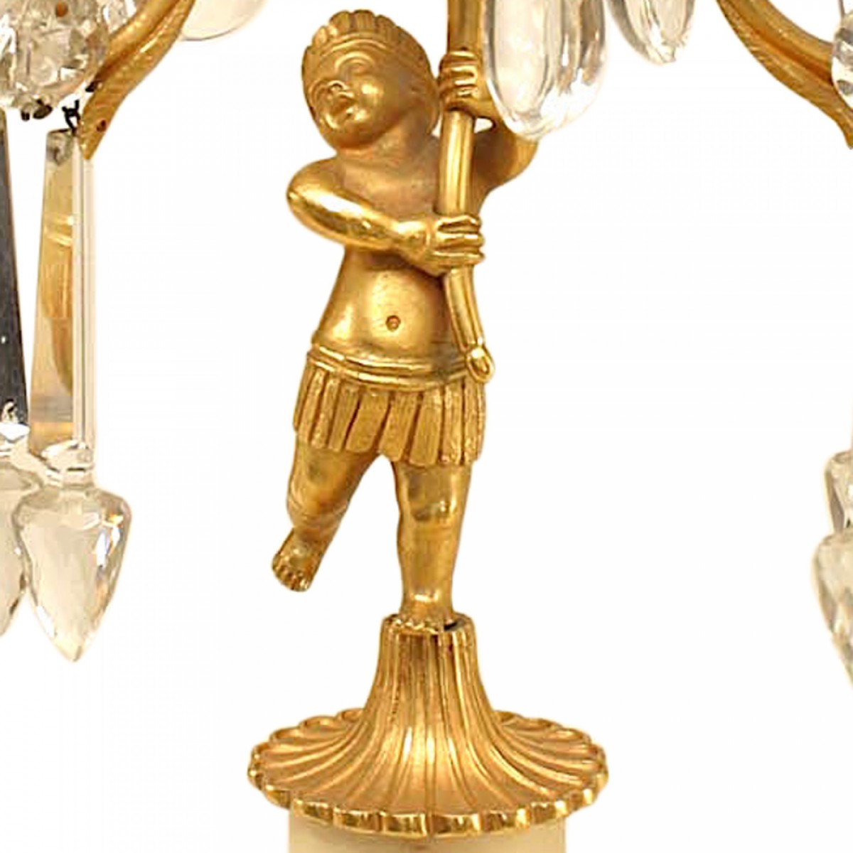 PAIR of French Victorian (19th/20th Century) 2 light gilt bronze candelabras held by a cupid figure with cut crystal drops and prisms with a white column base and finial top (PRICED AS PAIR)