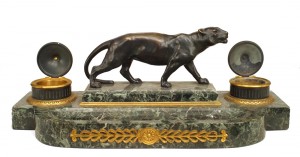French Victorian green marble double inkwell with bronze trim and centered figure of tiger.