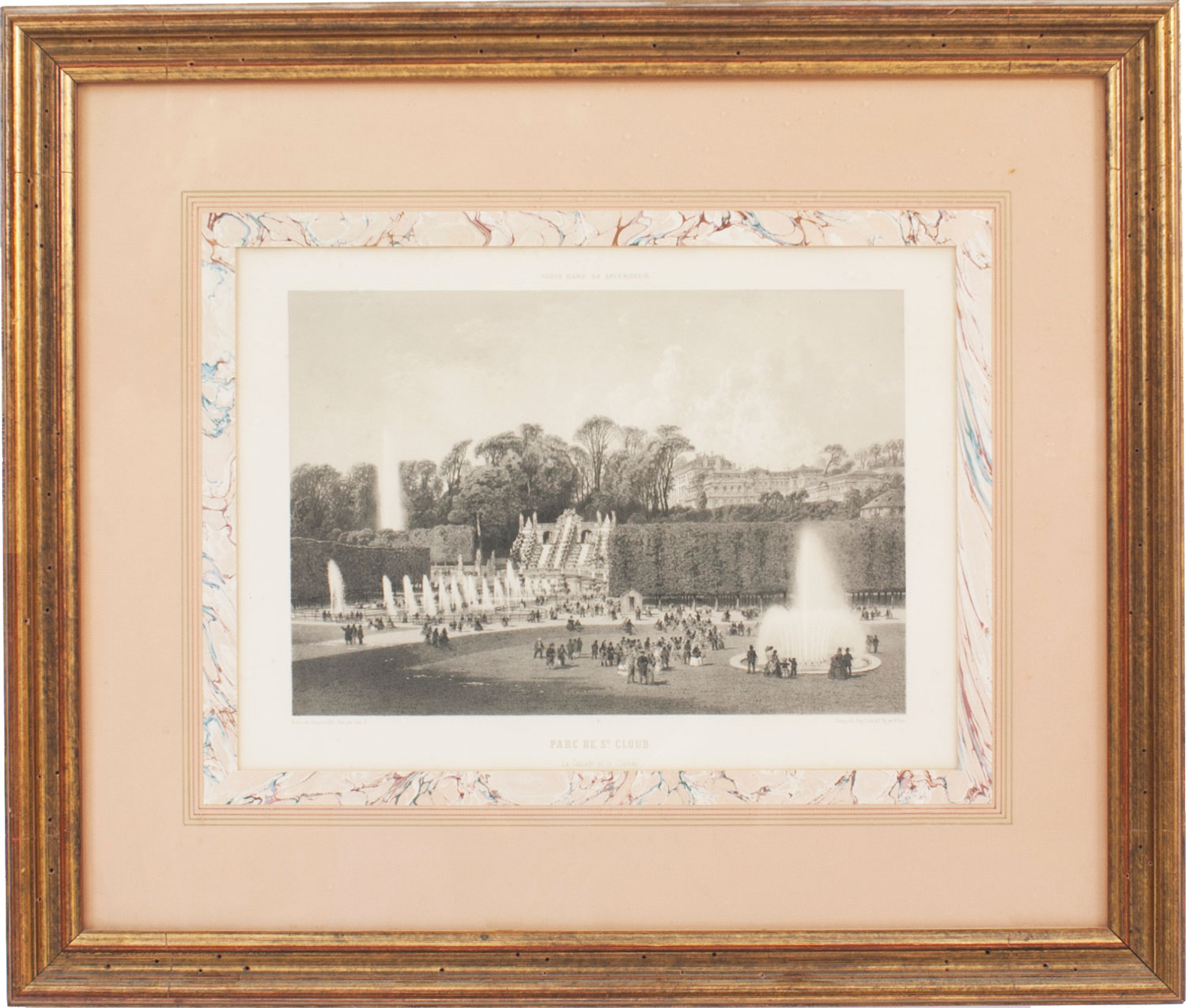 French Victorian gilt framed pink matted colored lithographs of French landmark (Park de St. Cloud) (associated pieces: CON119B, CON119C)