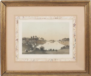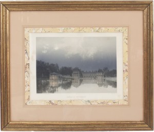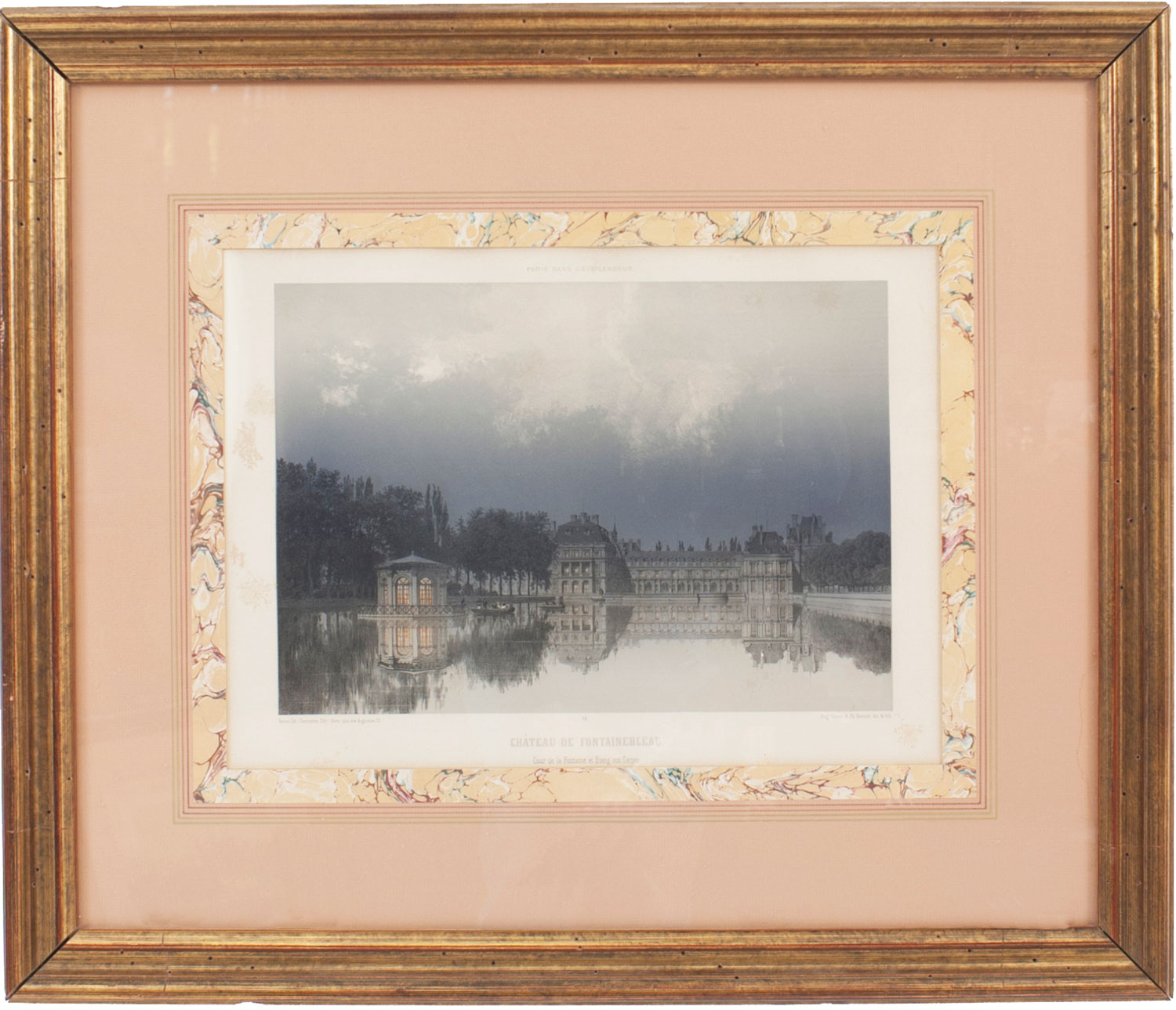 French Victorian gilt framed pink matted colored lithographs of French landmark (Chateau Fontainebleau) (associated pieces: CON119A, CON119C)