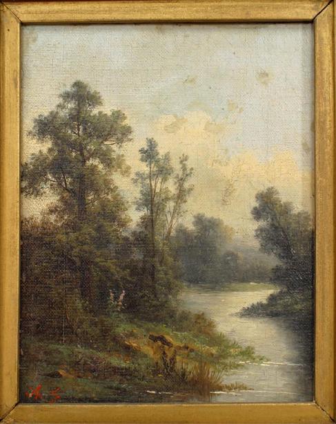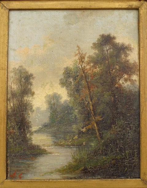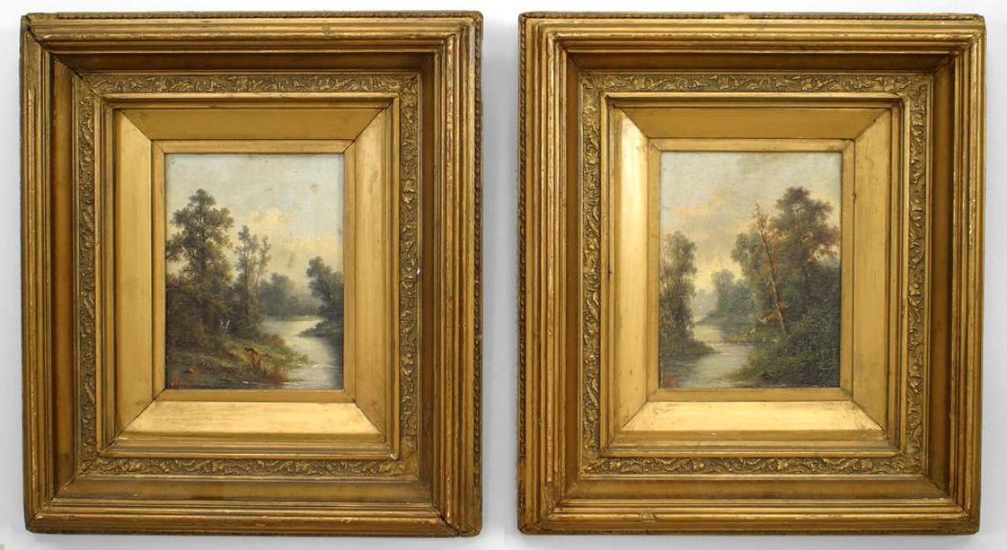 2 French Victorian carved gilt framed vertical landscape oil paintings with stream (PRICED EACH)