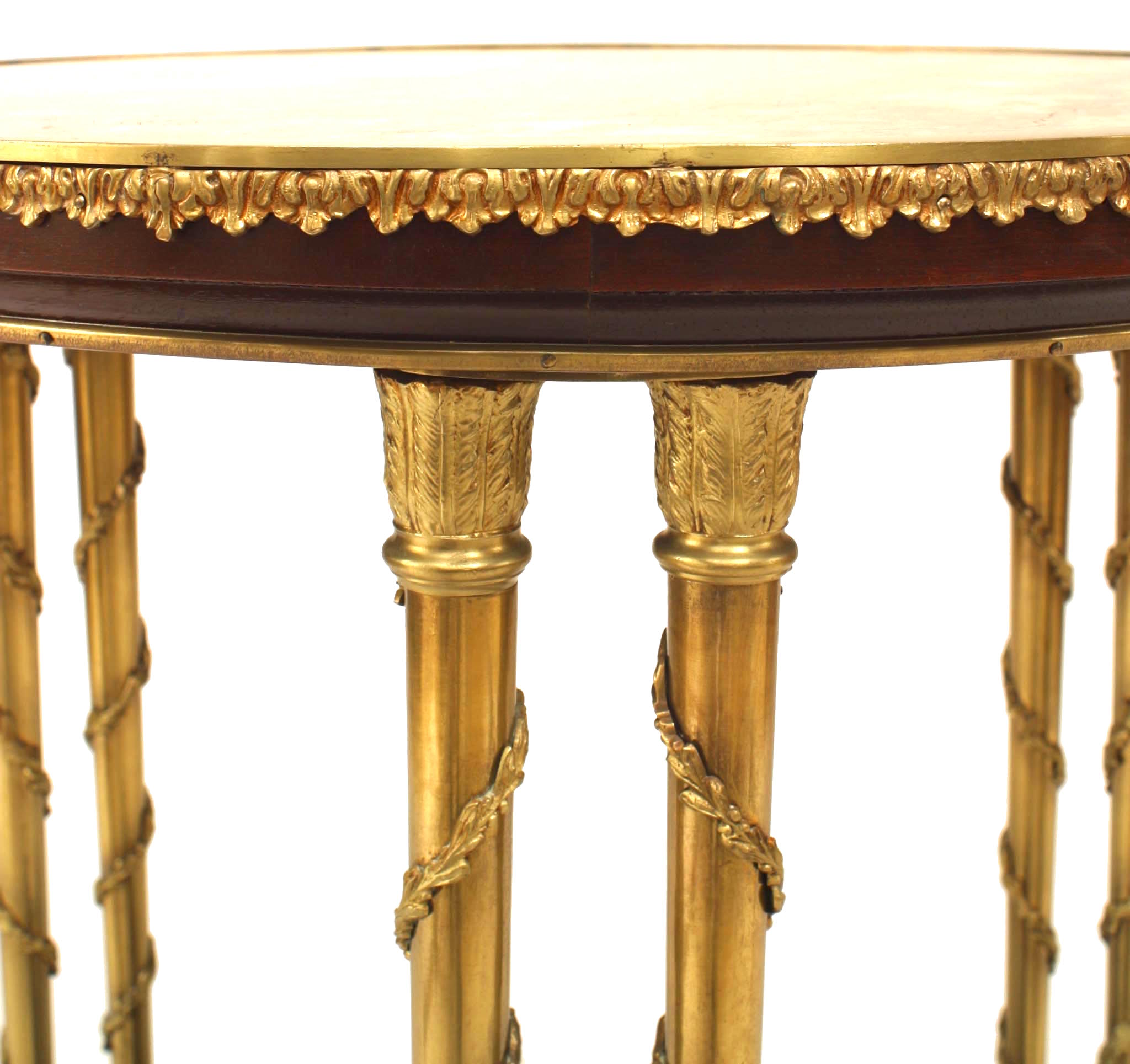 French Charles-X style mahogany and bronze end table with round inset marble top and mahogany platform shelf with double bronze and trim legs and double hoof feet.