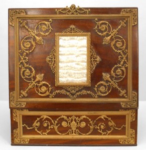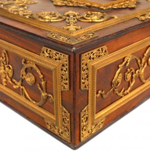 French Victorian large faux wood painted metal jewel box with bronze dore trim and top having a center frame.