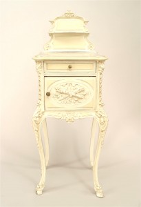 French Victorian white painted and carved bedside commode with inset marble top and a shaped back rail.