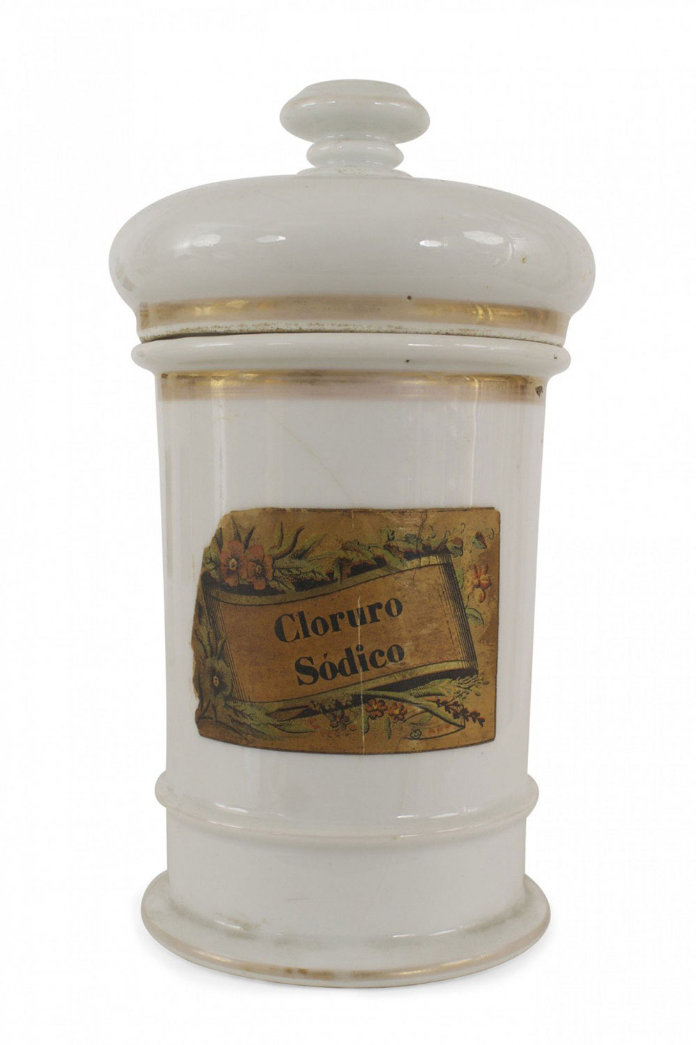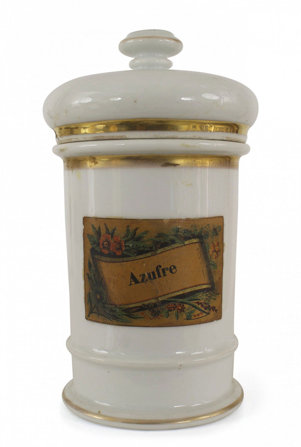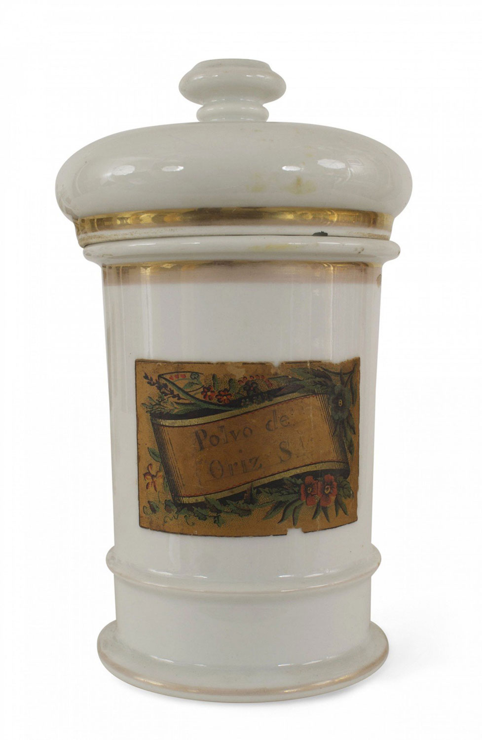 4 French Victorian white porcelain apothecary jars with decorative rectangular decal with floral trim. (PRICED EACH)